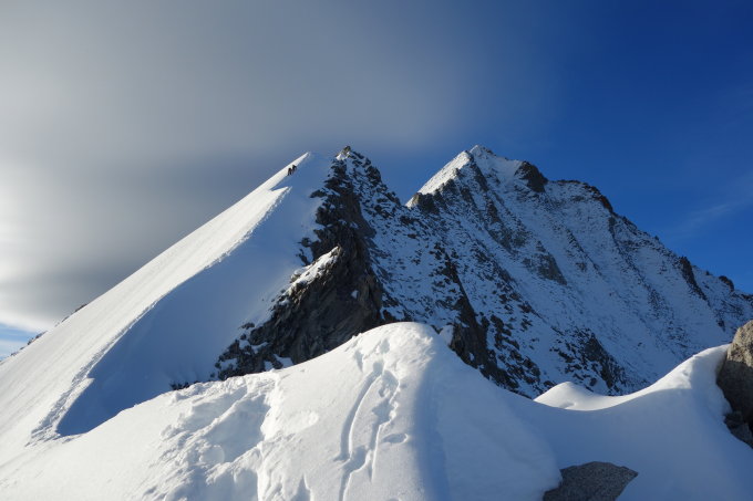 Guter Trittschnee über den Nordgrat bis zum Gipfel-Abstieg über den Westgrat, welcher auch gute Verhältnisse aufweist.