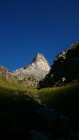 Parken am besten am Wanderparkplatz. Zu diesem führt eine schmale, asphaltierte Straße im Wald, die von der Lechtalstraße zwischen Stockach und Bach abzweigt. Ein kleines Schild weist den Weg zum Berggasthaus Hermine. Vom Parkplatz aus mit Fahrrädern in Richtung Madau. Die Straße verläuft relativ flach, so dass sich ein Fahrrad lohnt. Kurz nachdem man die zweite Brücke überquert hat, zweigt ein Weg nach rechts ins Alperschontal ab. Dieser ist nun viel steiler und nach kurzer Zeit auch nicht mehr geteert. Diesem durch mehrere Kehren bis zur hinteren Alperschonalpe (Fahrraddepot). Von dort nun nicht wie manchmal beschrieben auf die andere Talseite zur Alpe, sondern auf der orographisch rechten Seite des Tales bleiben. Dort wurde ein neuer Weg Richtung Ansbacher Hütte angelegt. Diesem folgen, bis sich auf der linken Seite ein Wiesenhang öffnet. Dort die rechte, engere Rinne wählen (kurze Kletterstelle III?). Der Rinne weiter folgen und an ihrem Ende nach links verlassen. Dort gelangt man auf einen Grasrücken, dem man nun stur weiter folgt bis auf einer Höhe von ca. 2160m auf der linken Seite der Hinkelstein sichtbar wird. Wir benötigten ca. 3,5h vom Parkplatz aus. Am Hinkelstein sind zwei kleine Podeste errichtet, auf denen bequem zwei Personen Platz finden (mit vier wirds eher kuschelig). Dort gibt es (zur Zeit!) einen Gaskocher, Gaskartuschen, ein(!) Feuerzeug (Danke an die Spender, die am Abend vorher vom Weg der bunten Steine abgestiegen sind), einen Topf, zwei Becher, einen 10 Liter Wassersack und massig Toilettenpapier. Der Hinkelstein ist zwar ganz leicht überhängend, Schutz vor Regen bietet er aber keinen. Ein paar im Fels angebrachte Bohrhaken lassen jedoch eine Plane über die Liegefläche spannen. Plane und Schnüre liegen ebenfalls in den Tonnen bereit. Wenn man sicher gehen will ein warmes Abendessen zu genießen, nimmt man besser eine Kartusche und ein Feuerzeug mit. In der direkten Nähe (40-50m) gibt es einen Bachlauf, der auch jetzt, Ende August, noch mehr als genug Wasser führte.