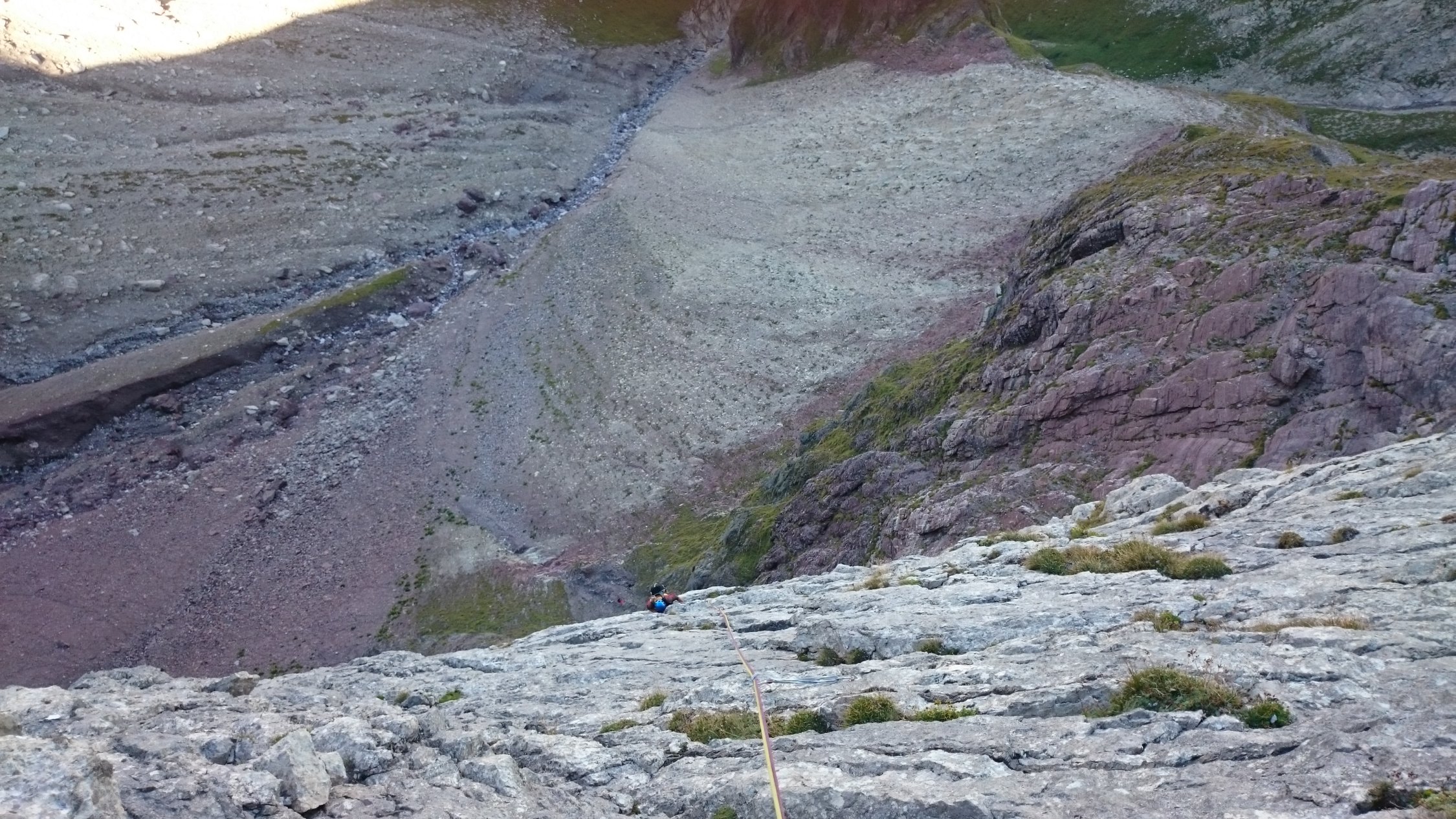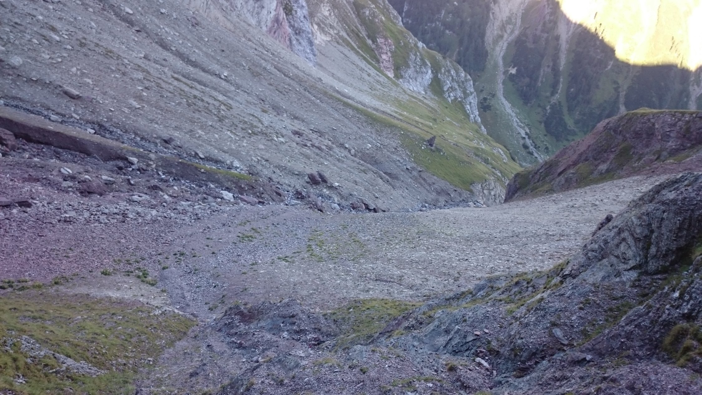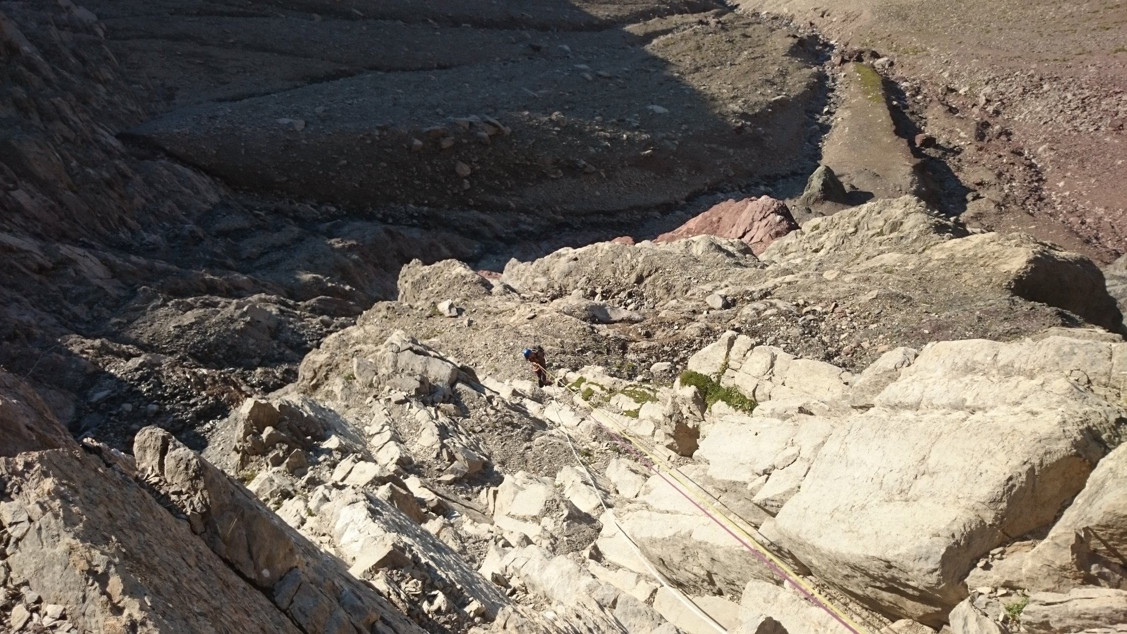 Hier wählten wir die Variante durchs Kar, bzw. den Kessel zwischen Roter Platte und Rotspitze. Dazu steigt man zuerst am Grat entlang Richtung Gipfel auf. Eine erste steile Kaminrinne lässt man rechts liegen und steigt weiter, bis (~2780m) sich ein sanfterer Geröllhang nach rechts öffnet. Diesem folgt man nun immer bis er in ein (oben trockenes) Bachbett mündet (weiter unten führte es noch immer Wasser). In diesem kann man relativ bequem absteigen, bis man zu einer Steilstufe gelangt. Dort wendet man sich nach links und durchquert eine bisschen schottrige, breitere Rinne. Dabei überwindet man 2-3 ein Meter hohe Felskanten, bleibt aber auf gleicher Höhe. Auf einer letzten Kante weist ein kleiner Steinmann auf die erste Abseilstelle hin (2 BH verbunden durch Reepschnur, Abseilkarabiner). Orographisch links haltend wird hier abgeseilt, bis man auf ein schottriges Band gelangt. Mit einem 60m Doppelseil würde man direkt zur nächsten Abseilstelle gelangen. Hier wieder 2 Bohrhaken, verbunden durch ein altes Seil. Ein Abseilkarabiner ist vorhanden. An diesem abseilend erreicht man nach ca. 25m wieder ein Schotterband, dem man linkshaltend folgt, wieder eine Bachrinne überquert und danach auf ein Fixseil trifft, mit dessen Hilfe man über die nächsten kleineren Stufen absteigt. Von dort sind wir weiter nach links rausgequert und dem Geröllhang, bzw. den Bachläufen zum Hinkelstein gefolgt.