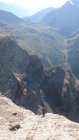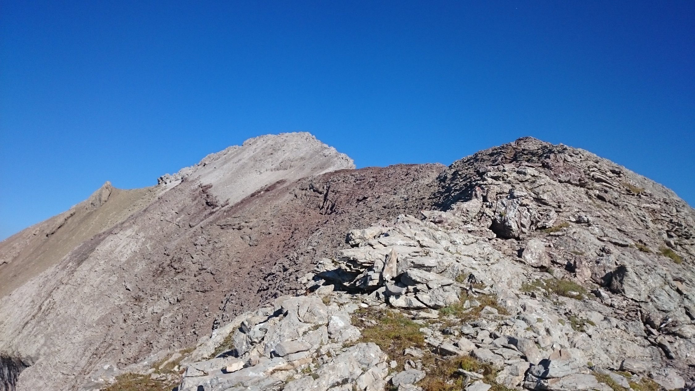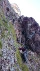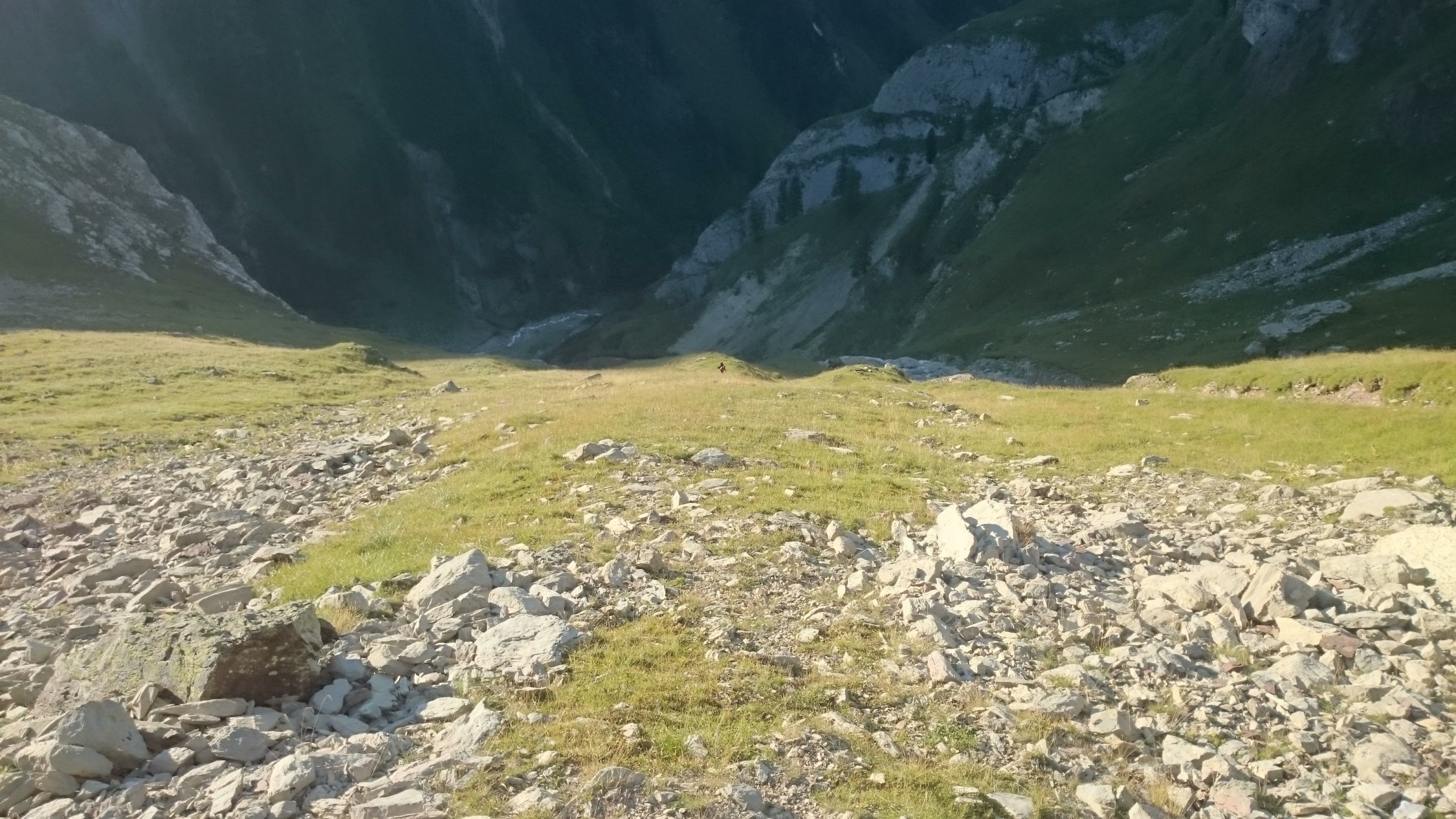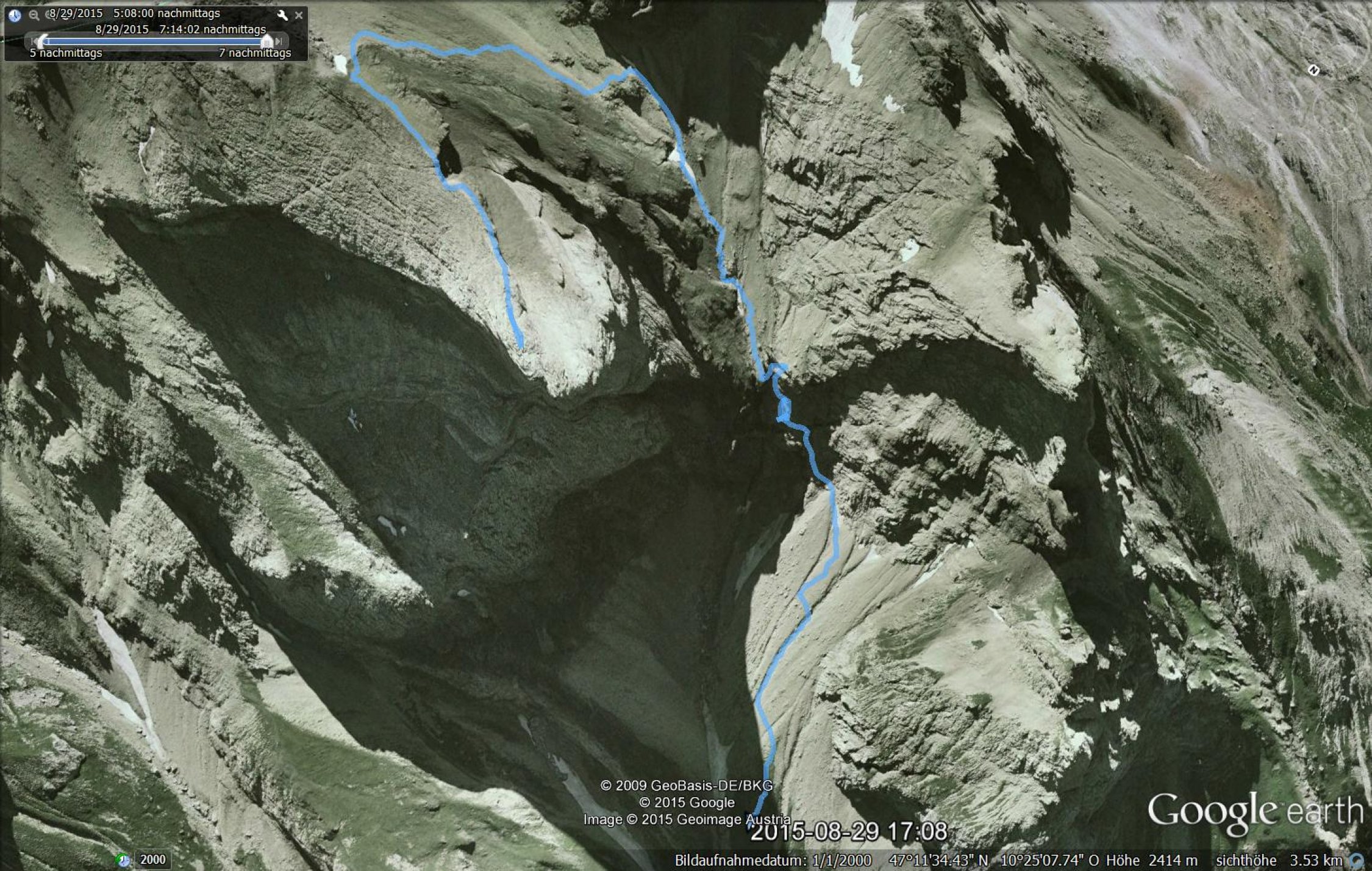 Hier wählten wir die Variante durchs Kar, bzw. den Kessel zwischen Roter Platte und Rotspitze. Dazu steigt man zuerst am Grat entlang Richtung Gipfel auf. Eine erste steile Kaminrinne lässt man rechts liegen und steigt weiter, bis (~2780m) sich ein sanfterer Geröllhang nach rechts öffnet. Diesem folgt man nun immer bis er in ein (oben trockenes) Bachbett mündet (weiter unten führte es noch immer Wasser). In diesem kann man relativ bequem absteigen, bis man zu einer Steilstufe gelangt. Dort wendet man sich nach links und durchquert eine bisschen schottrige, breitere Rinne. Dabei überwindet man 2-3 ein Meter hohe Felskanten, bleibt aber auf gleicher Höhe. Auf einer letzten Kante weist ein kleiner Steinmann auf die erste Abseilstelle hin (2 BH verbunden durch Reepschnur, Abseilkarabiner). Orographisch links haltend wird hier abgeseilt, bis man auf ein schottriges Band gelangt. Mit einem 60m Doppelseil würde man direkt zur nächsten Abseilstelle gelangen. Hier wieder 2 Bohrhaken, verbunden durch ein altes Seil. Ein Abseilkarabiner ist vorhanden. An diesem abseilend erreicht man nach ca. 25m wieder ein Schotterband, dem man linkshaltend folgt, wieder eine Bachrinne überquert und danach auf ein Fixseil trifft, mit dessen Hilfe man über die nächsten kleineren Stufen absteigt. Von dort sind wir weiter nach links rausgequert und dem Geröllhang, bzw. den Bachläufen zum Hinkelstein gefolgt.