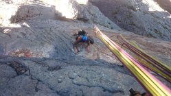 Zwei Jungs waren vor uns eingestiegen, hatten aber wohl in der zweiten 7er Länge einen bösen Sturz und sind infolgedessen dann wieder abgeseilt, bzw. den Quergang zurückgeklettert. Ist mit ein wenig Aufwand also noch zu machen, während die oberen Seillängen abzuseilen sicher keinen Spaß mehr macht. Und trotz der Steilheit bietet der Fels hier genügend "Rauhigkeit", um hier den einen oder anderen Verhänger zu produzieren.