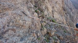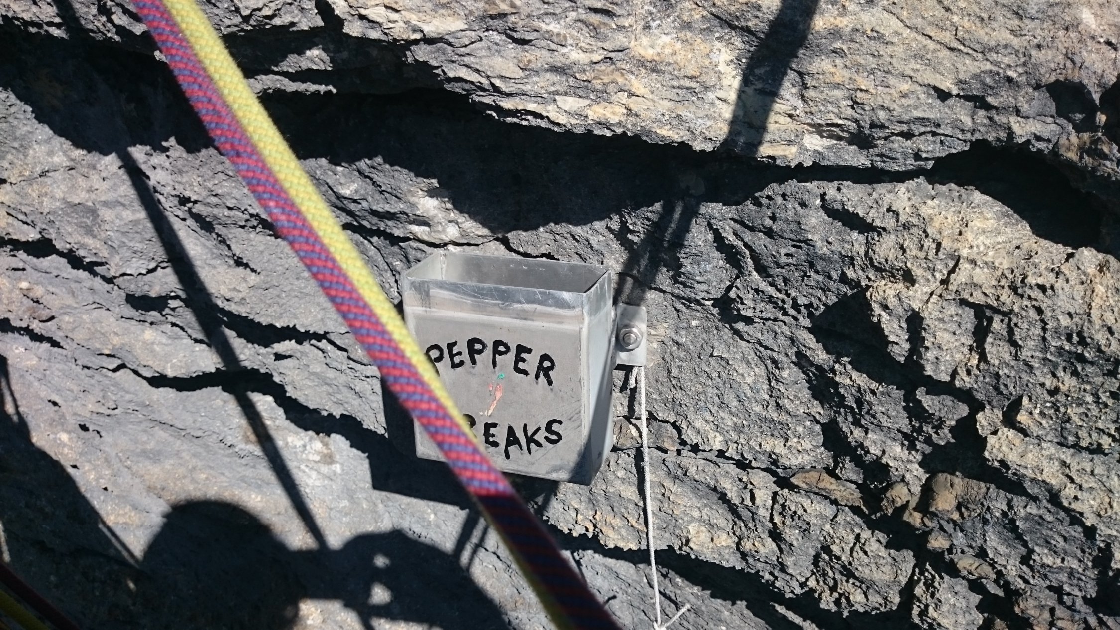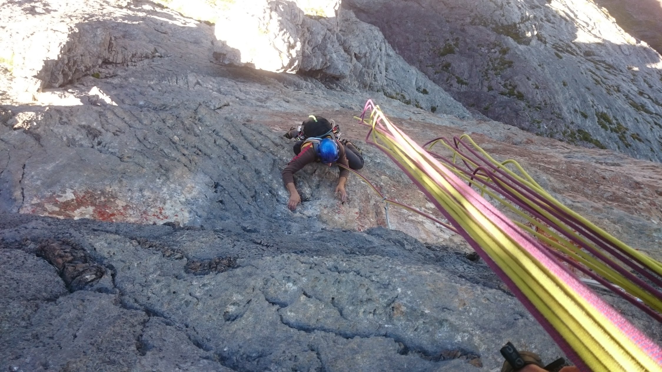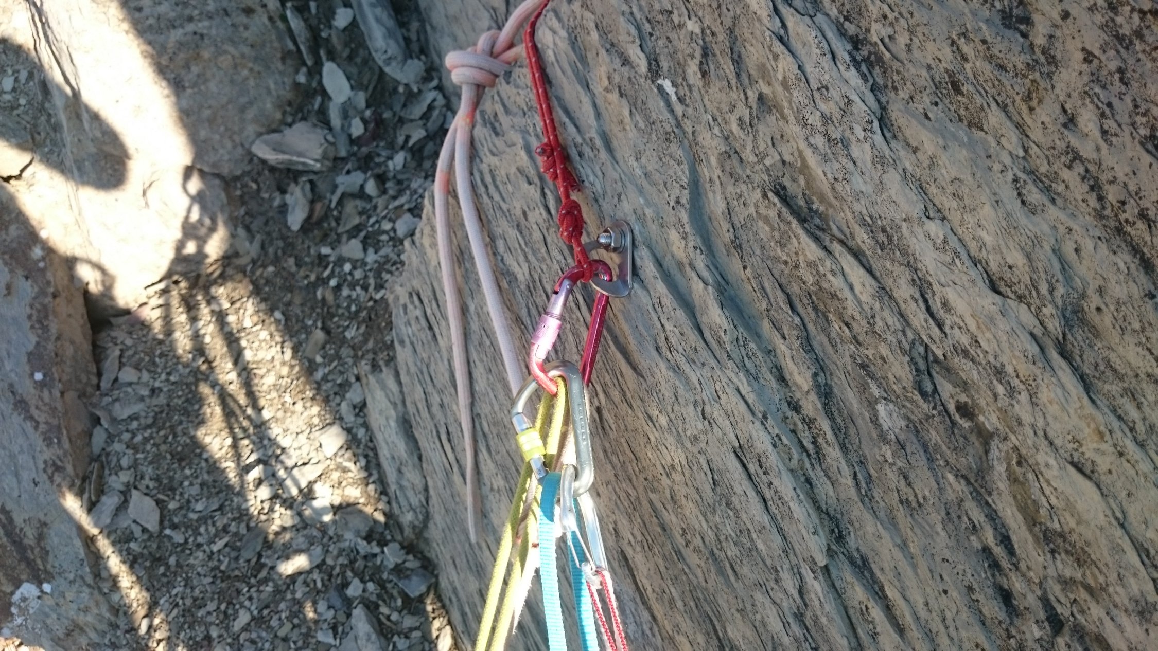 Insgesamt stecken in der Route nicht zu viele Haken, die Stellen müssen obligat geklettert werden (7+?). An Expressen hatten wir 11 Stück dabei, die wir nie alle verbauen konnten, 8 oder 9 hätten es auch getan. Ab und zu können Friends gelegt werden. Wir hatten BD C4 bis Größe 2 (der gelbe) dabei. Einmal ging auch ein C3 Gr.0, aber notwendigerweise mitschleppen muss man ihn nicht. Keile hatten wir dabei, aber nie sinnvoll verwenden können.