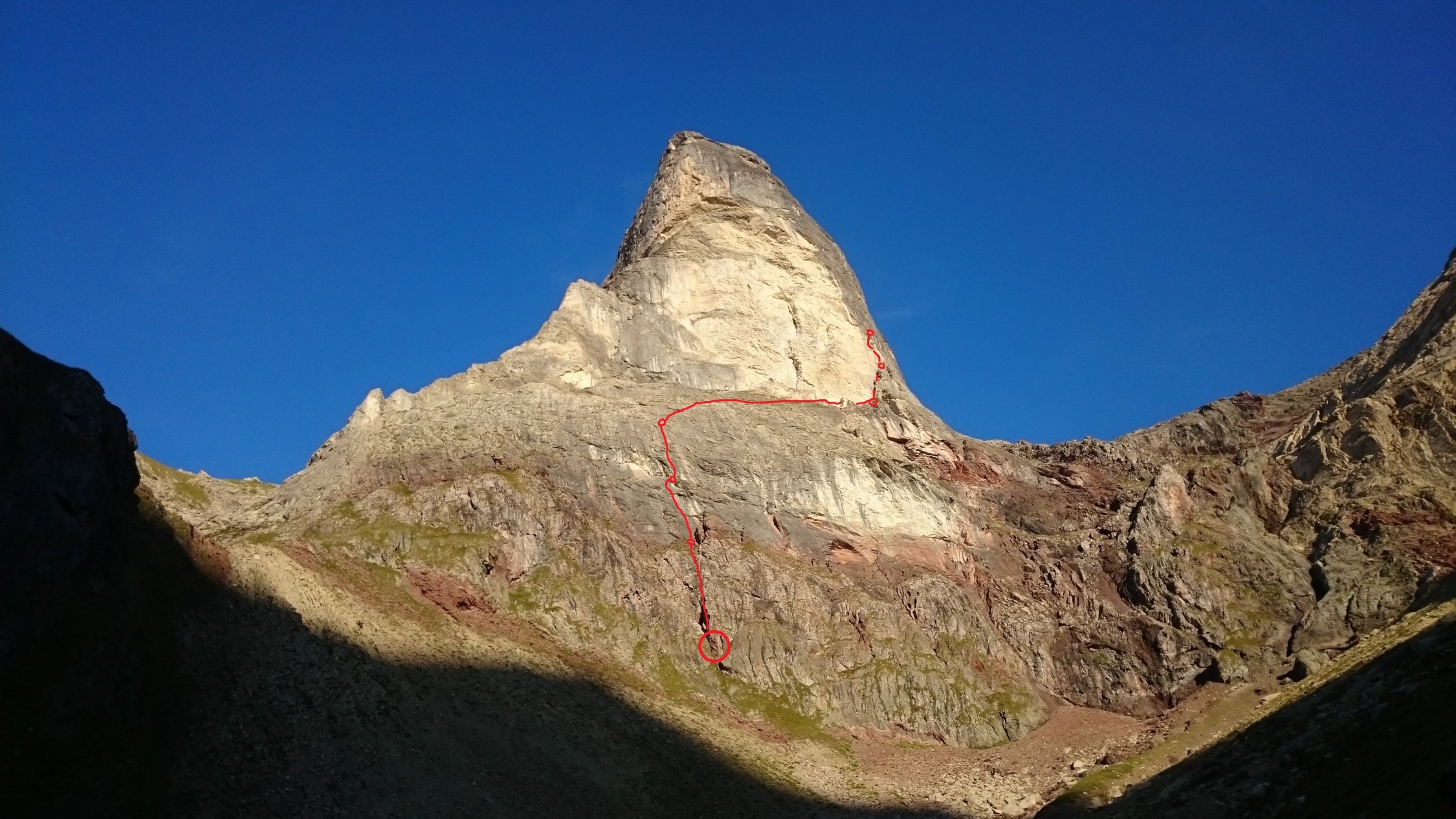 Der Weg zum Einstieg ist offensichtlich, es geht weglos durch zwei Bachrinnen, auf den roten Pfeiler im linken Teil des Vorbaus zu (siehe Bilder). Dort durch mergeliges Gestein einer Rinne folgen. Der erste Stand befindet sich ein wenig versteckt und exponiert rechts der Rinne über einer Stufe.