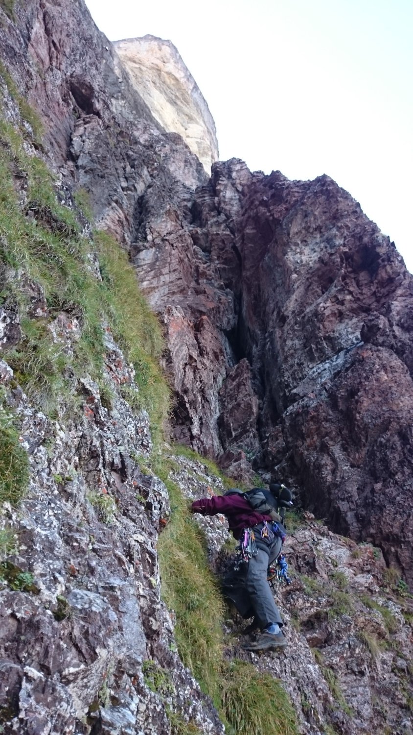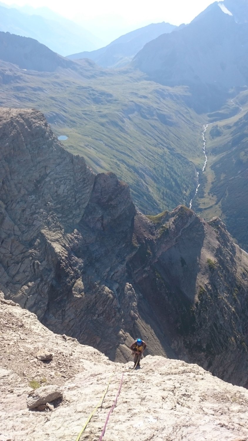 Im Gesamten eine super schöne Tour in toller alpiner Umgebung. Der Fels ist beeindruckend kompakt im Vergleich zu dem mergelhaltigen Schutt ringsherum. Die Schlüsselstellen sind recht gut abgesichert, abseits davon können Stürze schmerzhaft werden. Die Wegfindung ist nicht immer ganz leicht, da die Hakenlaschen in ihrer Farbe dem Gestein sehr ähneln und die Abstände teilweise die 5m gut überschreiten. Für noch mehr Genuss hätte die Seillängen vielleicht noch etwas in ihrer Länge reduziert werden können, dann würde man sich einiges an Seilzug ersparen.