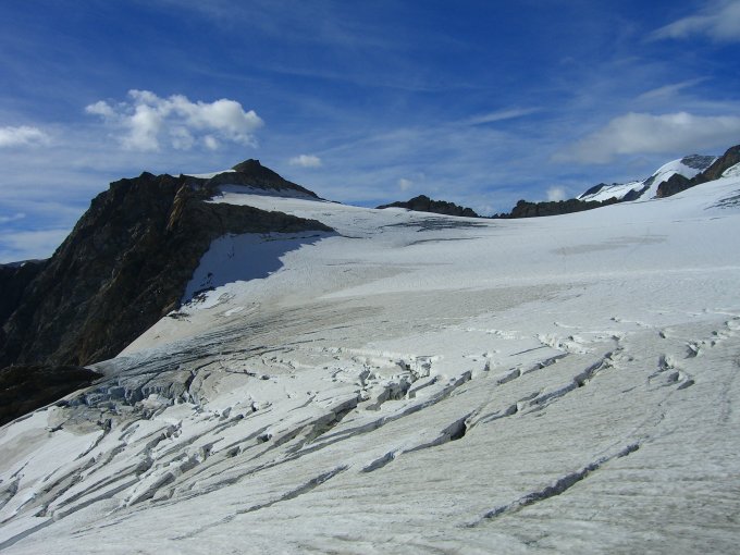 Auf dem Gauligletscher nicht bis zu den von weitem sichtbaren Steinmänner auf dem Plateau bei etwa 2520 m absteigen, sondern vorher auf etwa 2550 m den Gletscher Richtung O verlassen.