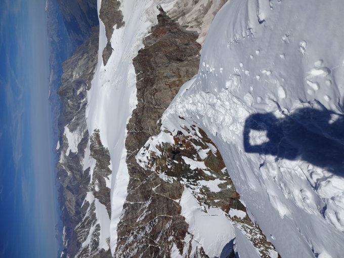 Der Abstieg über die SW-Flanke ist im oberen Teil eisig mit einer geringen Neuschneeauflage und steil, so dass wir über den Westgrat wieder abgestiegen sind.