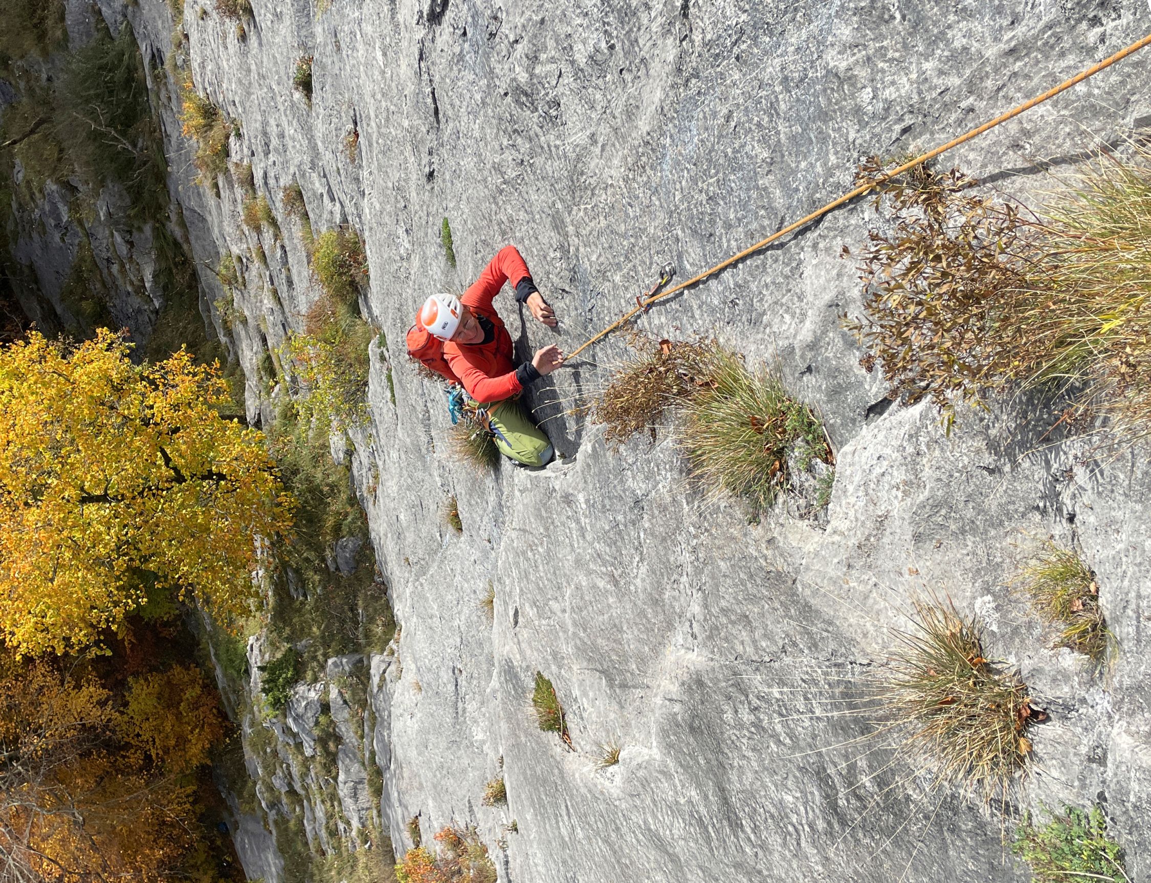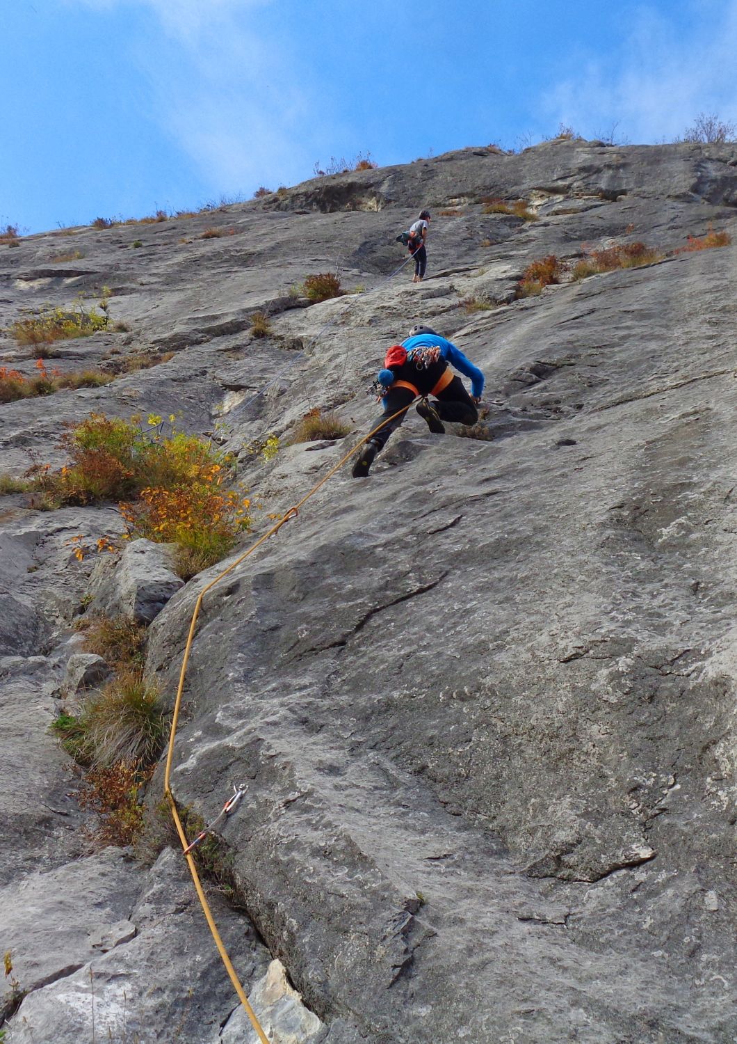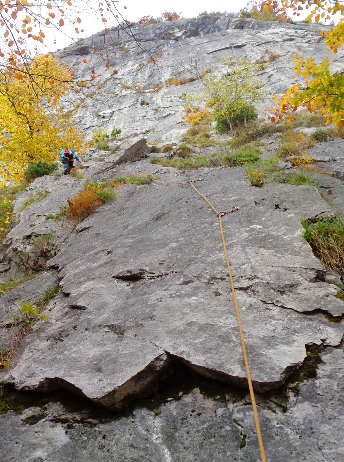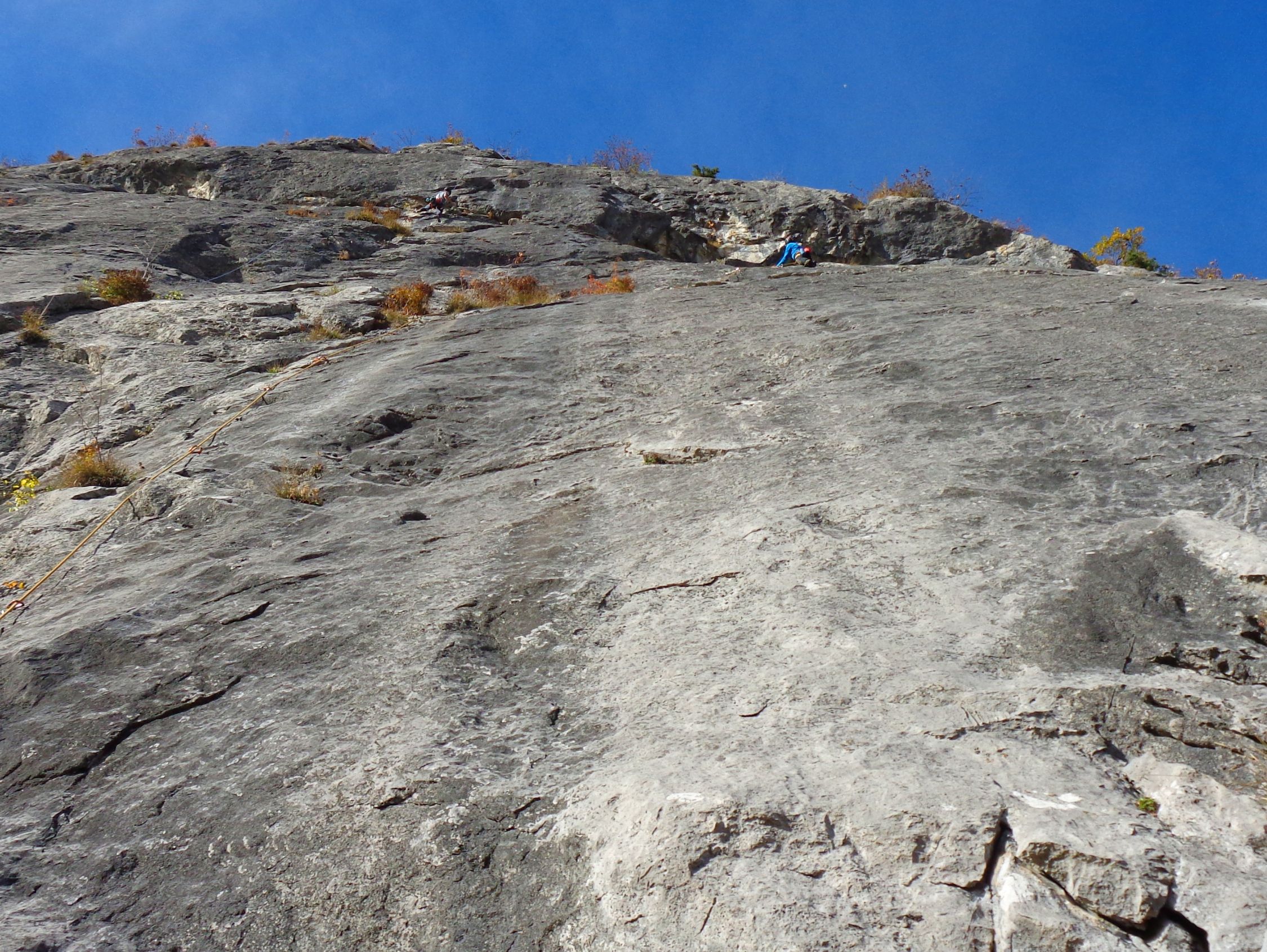 SL3 (6b+(+), 40 m): Zunächst etwas nach L um den Plattenpanzer (man steht einmal recht balancierend auf einem (festen!) Graspolster. Hier ist die geniale Schlitz/Lochzone der Planggwand (zieht sich quer durch die Wand, verrückte Strukturen, die Weiterkommen in scheinbar glatten Platten ermöglichen). Ein paar der Löcher sind von Botanik besetzt, die aber dann abnimmt und ganz verschwindet, und dann geht es 15-20 m spektakulär durch den Plattenpanzer. Die Kletterei ist steil (keine typische Reibungsplatte) und hat kleine Leisten und Sloper, und praktisch immer klare Trittbeulen/wellen. An der „crux“ muss man mal eine kleine scharfe Leiste mit der richtigen Hand erwischen und festhalten. Am zweitletzten Bh muss man eine gute Linie finden (eher in einem R-Bogen drumrum) und auch am Schluss ist man erst am Stand, wenn man wirklich am Stand ist. Die Bh Abstände im letzten Abschnitt sind etwas größer (eher 4 m) als unten (eher 3 m).