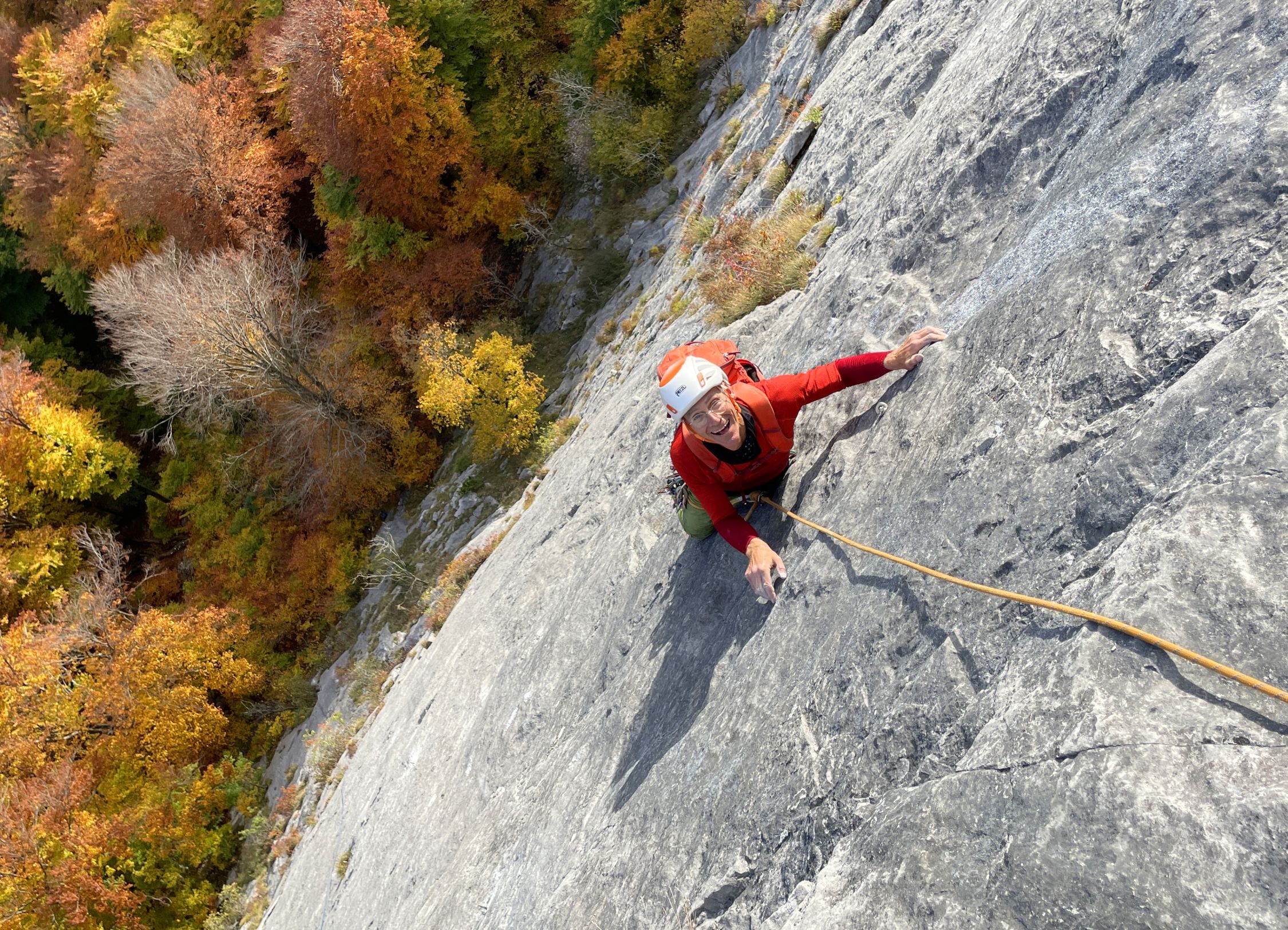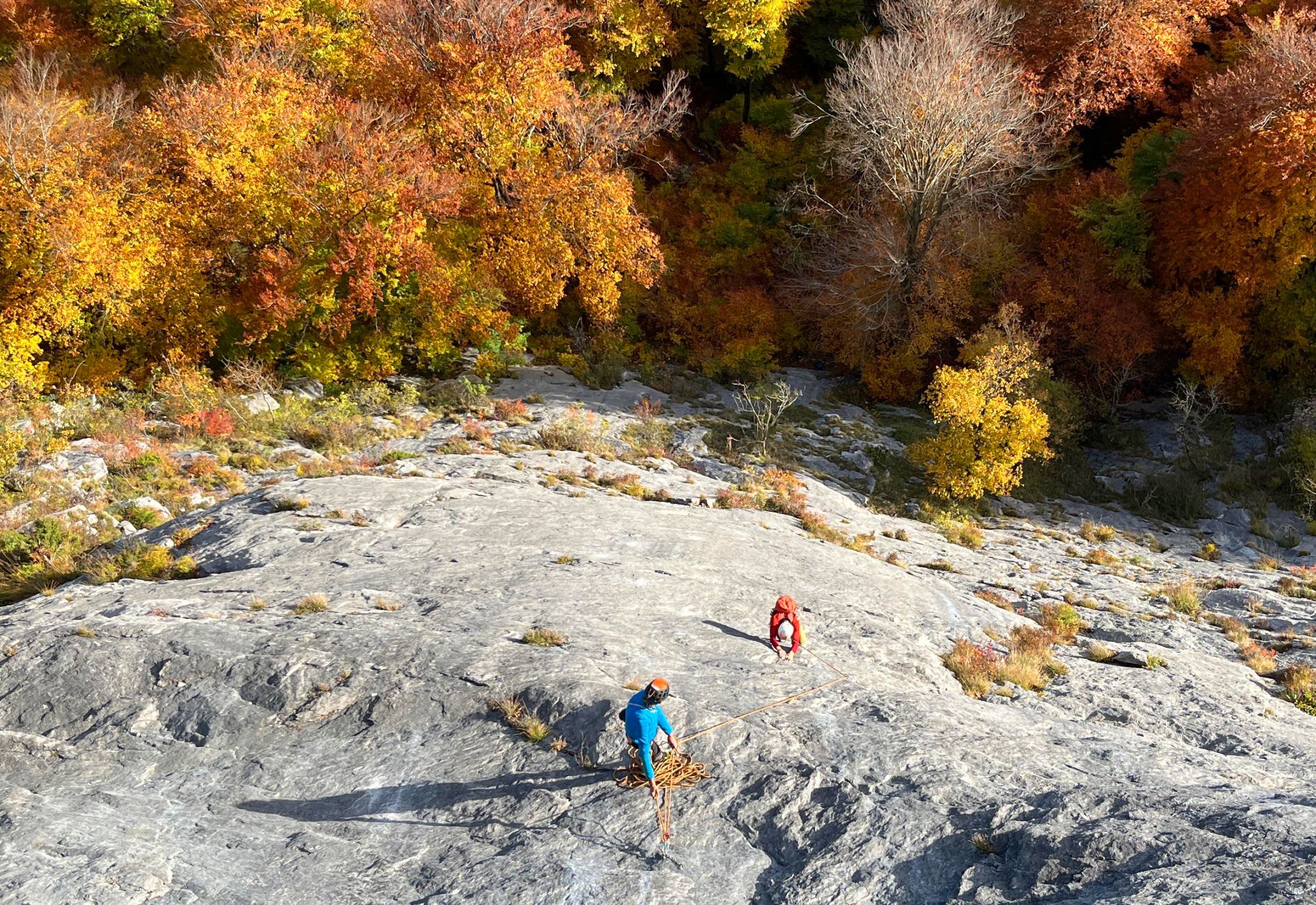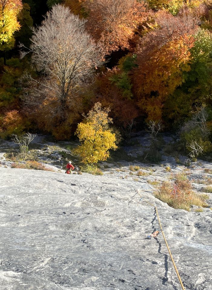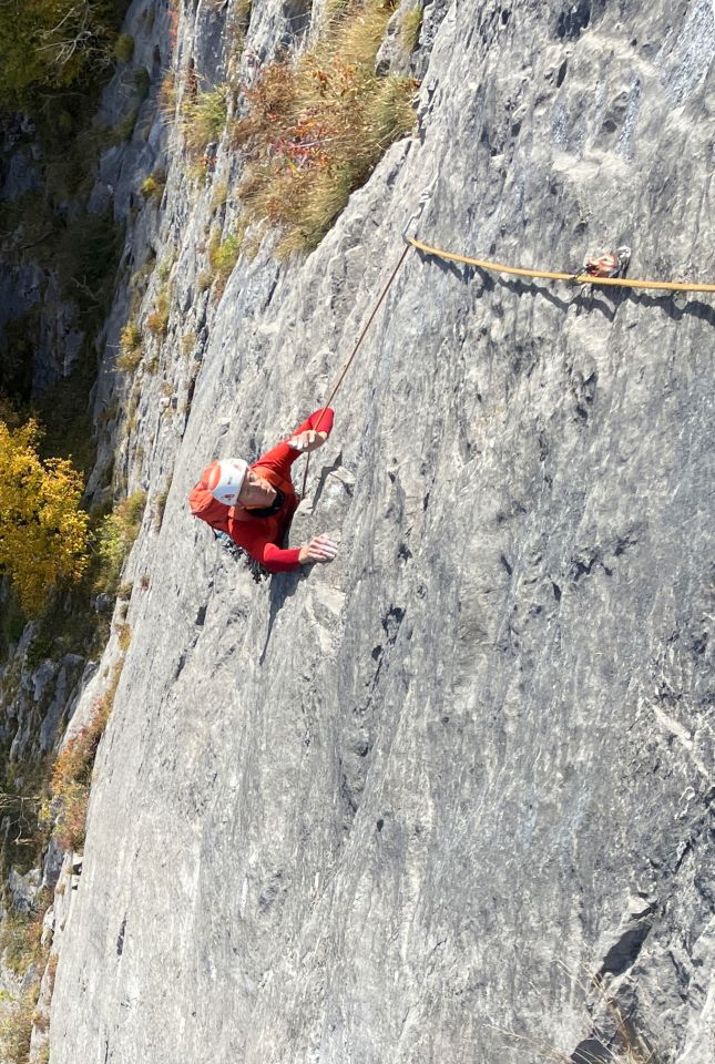 SL3 (6b+(+), 40 m): Zunächst etwas nach L um den Plattenpanzer (man steht einmal recht balancierend auf einem (festen!) Graspolster. Hier ist die geniale Schlitz/Lochzone der Planggwand (zieht sich quer durch die Wand, verrückte Strukturen, die Weiterkommen in scheinbar glatten Platten ermöglichen). Ein paar der Löcher sind von Botanik besetzt, die aber dann abnimmt und ganz verschwindet, und dann geht es 15-20 m spektakulär durch den Plattenpanzer. Die Kletterei ist steil (keine typische Reibungsplatte) und hat kleine Leisten und Sloper, und praktisch immer klare Trittbeulen/wellen. An der „crux“ muss man mal eine kleine scharfe Leiste mit der richtigen Hand erwischen und festhalten. Am zweitletzten Bh muss man eine gute Linie finden (eher in einem R-Bogen drumrum) und auch am Schluss ist man erst am Stand, wenn man wirklich am Stand ist. Die Bh Abstände im letzten Abschnitt sind etwas größer (eher 4 m) als unten (eher 3 m).