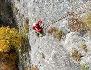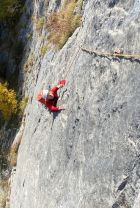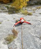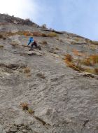 SL2 (6a+, 25 m): Man steigt hoch zum Plattenpanzer und querst dann schön an einem Schlitz nach L. Man gewinnt, dann in einer Art Verschneidung am Rand des Plattenpanzers Höhe. Die Schwierigkeiten nehmen nach oben zu. Crux ist eine kleine Rissverschneidung, in der man sich von L her kommend etablieren muss (in der R Verschneidungswand stehen, um gut in den Riss zu kommen). Gläubige Menschen tun sich da leichter (glauben, dass die beiden Füsse beim Griff in den Riss halten…). Ungläubige können das auch ausspreizen, um das böse (runterfallen) zu vermeiden.