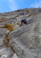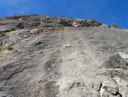 SL1 (6a, 30 m): Typisch Planggwand geht es mit buckligen Platten los, die schwer aussehen, aber oft sehr gute Seitschuppen haben. Man klettert R der Bh-Linie viel leichter als es aussieht bis Bh2. Dann kommt die Crux der SL nach R oben (echte Platte, 2-3 MOves) Danach wird es griffig und zunehmend leichter auf eine Art Band vor dem steilen Plattenpanzer.