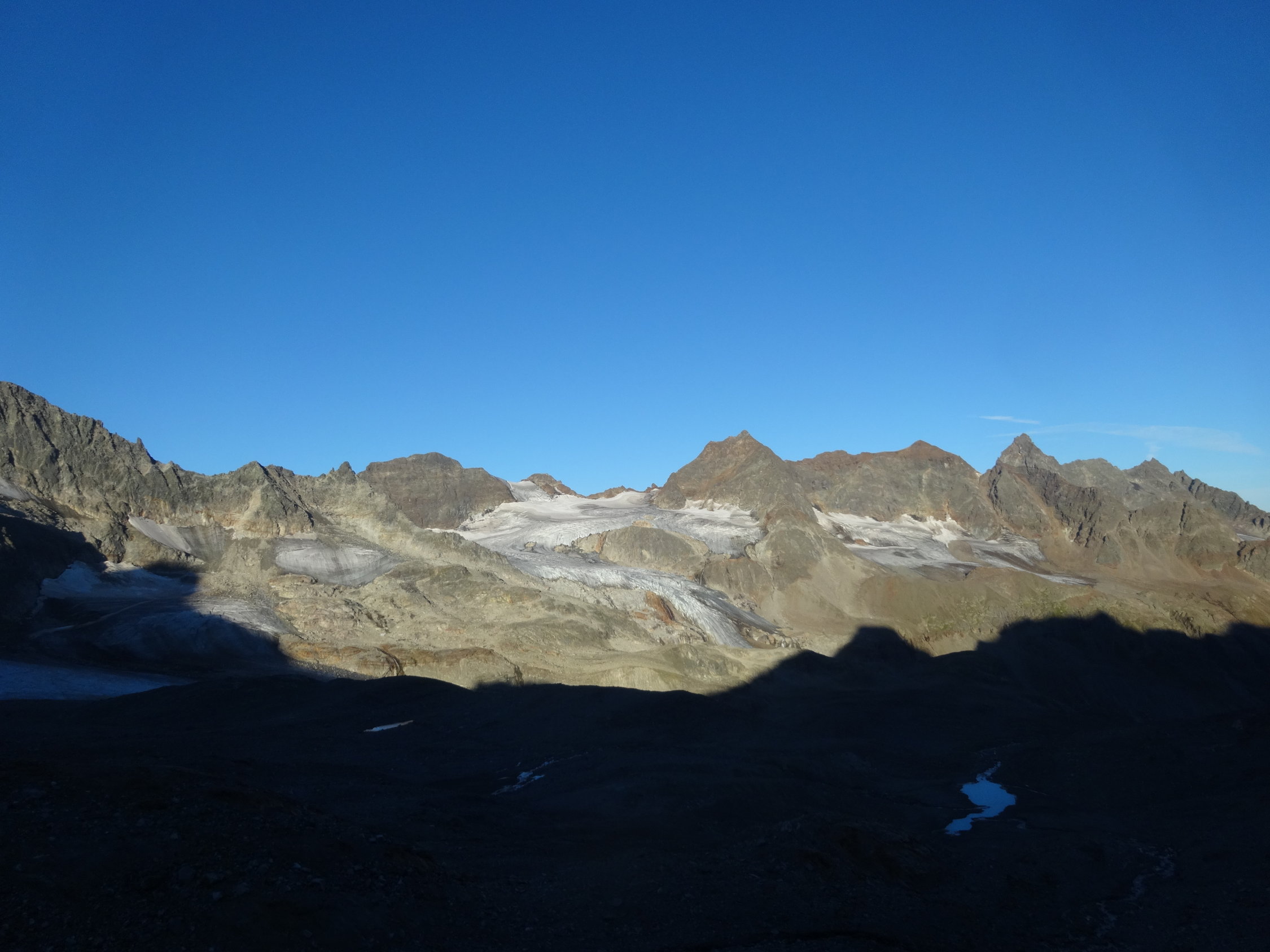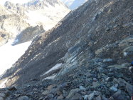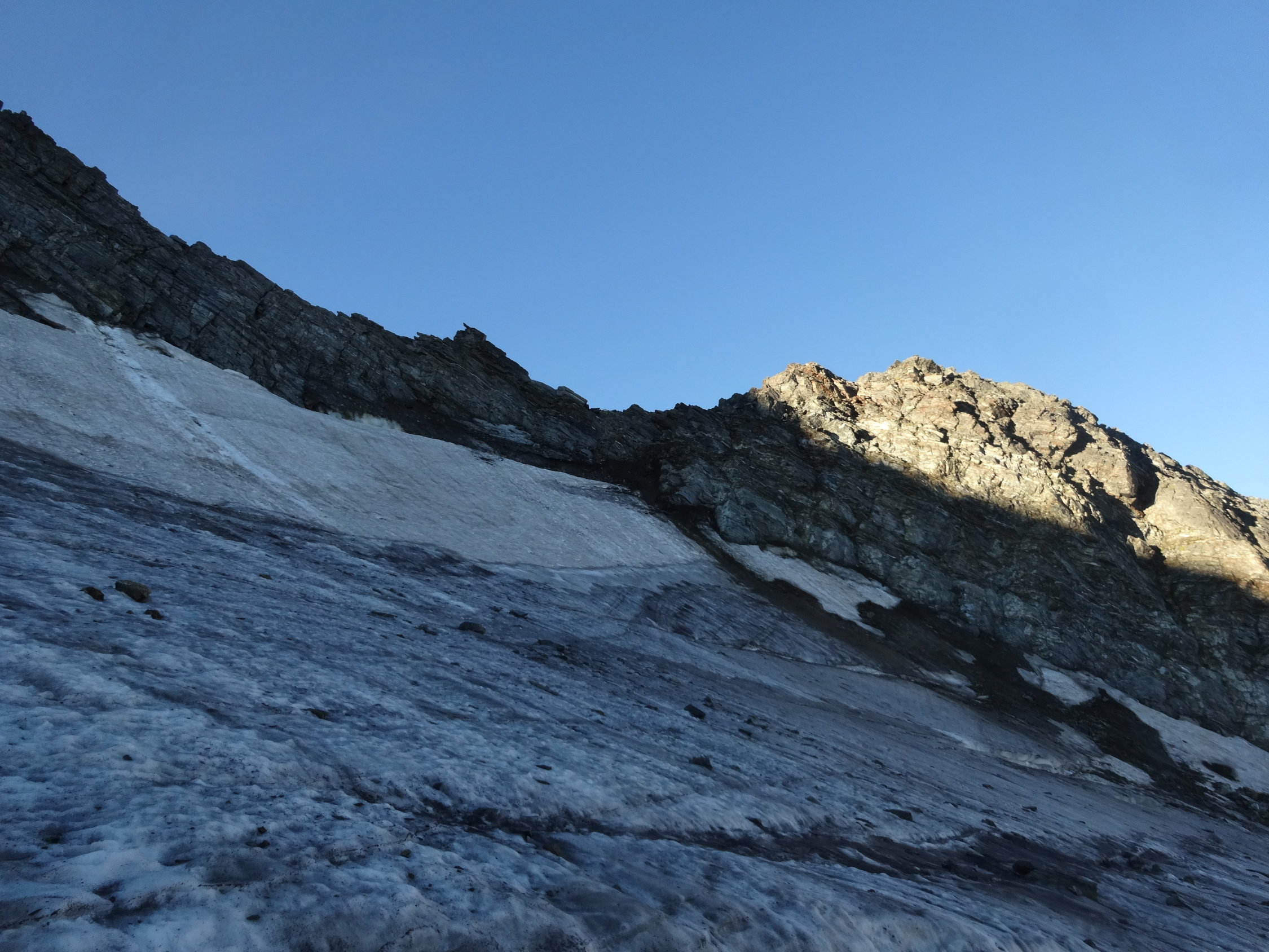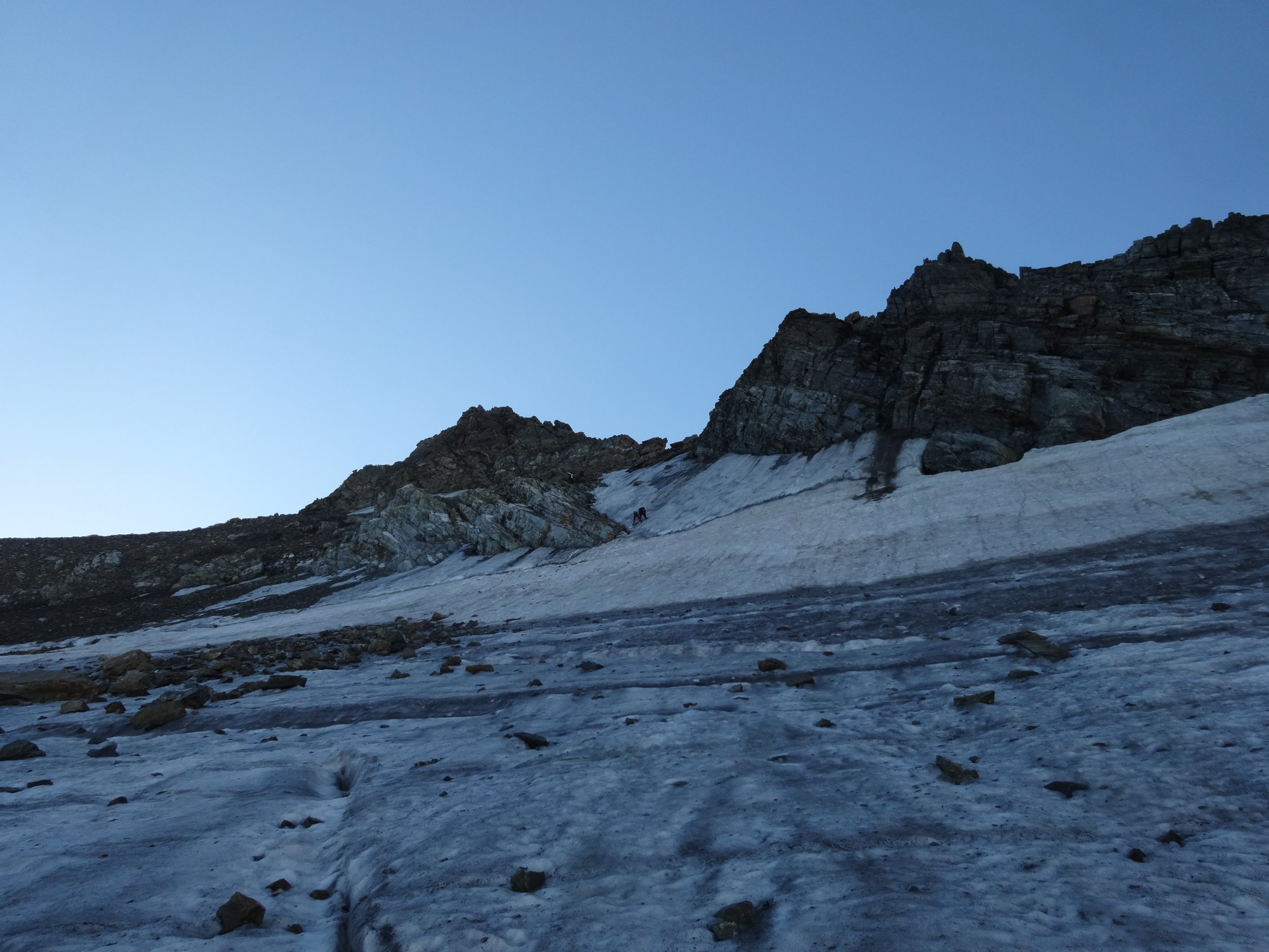 Haben diese Scharte geprüft. Bergschrund offen und gefüllt mit losem Gestein und feinem, sandigen Schutt. Schwarzeis für etwa 3 Meter und Dank Bergschrund für 1 bis 1.5 Meter 70° - 80° steil. Darüber ebenfalls viel loser Schutt. Die Felsen wären etwa vier Meter entfernt. Ohne zweitem Eisgerät nur schwer zu queren. Der darüber liegende Schutt auch nicht unbedingt einladend und heikel. Rückzug.