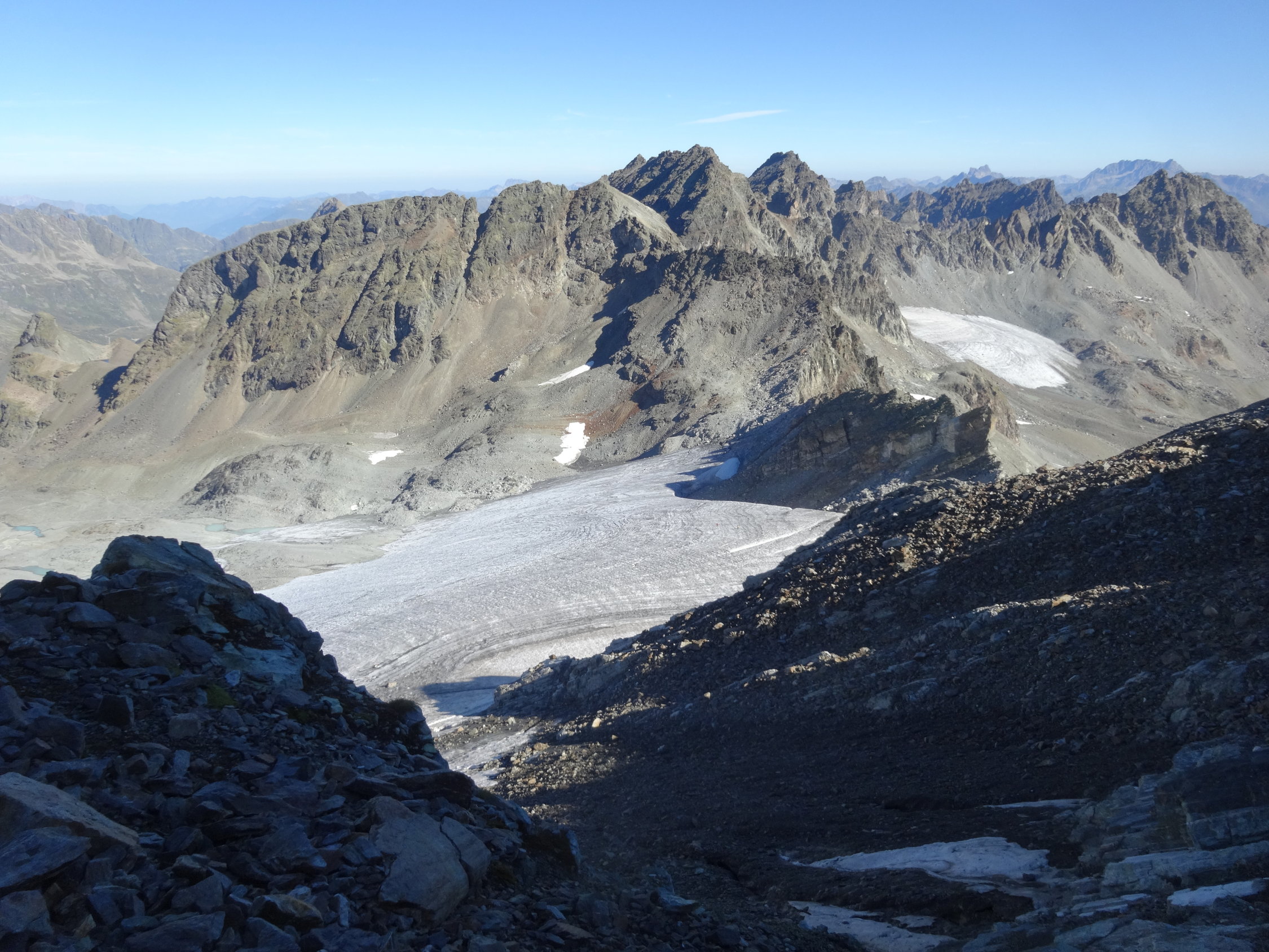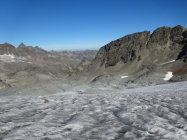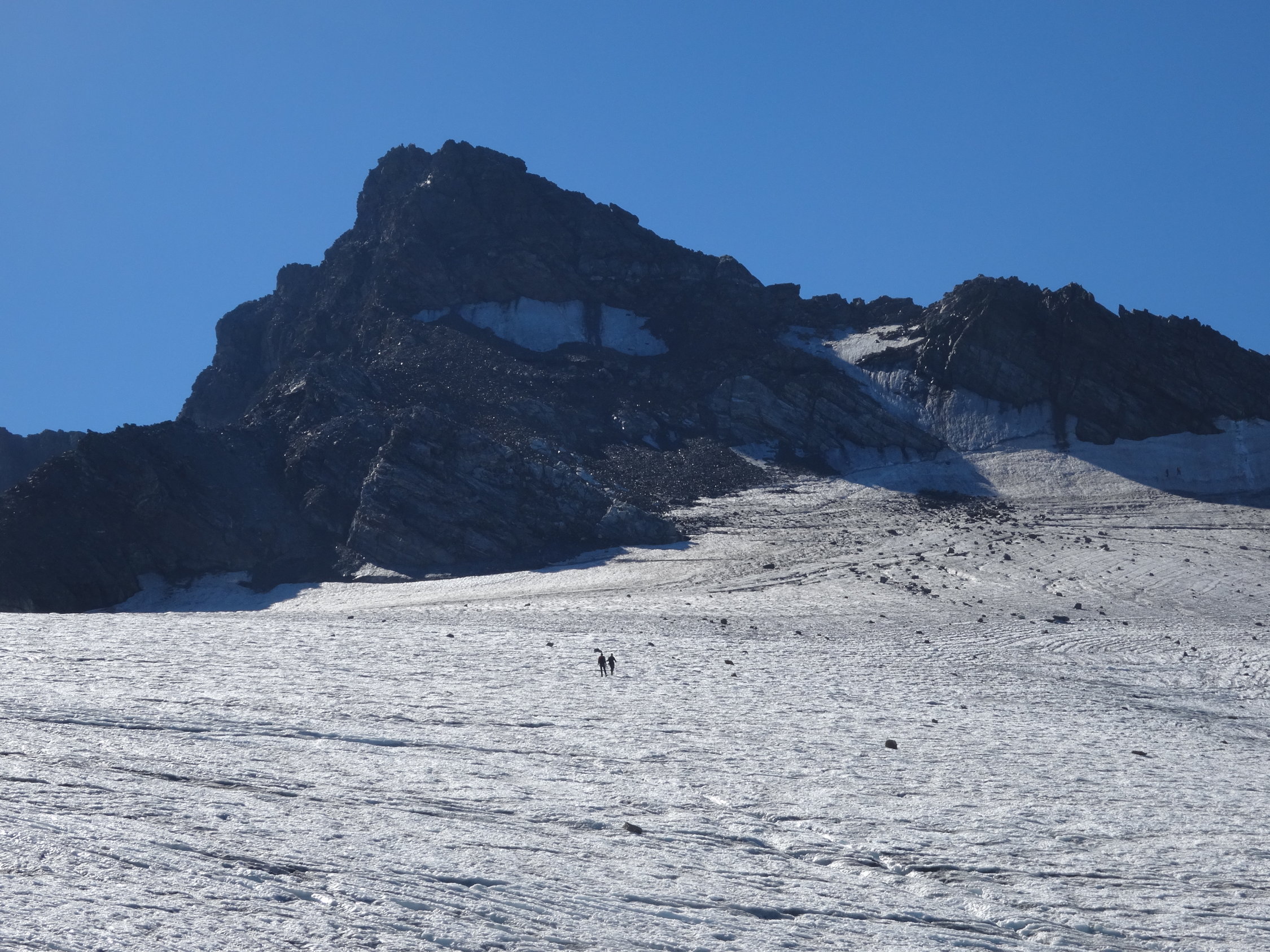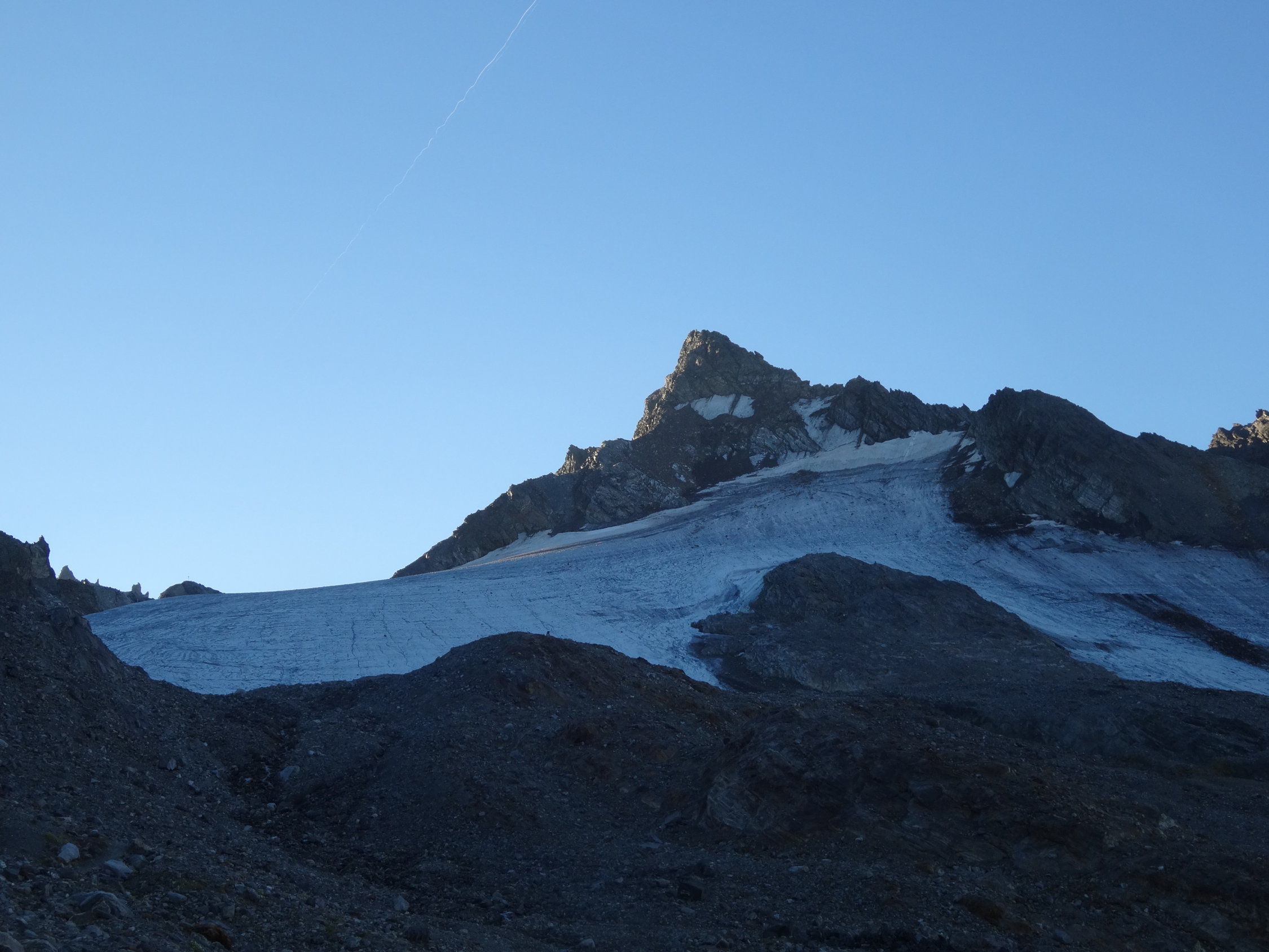 Abstieg zurück bis zur wenig ausgeprägten Rippe, dann den Pfadspuren nach rechts folgen und in der Flanke bleiben. So weicht man der Blankeisstelle aus und gelangt direkt runter auf den Gletscher. Die Pfadspuren sind von oben sehr gut zu erkennen. Auf dem Gletscher gleicher Weg zurück.