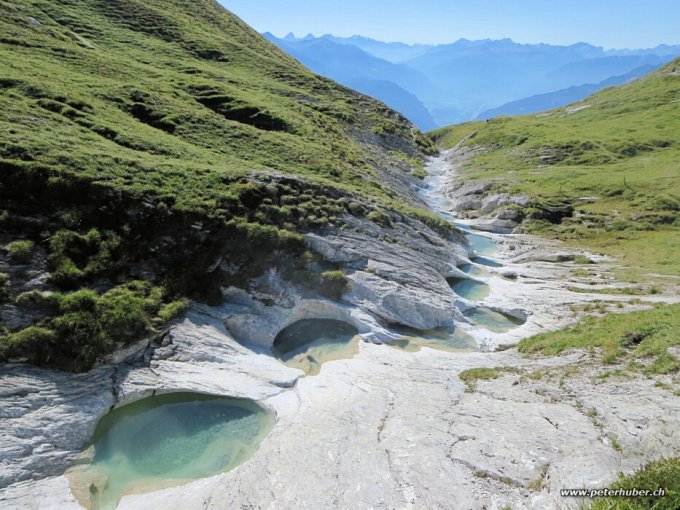 Wolkenlos und schön warm. Von der Alp Tegia Sut gibt es drei Wege zu den Gletschermühlen. Entweder zuerst leicht absteigend nach Osten zur Val Maliens und dann dem Bach entlang hochsteigen - so auch mit Wegweisern beschriftet.