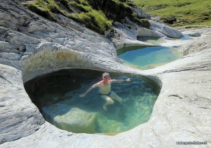 In den zirka 20 Becken hat es meist Wasser drin, auch wenn der Bach trocken ist. Wunderschön klar. Die grösseren Becken sind zirka 3 m im Durchmesser und etwa 1 m tief. Das Bad ist ganz schön erfrischend! Heute waren etliche Wanderer da unterwegs, und viele wagten den Sprung ins kühle Nass.