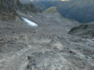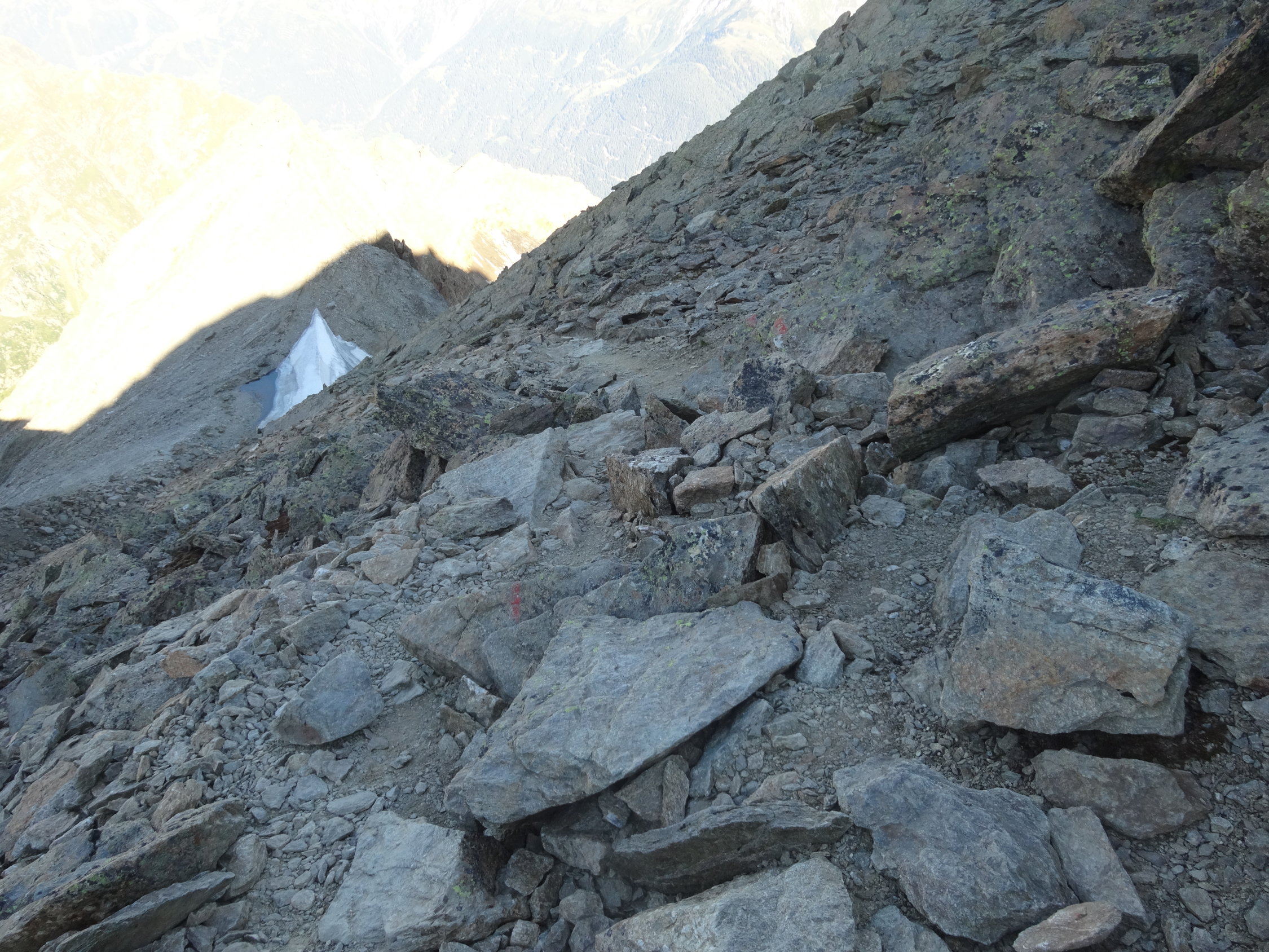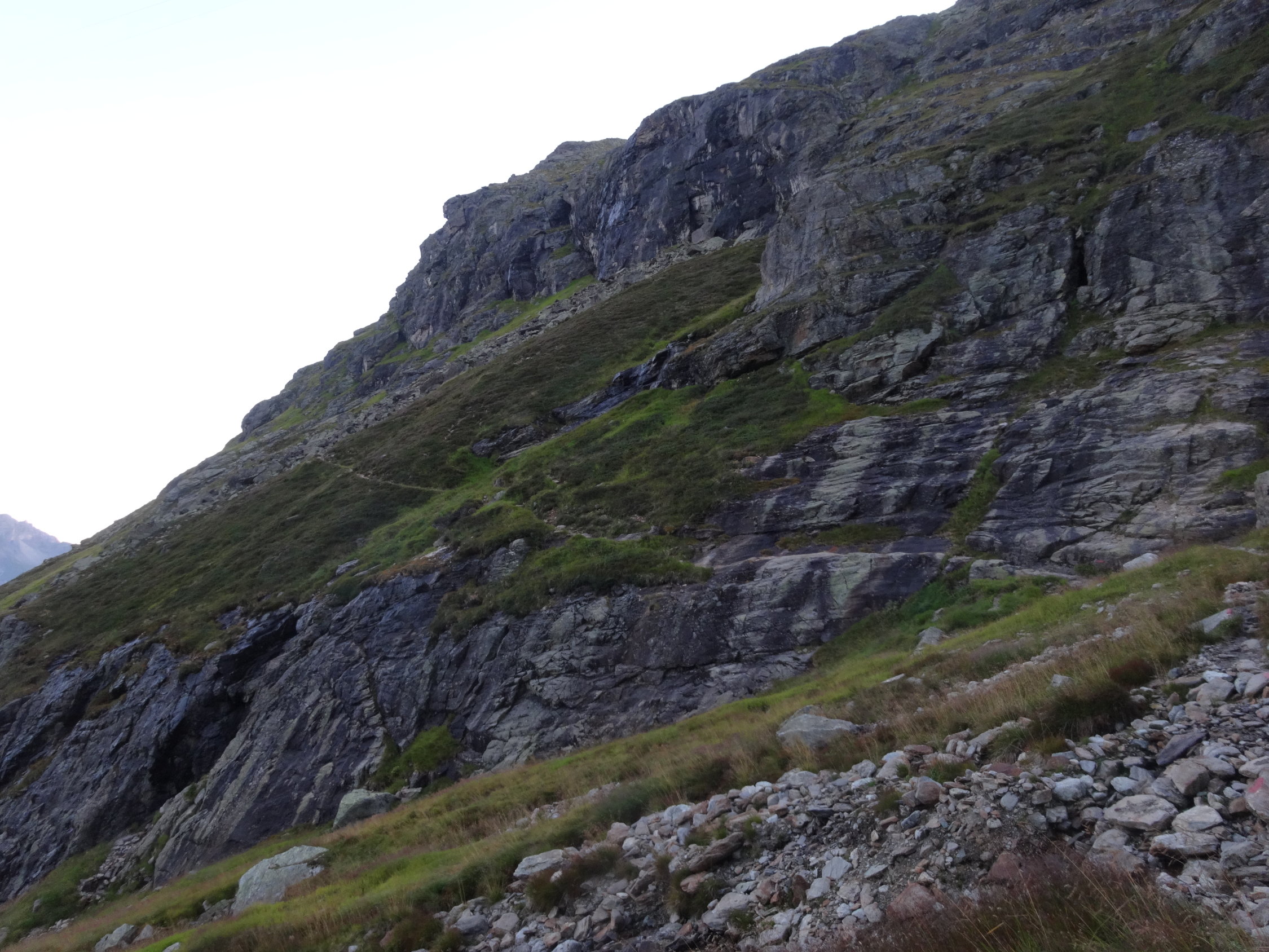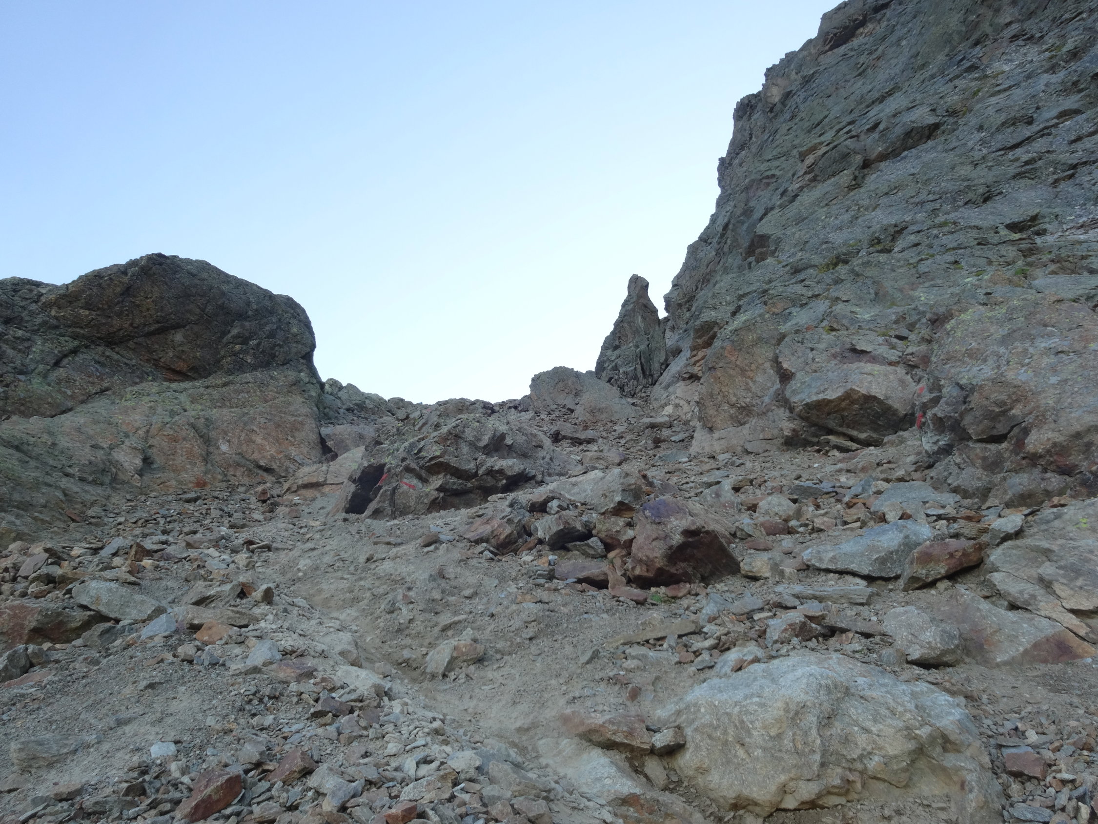 Nach der Hütte im felsdurchsetzten Wiesengelände hoch, bis man die markante Flanke, bzw. Rinne erkennt. Die Rinne geht ebenfalls gut, teilweise sandiger Pfad – dürfte bei Nässe schwieriger sein.