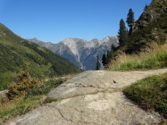 Zuerst auf Forststrasse bequem bis kurz vor der hinteren Malfonalpe. Dann Abzweiger hoch zur Edmund Graf Hütte. Zwei Möglichkeiten, wenige hundert Meter vor der Hütte. Beide Wege gehen gut.