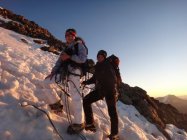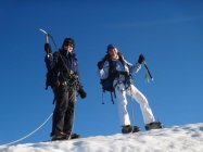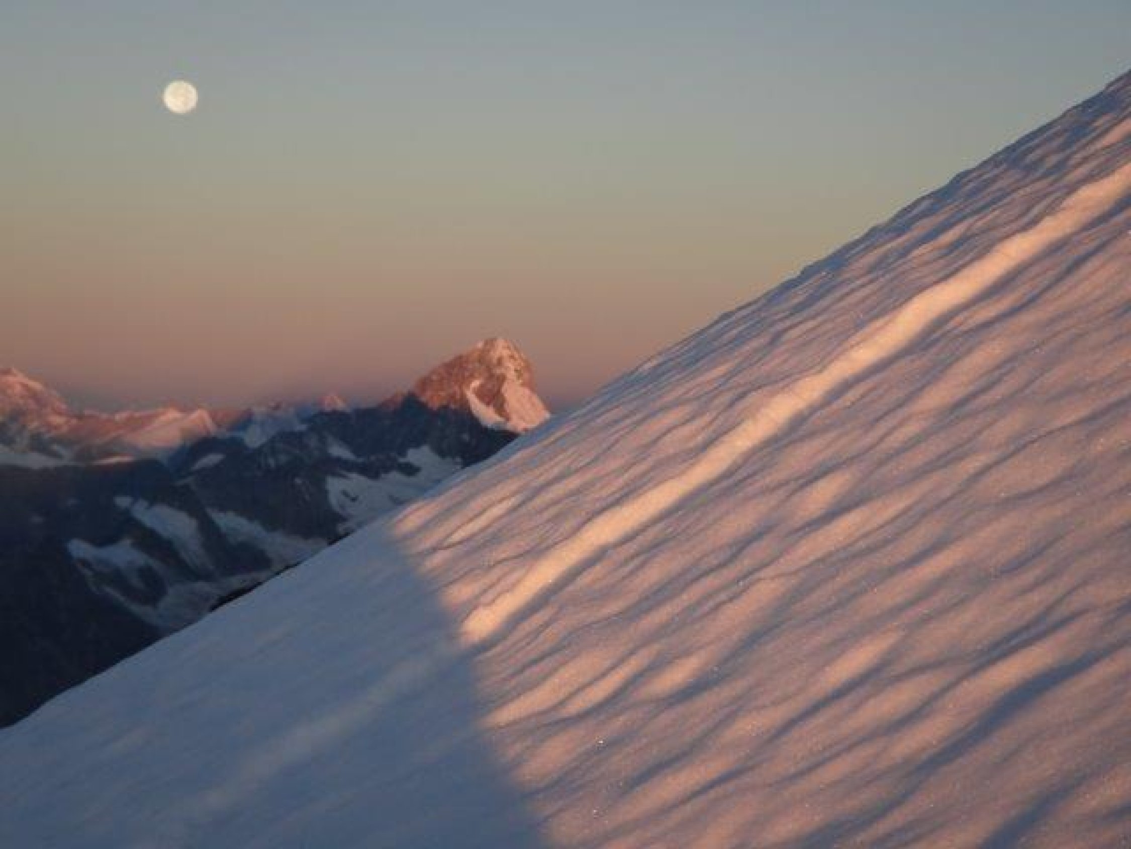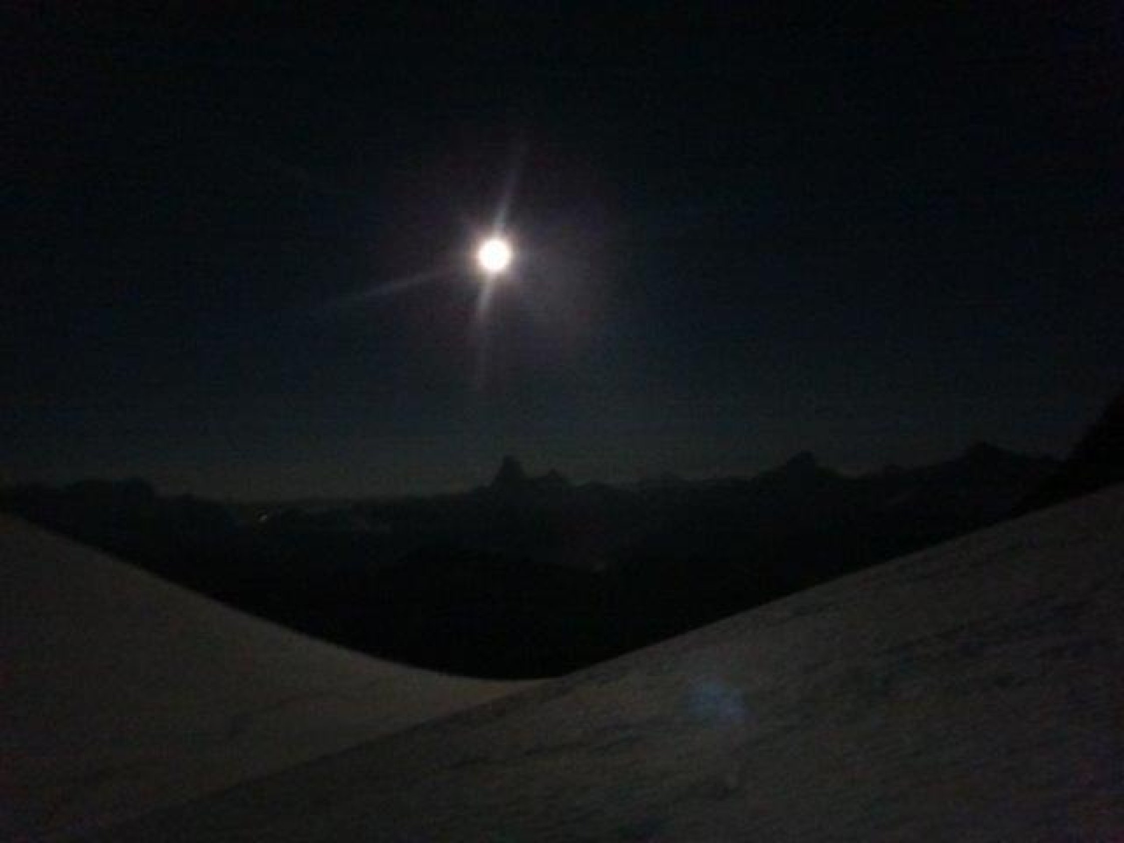 Aufstieg: Beste Verhältnisse angetroffen. Wir sind um 03.30 Uhr bei unserem Biwakplatz kurz unterhalb des Alphubelseeli gestartet. Es war Vollmond, und die ganze Hochgebirgslandschaft taghell beleuchtet. Ein Traum. Temperatur beim Start 0 Grad. Die Schneefelder waren tragend, und gut gefroren. Was ein gemütliches hochsteigen zuliess. Die Eisnase weist gute Tritte auf, jedoch tritt teilweise das blanke Eis hervor. Um 07.30 Uhr auf dem Gipfel war optimal. Windstill, mild, und hervorragende Fernsicht.