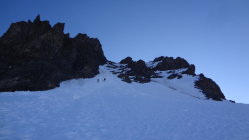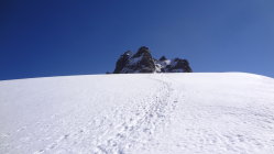 Firn, vom Rimpfischsattel Richtung Gipfel guter Trittschnee, Felsen aper.