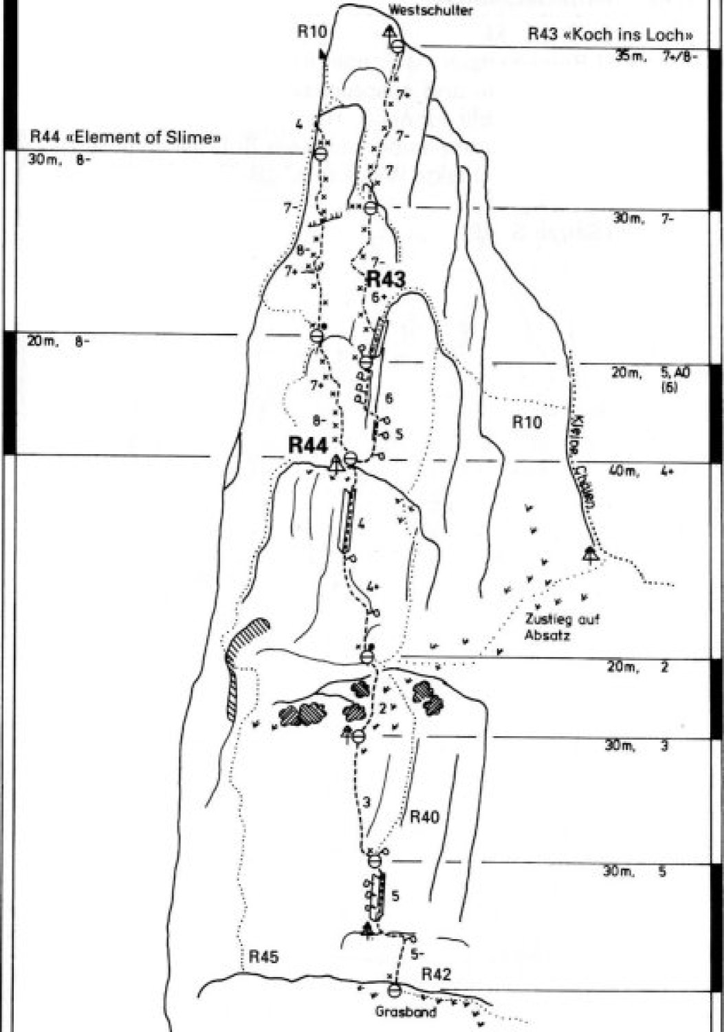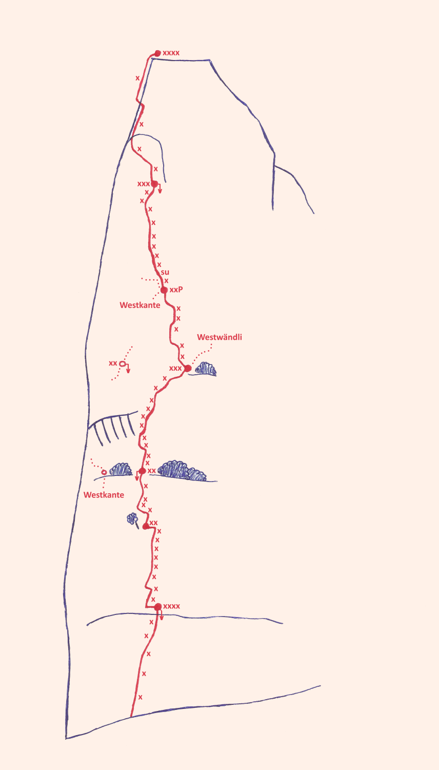 Der untere Teil in typischer Dettling-Manier geführt und gebohrt, was technisch und athletisch fordernde Kletterei, sowie häufig hoch zu hängende BH heisst.
