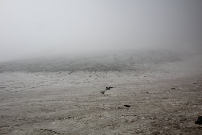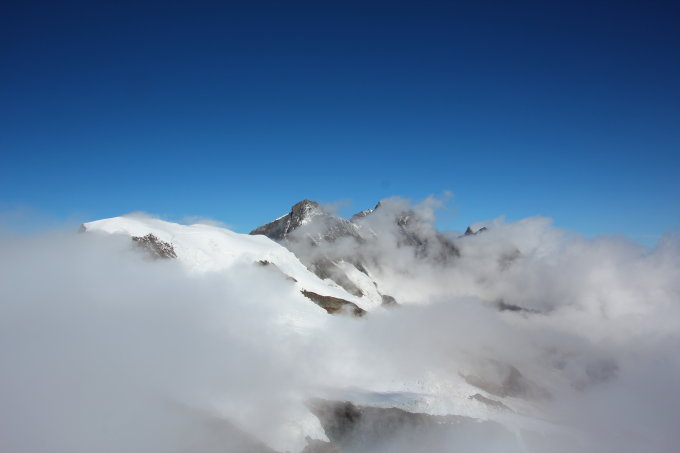 Der Abstieg vom Gipfel ist durch die oft begangene Normalroute gut machbar und führt durch die Spalten unterhalb des Feejochs hindurch.