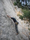Wir sind vor einiger Zeit hier schon mal geklettert. Diesmal nahmen wir den rechten Wandsektor ins Visier. Die Platten und kleingriffigen Stellen erfordern eine saubere Klettertechnik. Hier kann man die Trittsicherheit verbessern.