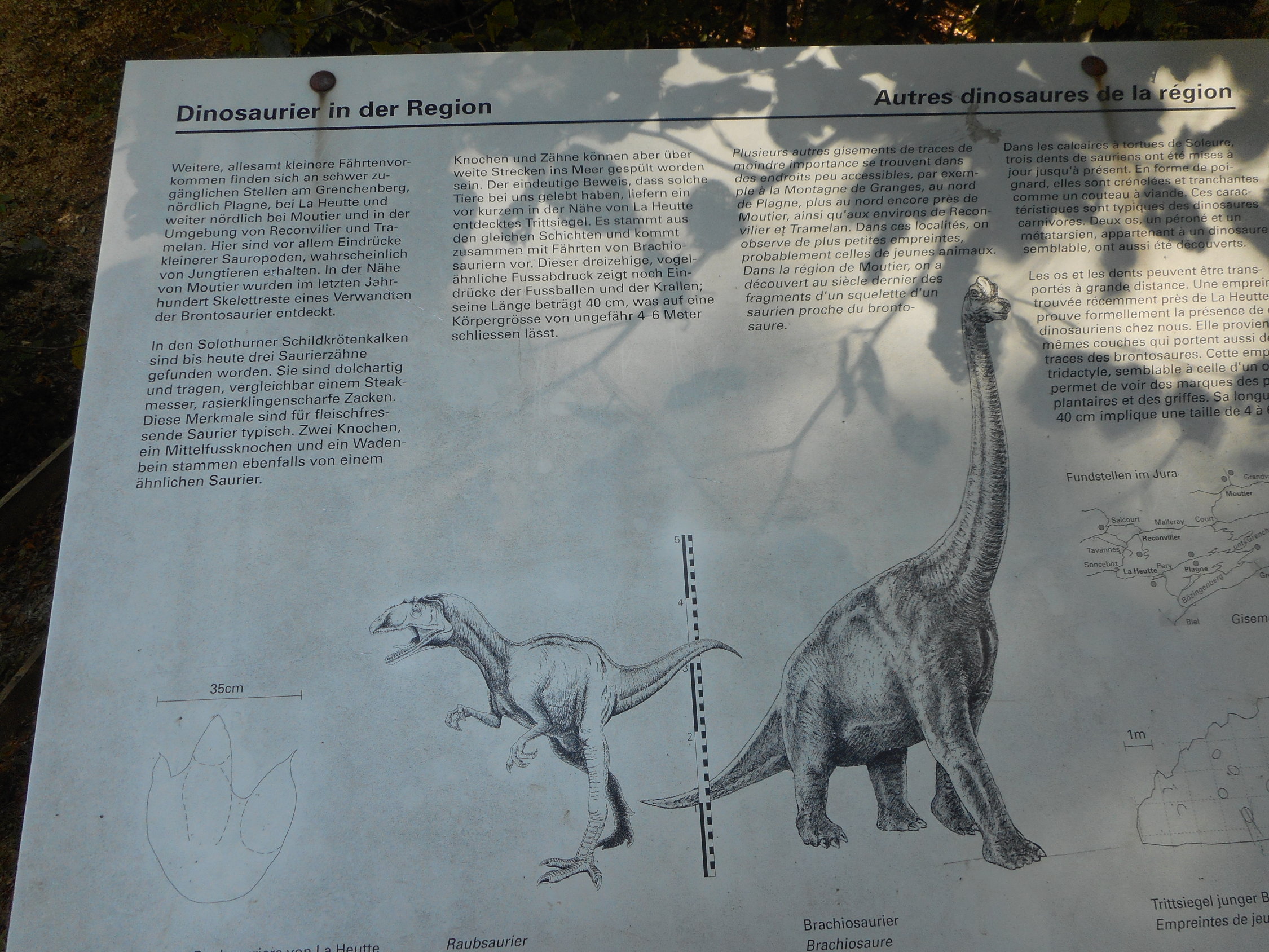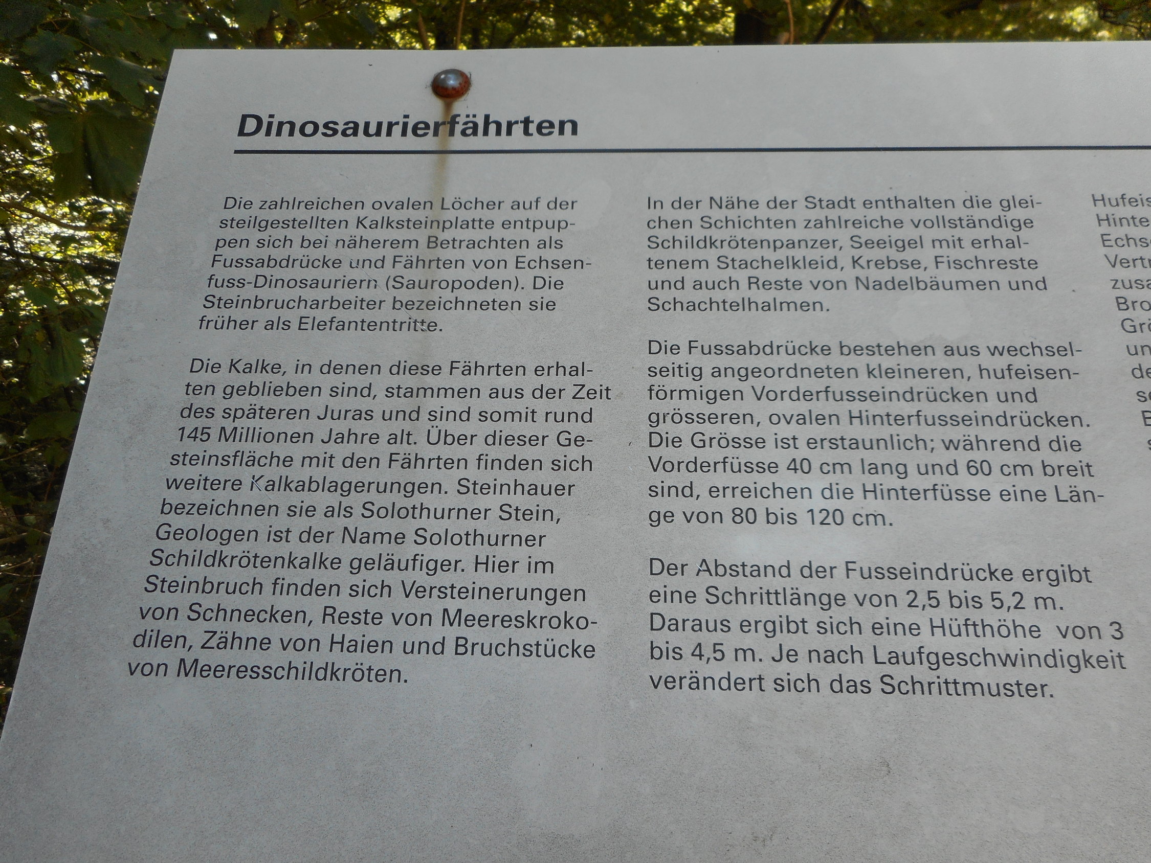 Nach dem Klettern lohnt es sich, im Grenzgebiet zwischen Oberdorf und Lommiswil am Jurasüdhang, den Steinbruch mit der Dinosaurierplatte zu besuchen. Der Forststrasse ab Bahnhof Lommiswil entlang, erreicht man die Platte in 25 Minuten. Die Fährten sollen 145 Millionen Jahre alt sein. Das können wir Menschen uns gar nicht vorstellen. Bei der Platte findet man die entsprechenden Informationen und Erklärungen.