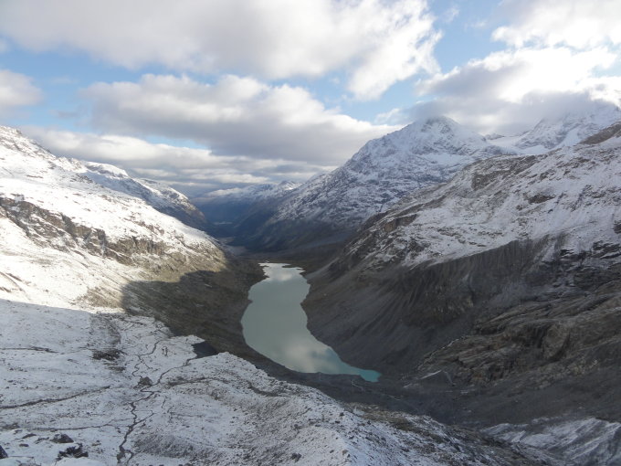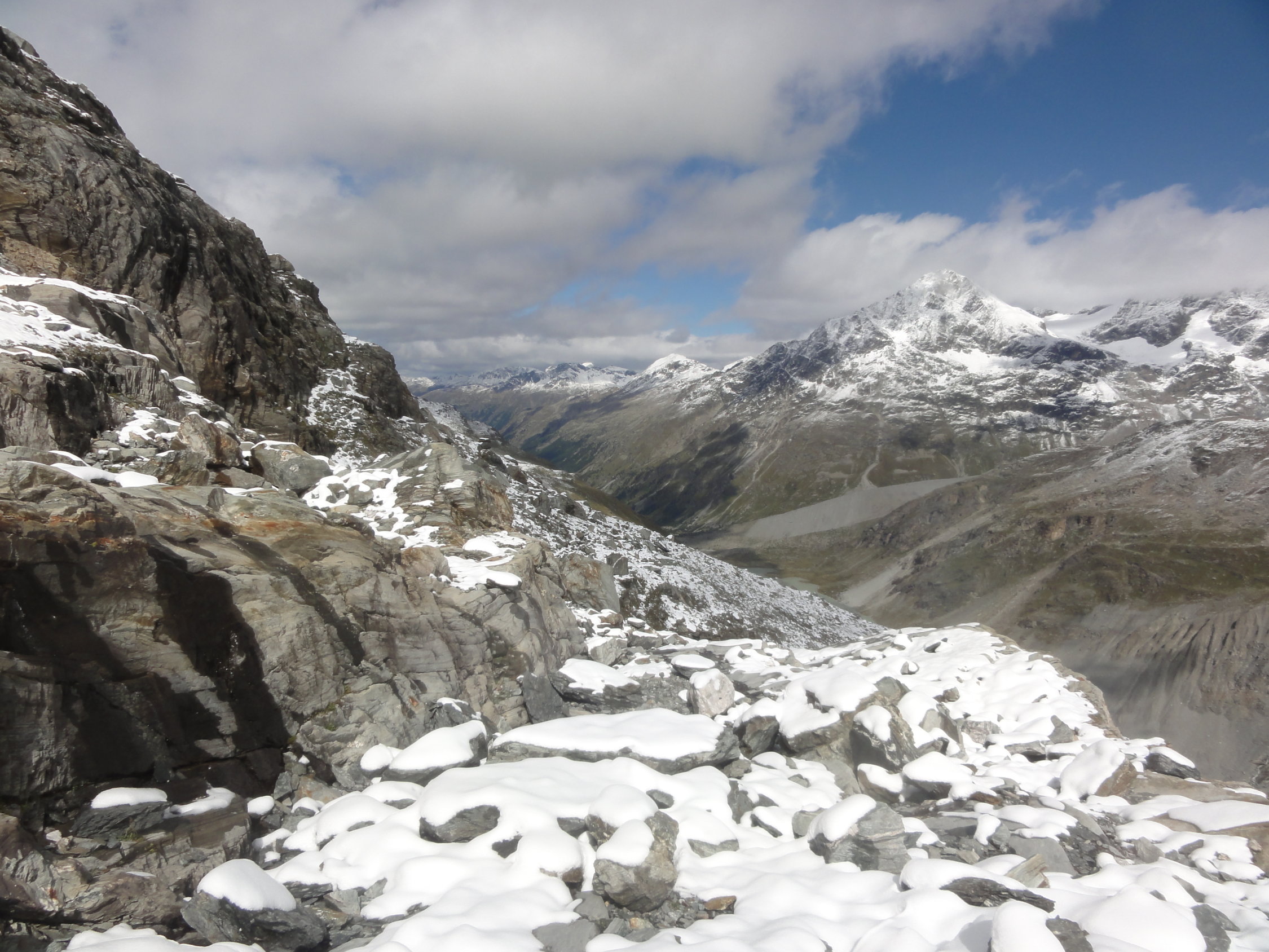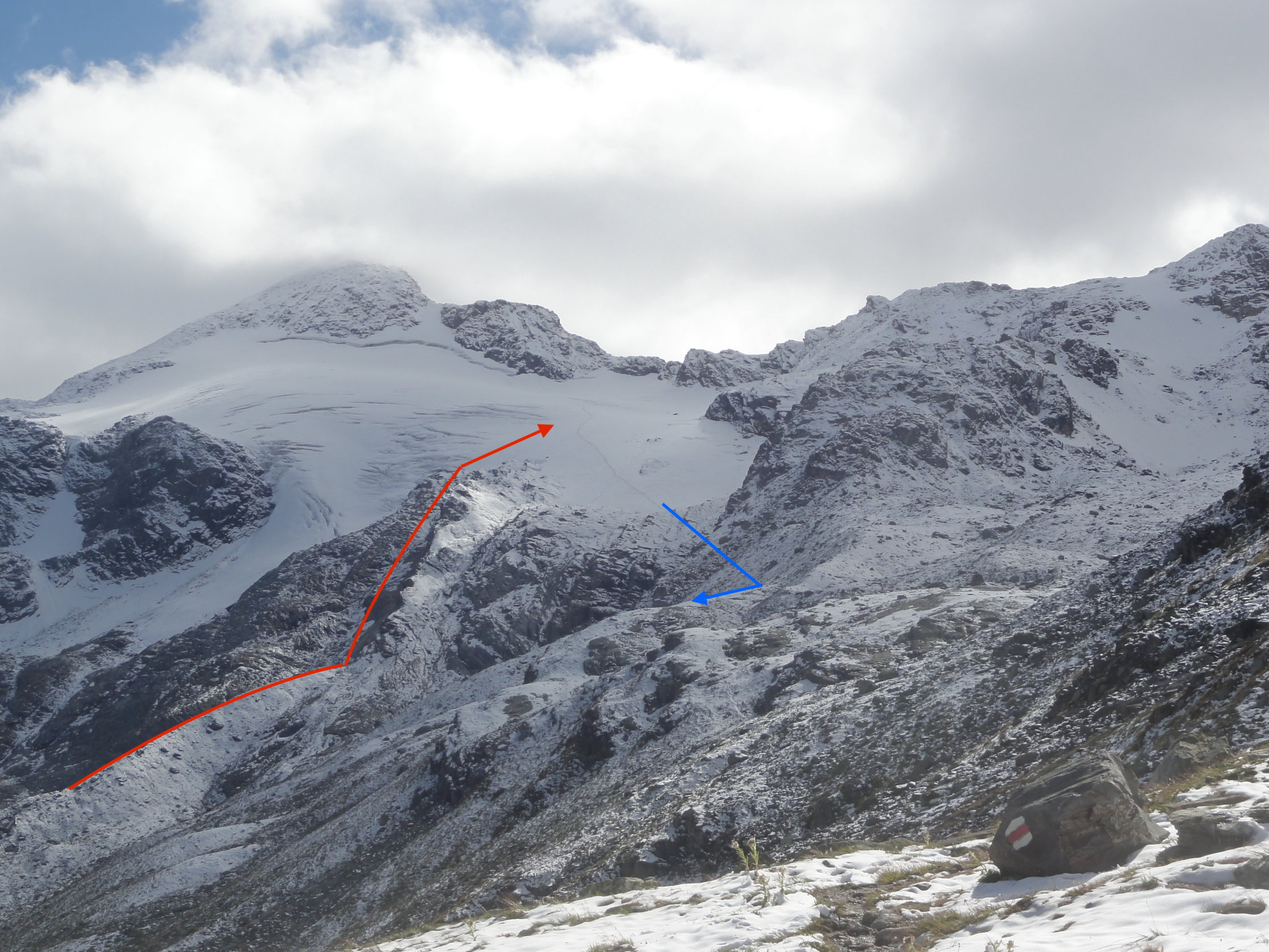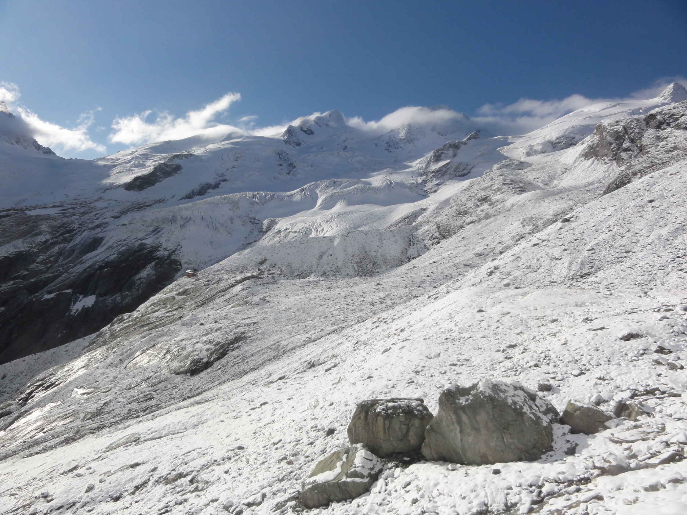 In den Geröllpassagen, das unterhalb des Gletschers teilweise sehr plattig war, lag phasenweise gut 40cm Neuschnee. Sowohl im Aufstieg als auch im Abstieg war der Neuschnee wenig hilfreich. Die Pfade waren nicht mehr sichtbar und es ging einfach darum, möglichst wenig Platten zu kreuzen und nach Möglichkeit trotzdem auf stabilem Gestein weiterzukommen. Der Aufstieg nach der Moräne war derart mühsam, dass wir die nördliche Variante im Abstieg gewählt hatten, weil der Gletscher ca. 100 Höhenmeter tiefer war und keine Spalten hatte (wie auf der Hauptroute). Der Weg durchs Geröll war dann auch nicht besser, aber kürzer.