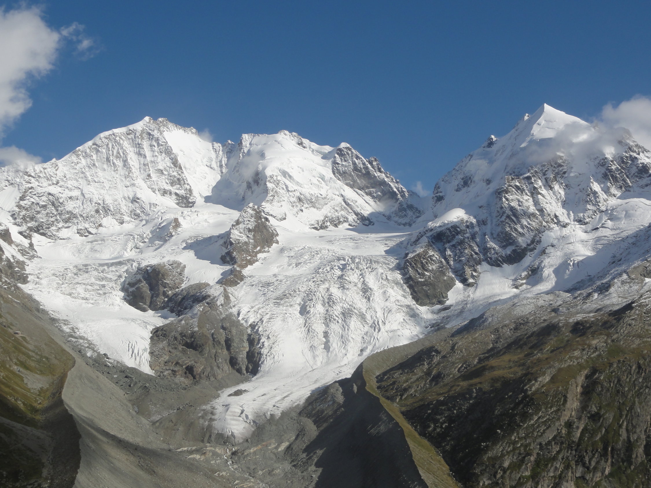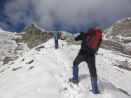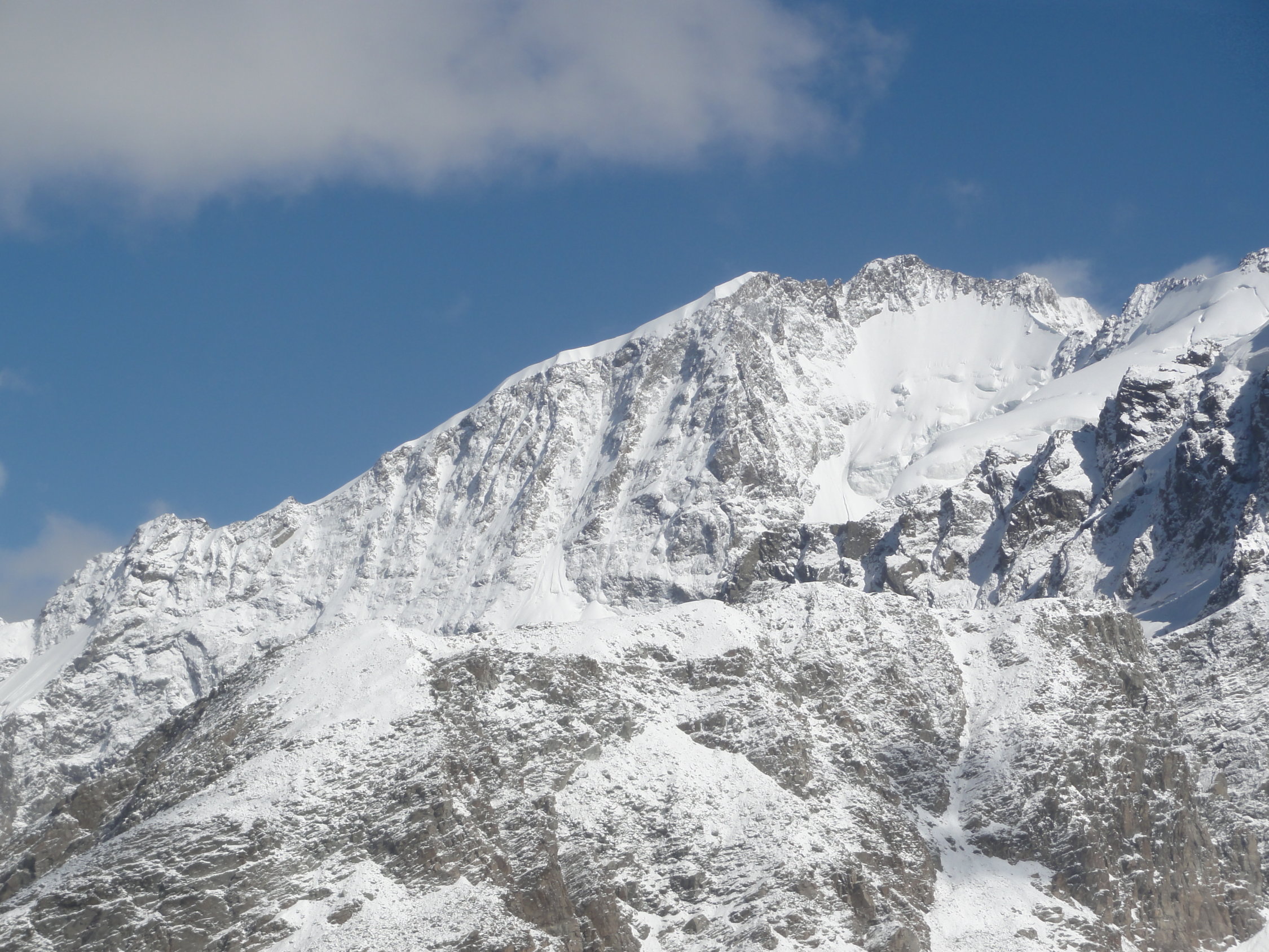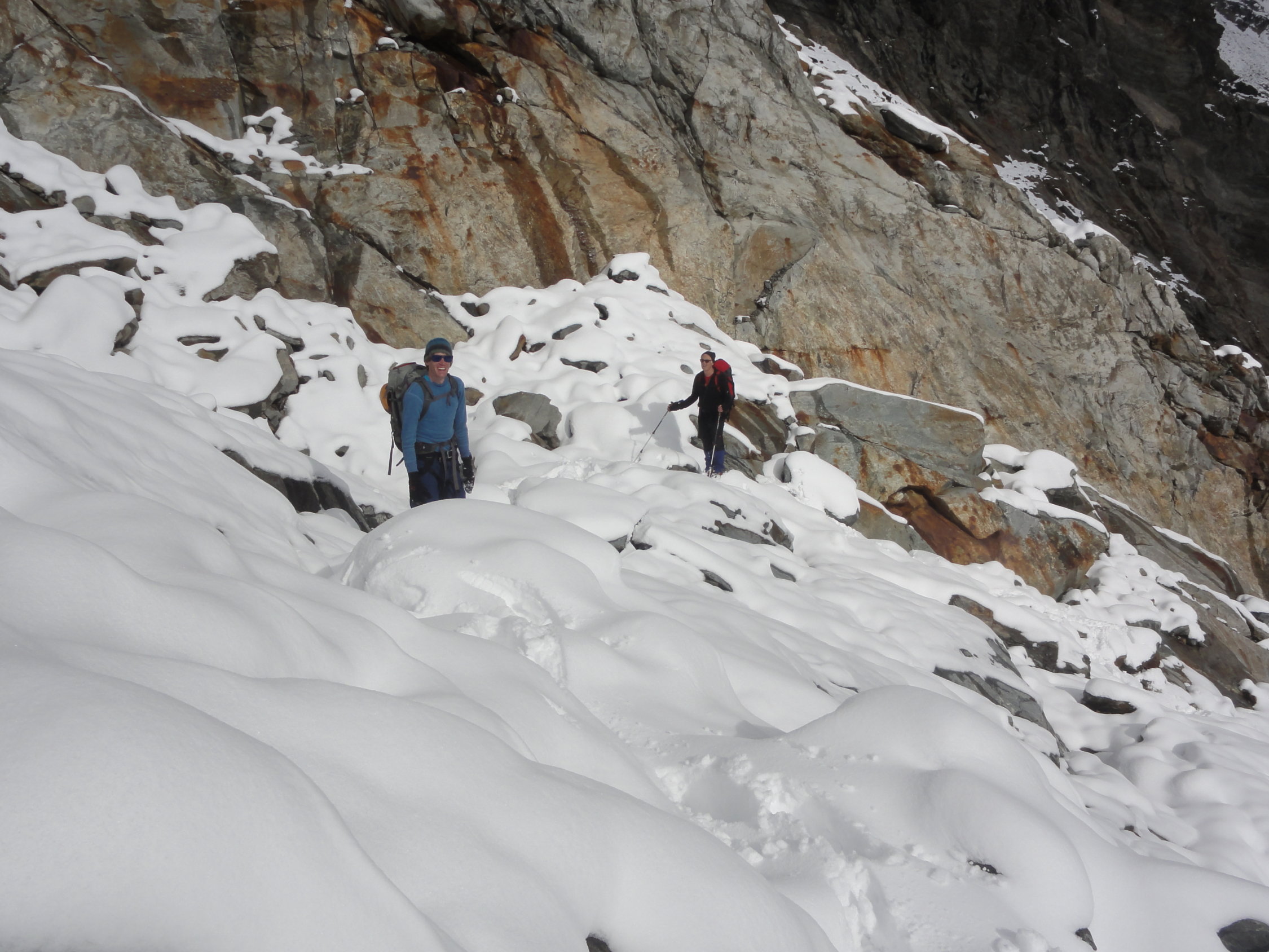 In den Geröllpassagen, das unterhalb des Gletschers teilweise sehr plattig war, lag phasenweise gut 40cm Neuschnee. Sowohl im Aufstieg als auch im Abstieg war der Neuschnee wenig hilfreich. Die Pfade waren nicht mehr sichtbar und es ging einfach darum, möglichst wenig Platten zu kreuzen und nach Möglichkeit trotzdem auf stabilem Gestein weiterzukommen. Der Aufstieg nach der Moräne war derart mühsam, dass wir die nördliche Variante im Abstieg gewählt hatten, weil der Gletscher ca. 100 Höhenmeter tiefer war und keine Spalten hatte (wie auf der Hauptroute). Der Weg durchs Geröll war dann auch nicht besser, aber kürzer.