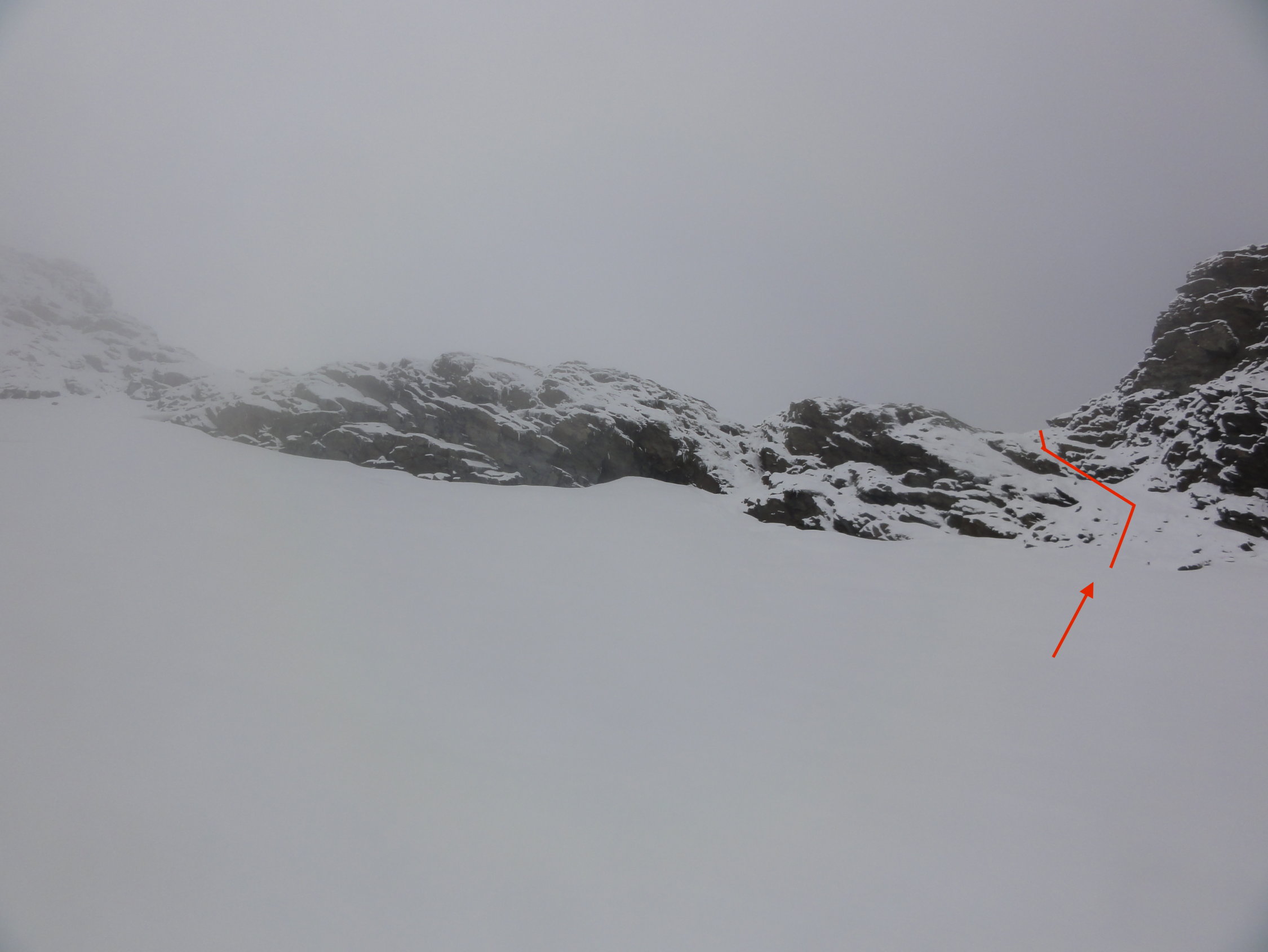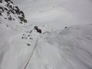 Der Gletscher hat gut sichtbare Spalten, die schmal, aber teilweise recht tief sind (Vorsicht!). Wir haben die Rinne ganz rechts (Norden) gewählt. Mit dem Neuschnee auf den Platten und den nicht sichtbaren Tritten und Griffen war es etwas schwieriger als eine 2.