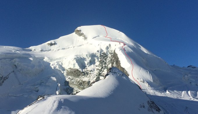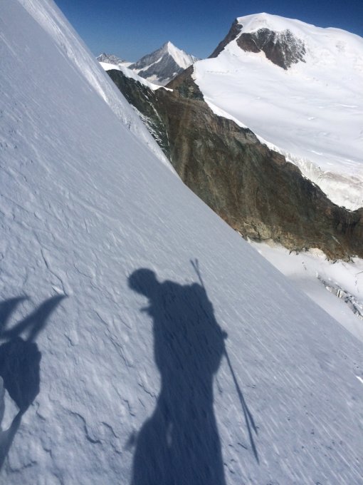 Der Bergschrund zum Gipfeleisfeld dürfte in den nächsten Tagen noch etwas schwieriger werden. Auch die Spalten müssen zunehmend vorsichtig beurteilt werden.