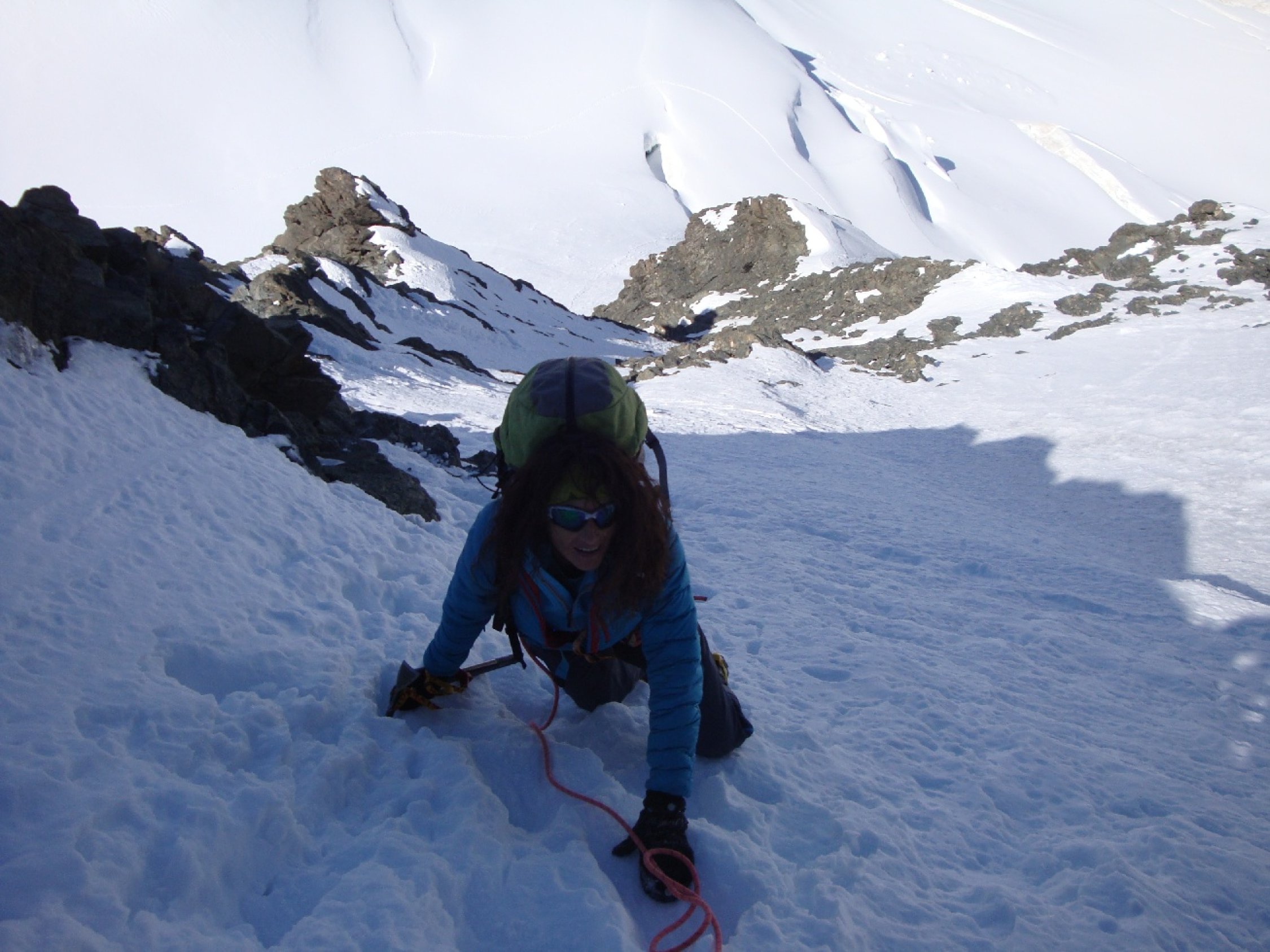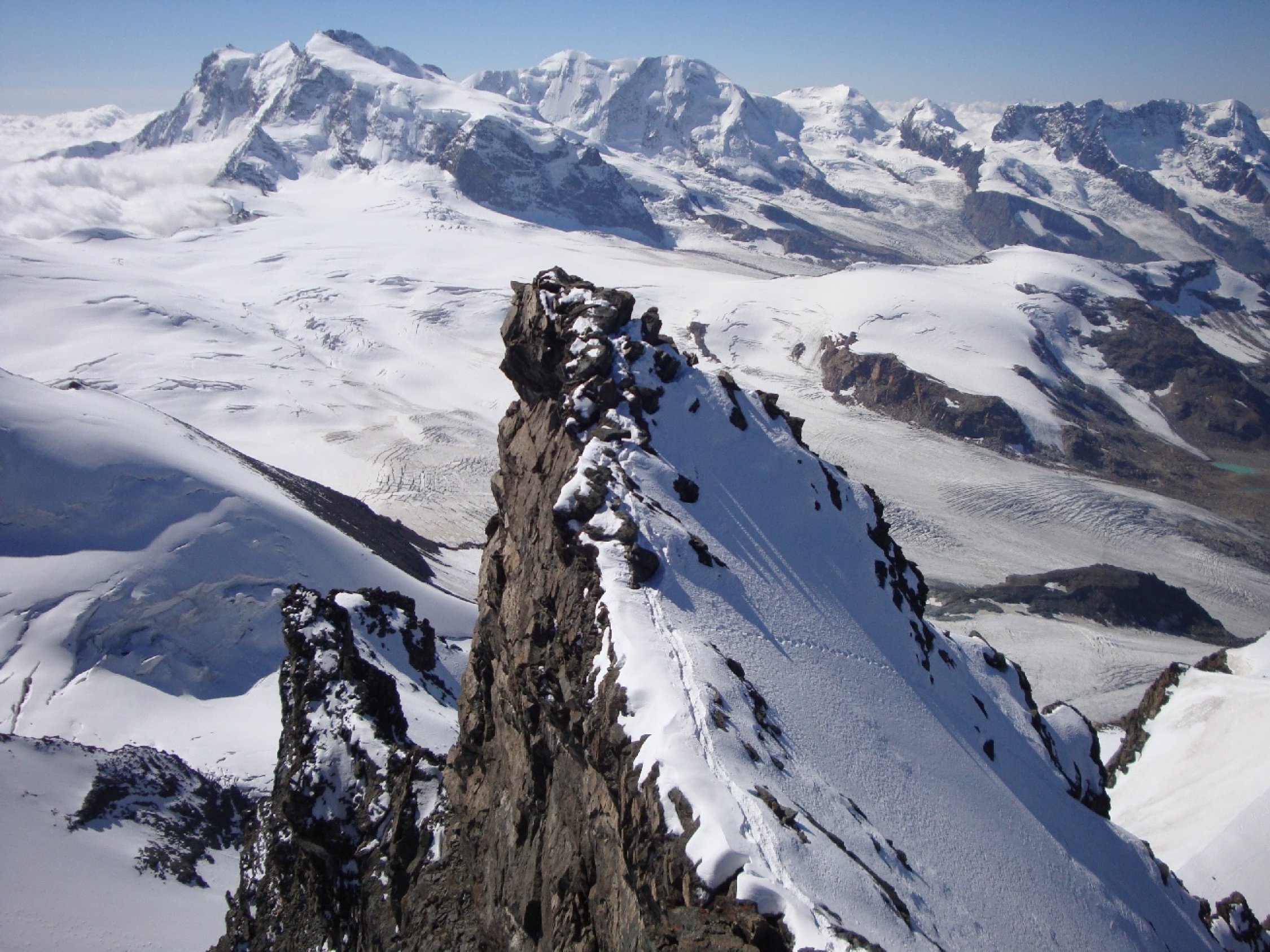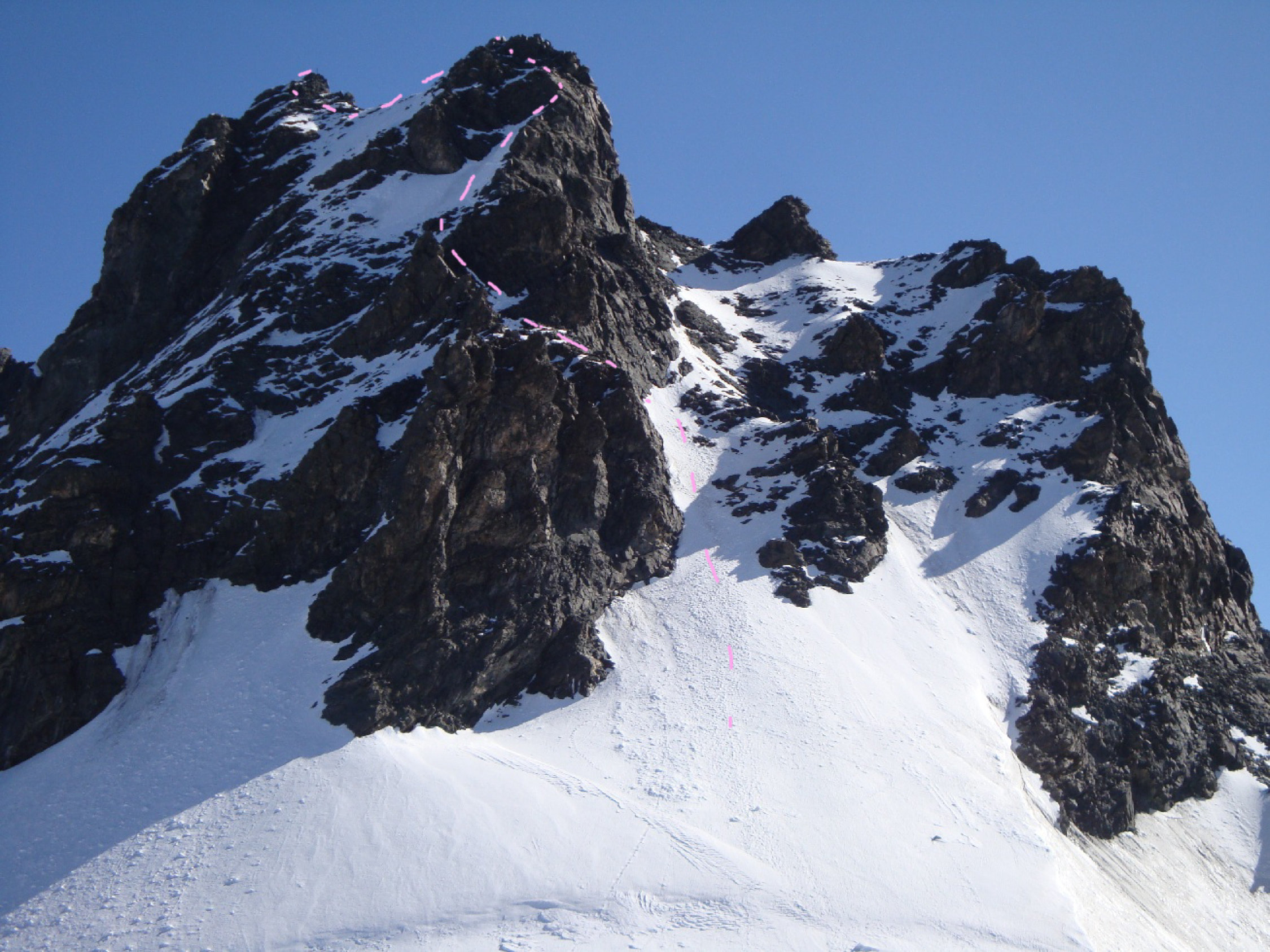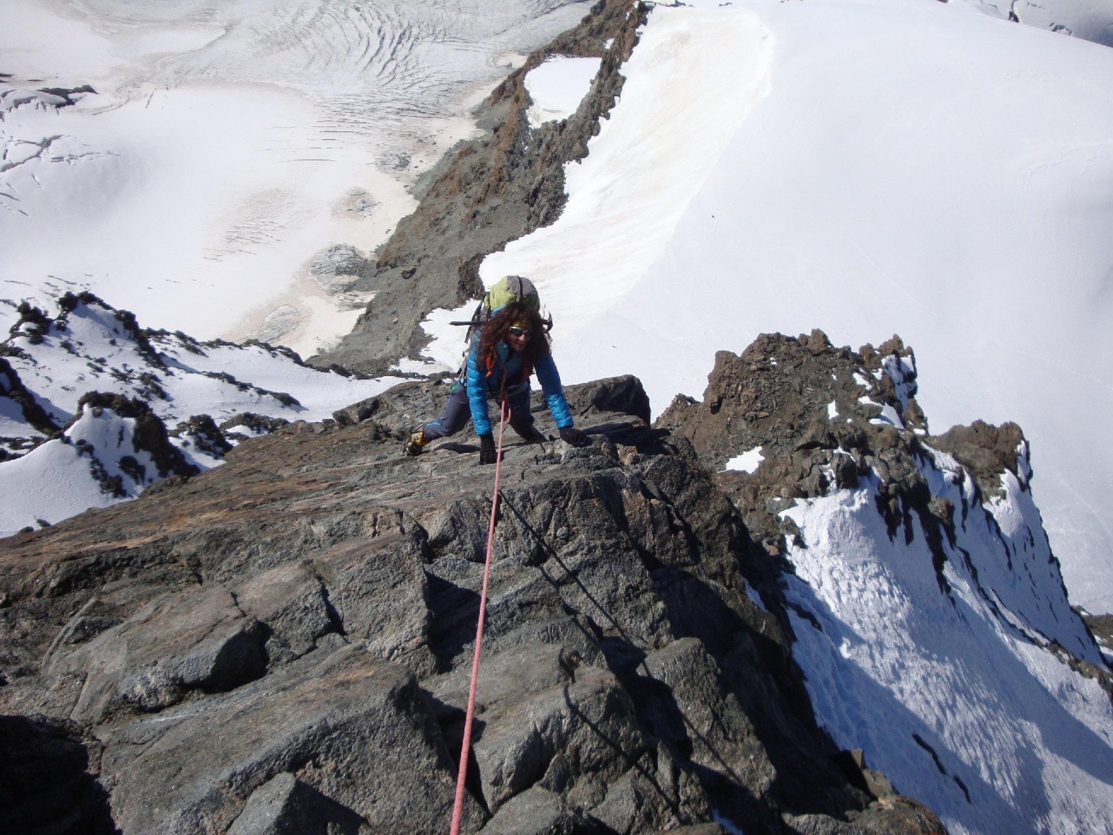 Sind um 5:45 los in Ottafe, die ca. 3Km flach ins Tal hinein. Hier könnte man gut ein Bike mitnehmen. Danach auf markiertem Wanderweg Richtung Pfulwe (Sattel). Ab 2940m dann direkt nach SW aufgestiegen. Teilweise plattige Felsen mit viel Schotter darauf. Am Schluss südlich von Pkt 3063 dem Grat entlang auf den Längfluegletscher. Diese Abkürzung spart einige Zeit die man sonst für die Pfulwe brauchen würde. Sie ist aber auch gefährlich und so nur bedingt zu empfehlen, sprich nur wenn es wirklich kalt ist! Man sieht gut einen grossen Felssturz der in letzter Zeit herunter kam vom Pkt 3402 her. Wie auch einges was jeweils an Steinschlag von der Pulwe her herunter kommt. Am Morgen war es recht kalt und auch am Nachmittag dort unten bewölkt und es blies immer noch eine kalte Bise. So konnte ich es meiner Meinung nach riskieren. Hier nun mit Steigeisen weiter zur Normalroute, welche vom Hotel Flue her kommt. Weiter folgt ein Plaisir-Schneewaggel der mit etwas Fels unterbrochen wird hoch bis 3780m. Nun über den etwa 200m hohen Bröselfelsgrat mit etwas Kraxelei und viel Gehgelände hinauf zum Pkt 4001. Noch den Rimpfischsattel überqueren und dann die Flanke in gutem Trittschnee hoch, nur kurz etwas blanke Stellen. Danach nach links queren in einfachem Fels weiter bis ans Eck, dann über eine weitere gute Trittschneeflanke hoch an den rechten Grat vom Vorgipfel. Hier hat es einen Sicherungsanker an den man sich über die folgende knapp 20m hohe Schlüssselkletterei hochsichern kann. Wobei der Fels hier super ist und es nur Stelle im 3ten Grad hat. Dafür ist es steil, leicht ausgesetzt und fotogen. Dann noch etwas Kraxelei und man steht auf dem Vorgipfel. Noch kurz über den schmalen Verbindungsgrat und man steht auf dem Hauptgipfel. Bestes Wetter, aber doch noch frisch, bei schönstem Panorama auf einem tollen 4000er, was will man mehr. Abstieg dann über die gleiche Route retour ins Tal.