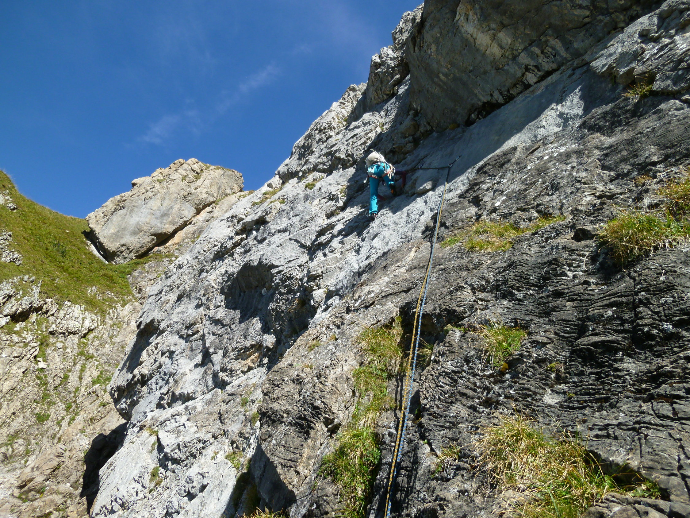 Routenfindung nicht ganz einfach: Start Mitholz um kurz vor 9Uhr. Zustieg knappe 3h, auf dem wir zwei Verhauer zu verzeichnen haben. 20min haben wir bereits ganz unten verloren, man kann dem auch sagen mehr geschwätzt als aufgepasst. Den grösseren Verhauer erlitten wir oben, da gingen sicher 40min drauf, wir sind nach Alp Voregg viiel zu weit in Richtung Rinderfeld weiter (anstatt kurz nach Voregg den Weg zu verlassen und durch den Felsriegel rauf), dort über einen schmalen Pfad durch einen "falschen" Felsriegel rauf und mussten anschliessend über sehr steile Grashänge mühselig zum W-Grat-Einstieg rüberqueren).