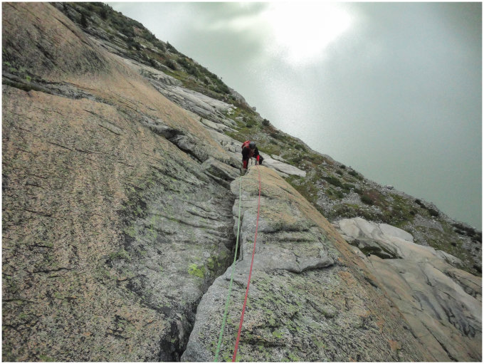 Die zweitletzte SL führt dann noch über wirklich schöne Riss/Verschneidungskletterei hoch. Der Riss ist recht offen und Placements sind schwierig.. hier hat sich mal wieder der schmale Kopf meiner TOTEM Cams bewährt (ein BD-Cam hätte da nicht rein gepasst) ;-)