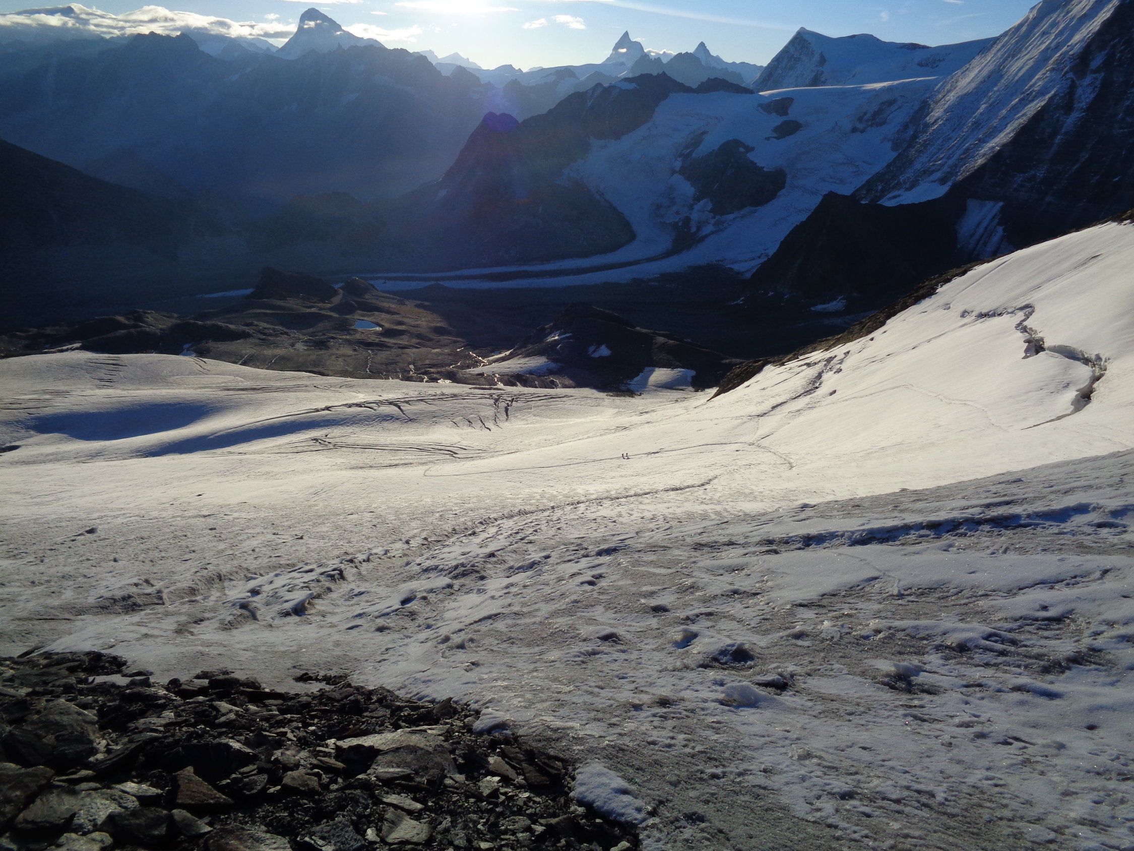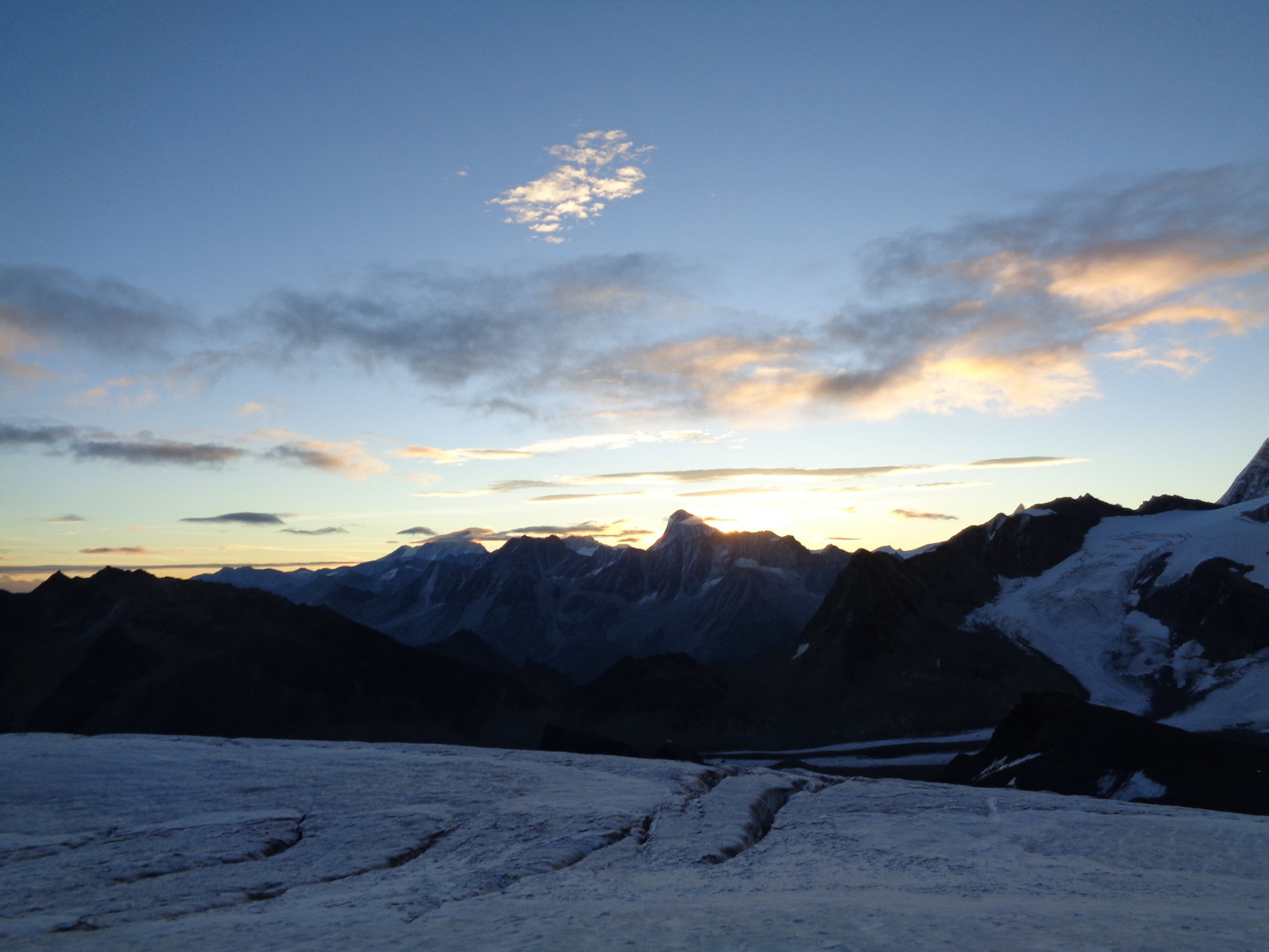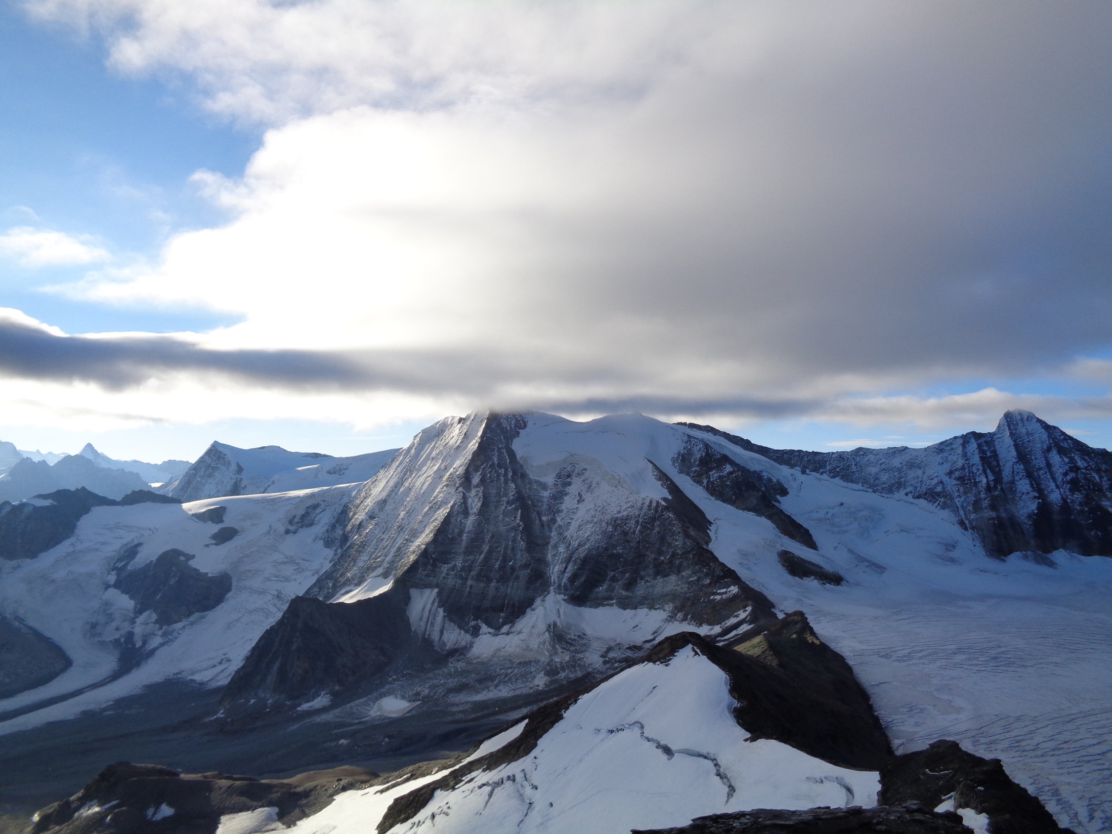 Gletscher weitgehend aper, im oberen Teil ein paar Zentimeter Neuschnee. Der Grat war schneefrei und gut zu gehen.
