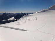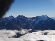 Der frische Neuschnee verdeckte die schwarzen Steinschlagrinnen. Aber man sah und ahnte die starke Ausaperung vom Hitze Sommer 2015.