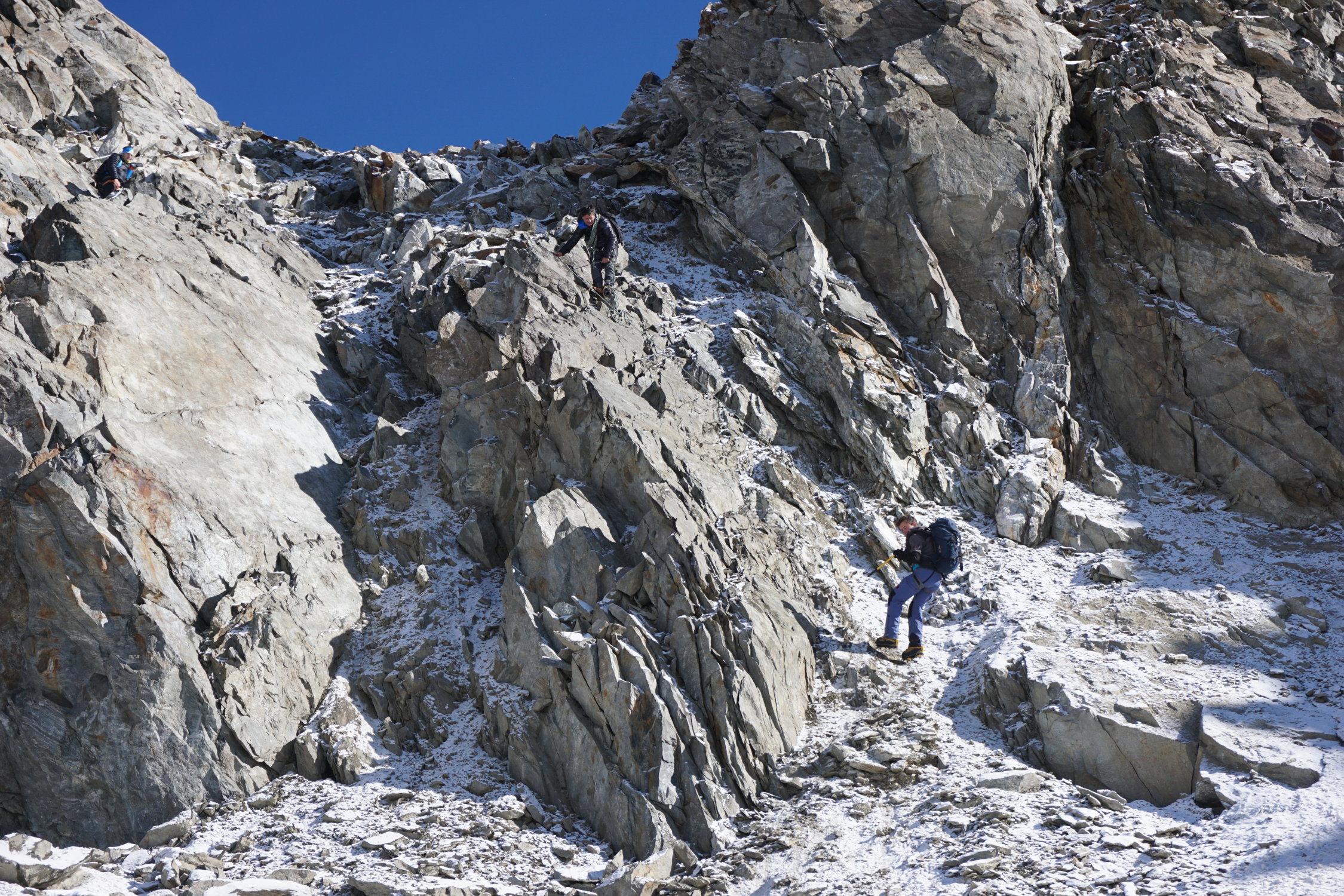 Es herrschen optimale Verhältnisse am Berg. Morgens lagen etwa 5 cm Neuschnee. Der Aufstieg zum Bietschjoch war problemlos zu bewältigen. Dort haben wir die Steigeisen angelegt und erst beim Verlassen des Joligletschers wieder abgezogen. Die Gletscherspalten auf Bietsch- und Joligletscher sind zum Teil bereits etwas zugeschneit aber gut erkennbar und zu umgehen. Die Routenfindung bedingt einen geübten Alpinisten, der sicher den ständigen Wechsel zwischen Grat und Flanke findet. Im Abstieg über den Südgrat empfiehlt es sich, im östlichsten Schlusscouloir abzuseilen (ca. 20 Meter bei Schlingenstand), da dort der Randspalt im Moment gut zu queren ist.
