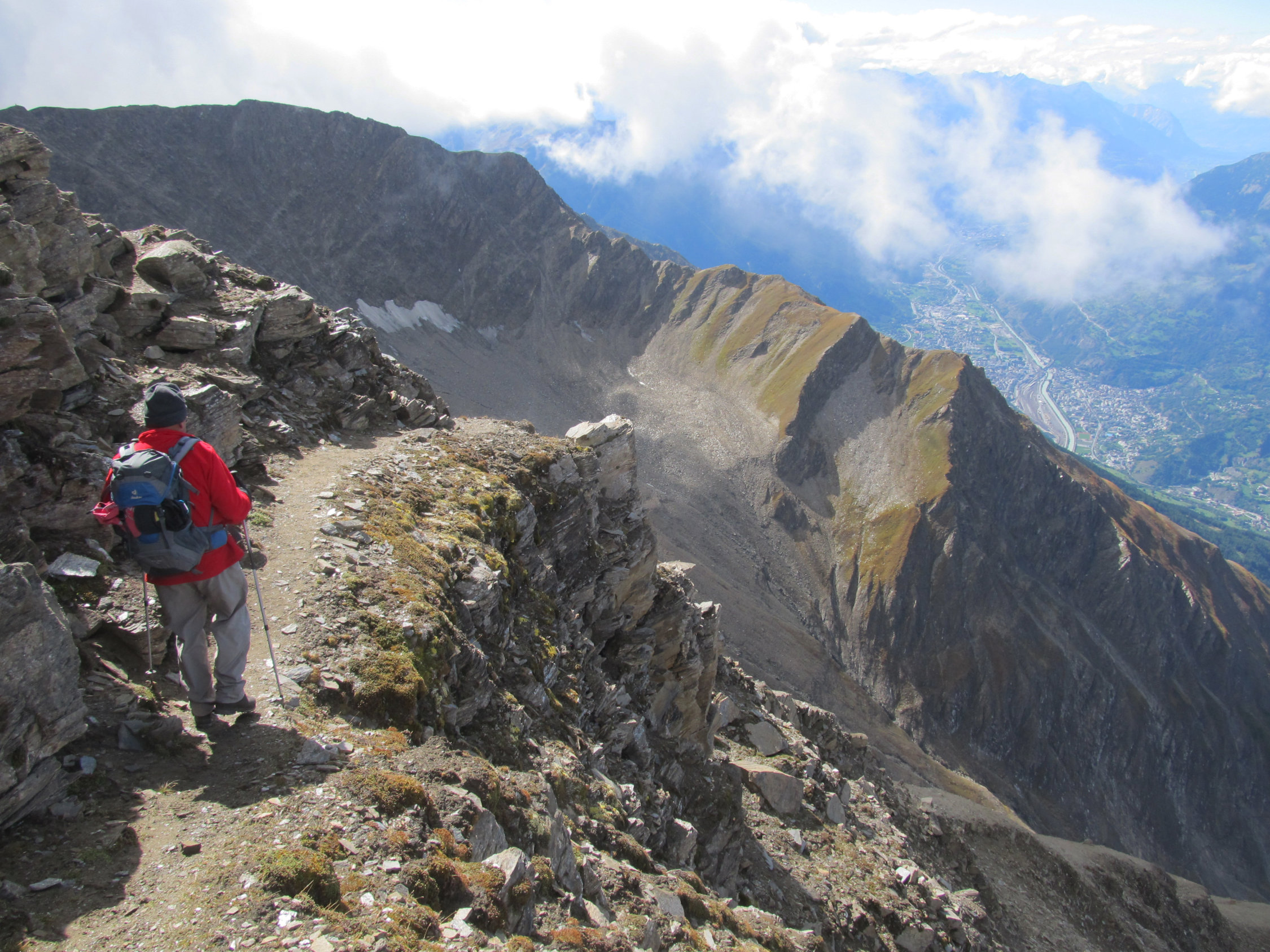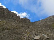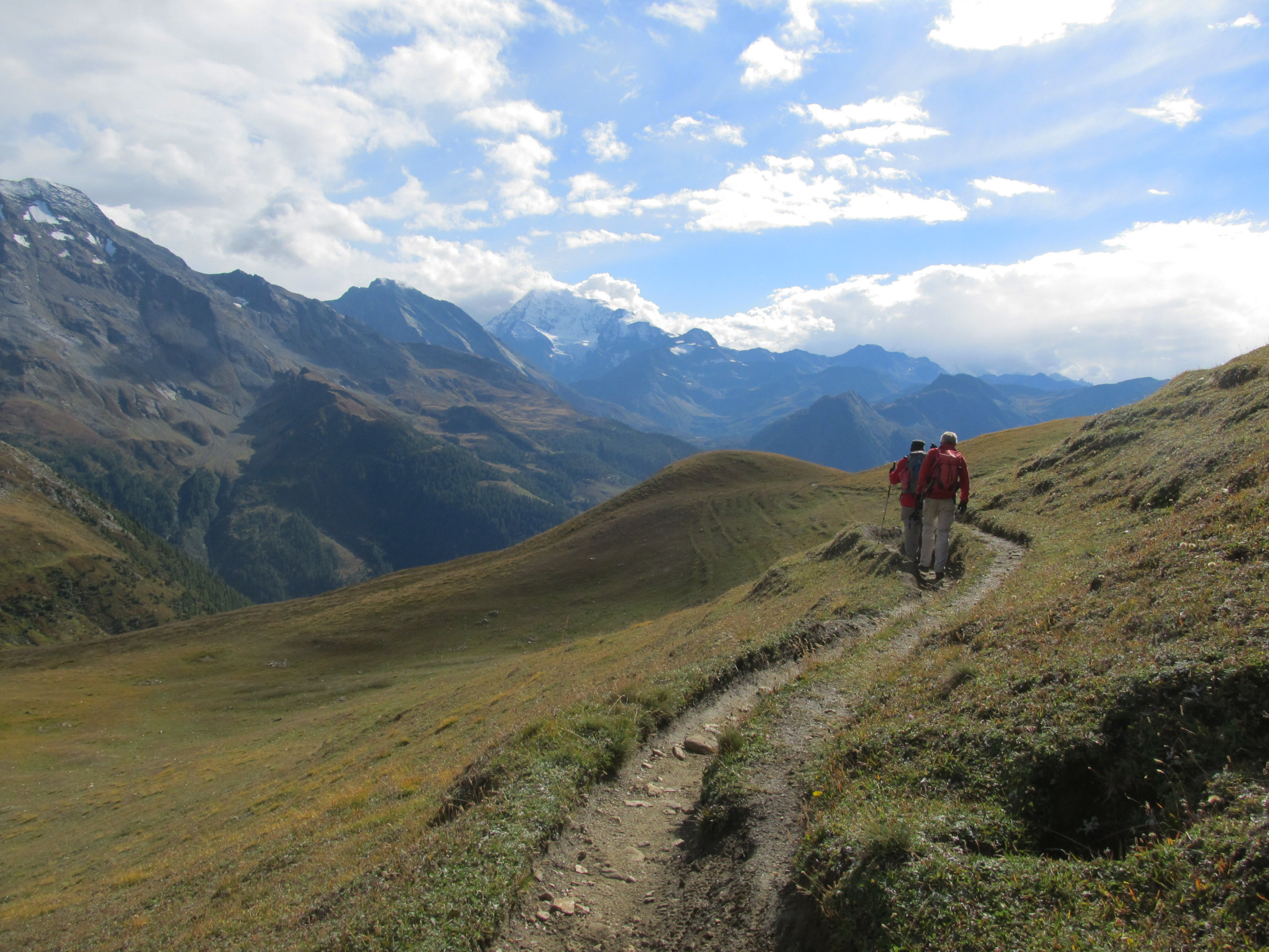 Rosswald - Saflischpass Ab der Bergbahnsation 1819 m auf ausgeschildertem WW zum Saflischpass 2563m. Ab der Passhöhe den Spuren im Südosthang auf fast gleicher Höhe folgen bis Ende Felsen. Weiter in der Mulde aufsteigen, Spuren und vereinzelt Steinmänner weisen den stets steileren Anstieg. Zuletzt über den Grat mit absteigender (Kraxelstufe) oder nordseitig auf recht breiter Rampe zum Gipfelkreuz. Abstieg wie Aufstieg.