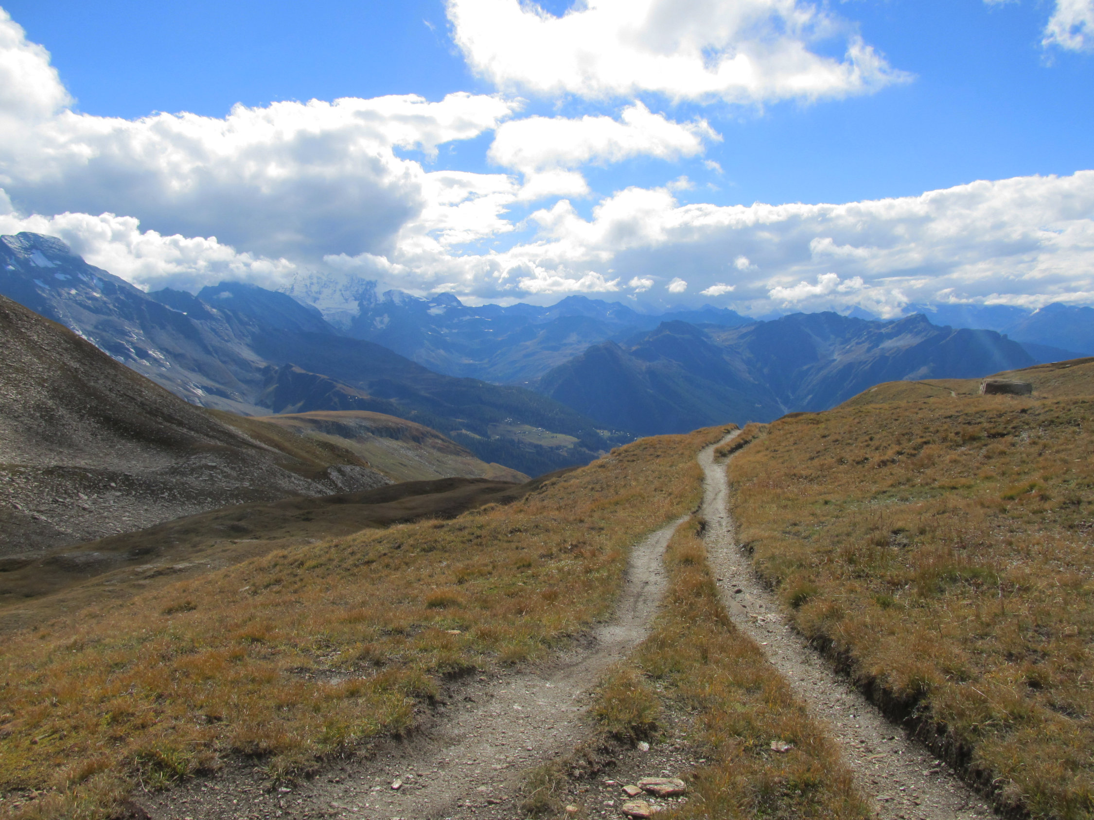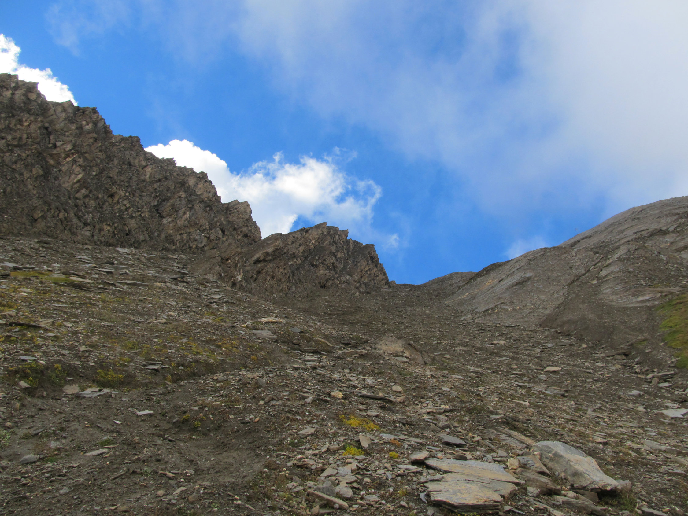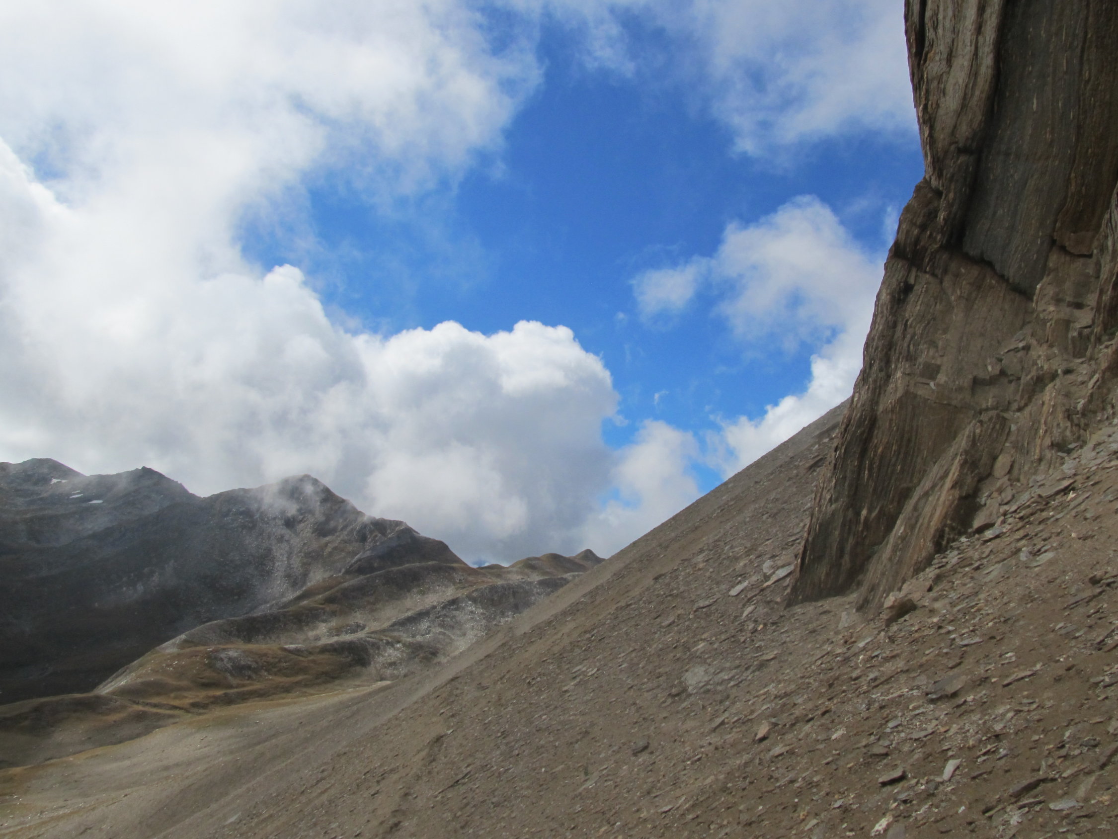 Bis zum Saflischpass zieht sich der Weg, eine gute Gelegenheit, sich auszutauschen. Ab dem Pass wird's interessant. Auf der Pfadspur, welche höhebehaltend unterhalb der Felsen weiterleitet, wähnt man sich in einer Dünenlandschaft. Feinster Sand liegt auf den gleichmässigen Hängen, speziell und faszinierend. In der Mulde unterhalb dem Bättlihorn ist es gerölliger und die Spuren sind nicht allzu deutlich. Steinmänner weisen den Weg und schliesslich erblickt man das Gipfelkreuz. Im sandigen steilen Schlussanstieg ist der Pfad gut und deutlich.