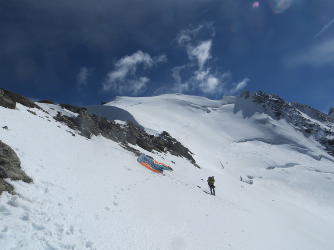 Ohne Steigeisen bis Übergang auf Grüebugletscher (3520m). Grüebugletscher im mittleren Teil recht offen, Spalten schlecht gedeckt (Vorgänger - gestern? - haben min. 2 mal Beinbaumel in Spalte erlebt...). Mit Windeinfluss bis zu 30cm, aber global 5cm auf Firn bis Gipfel - gut zu gehen! Bei anhaltender Bise am Gipfel sind wir schlussendlich auf 3770m windgeschützt mit Gleitschirm in Mini-Thermik gestartet. Schöner Flug bis Ortseingang Visp! :-)