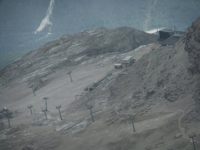 Ab der Senke hinter dem Felsenfenster kam leichter Regen, dann Schneeschauer auf. Zu dem gesellte sich dann auch noch ein Gewitter oberhalb der Lawinenverbauungen. Als das Stahlseil anfing zu „surren“, faßte ich dieses nicht mehr an und beeilte mich ungesichert über das unschwierige Gelände zur Bergstation.