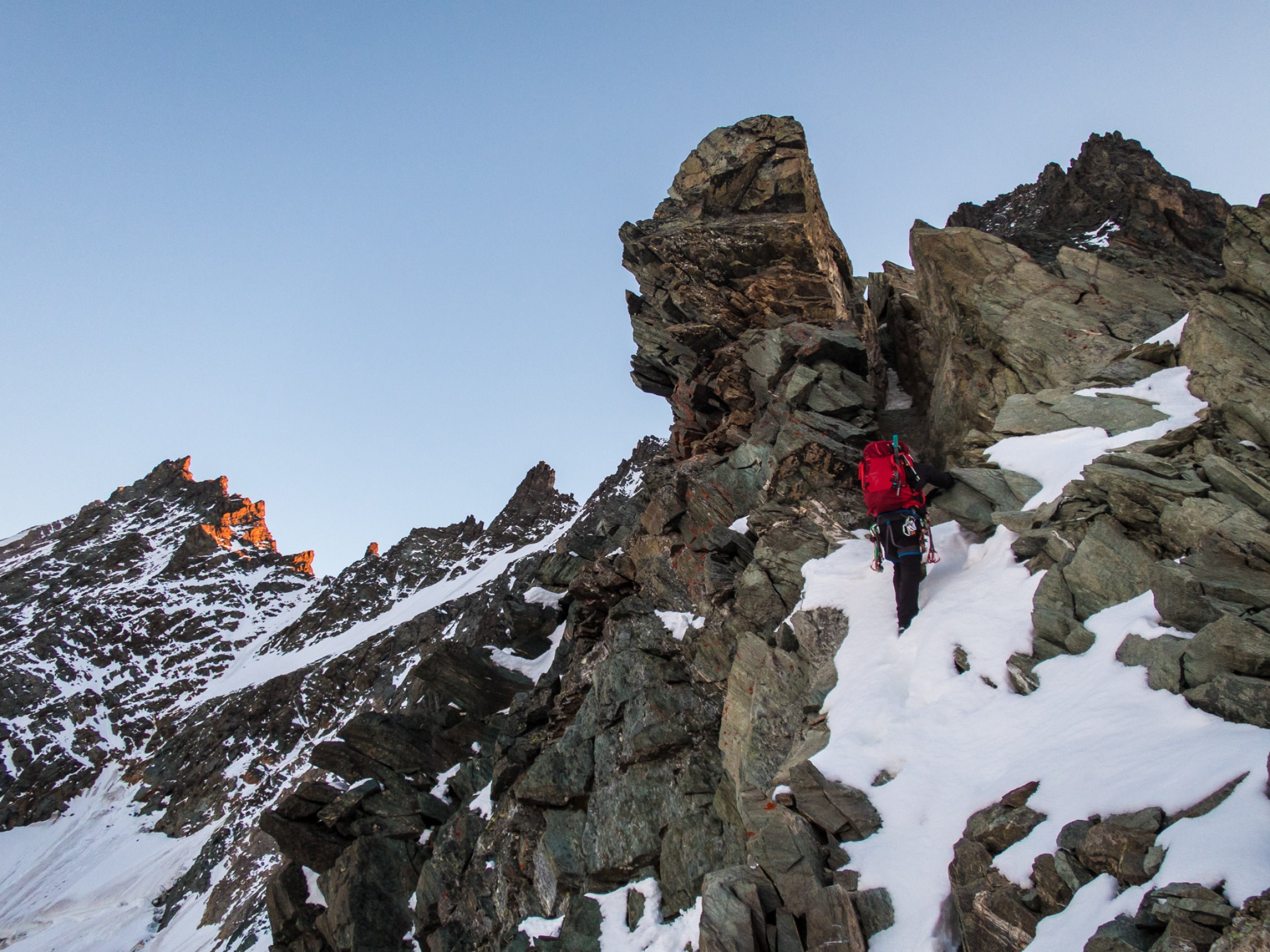 Sehr gute Verhältnisse. Schnee auf dem Grat aber nur an zwei Stellen (Plattenaufschwünge) etwas unangenehm, da die Griffe verdeckt waren.