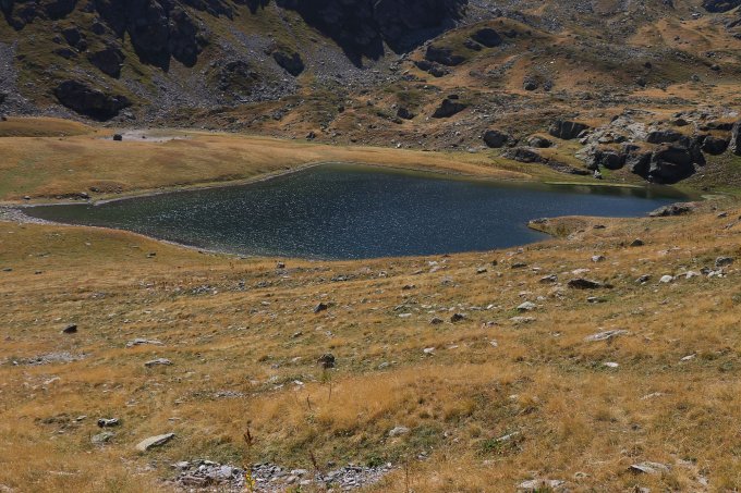 Auf einem gut sichtbaren Pfad querten wir die Bristavec Ostflanke nach links oben bis wir bei P.2195m die Geländekante erreichten und auf die Südflanke wechselten. Nun waren nicht mehr so deutliche Spuren zu sehen. Wir traversierten non immer etwa auf gleicher Höhe die Südflanke und passierten dabei hoch am malerischen Bergsee Crno Ezero vorbei ins dahinter liegende Tälchen. Nun trafen wir wieder auf Wegzeichen. Wir folgten nun den rotweissen Markierungen immer etwa im Talgrund bergauf bis wie schliesslich zum ausgetrockneten namenlosen Bergsee P.2427m gelangten. Auf der anderen Seite des Sees trafen wir wieder auf einen klaren Pfad der in ein Sättelchen hochführt wo auch die Grenze zum Kosovo überschritten wird. Hier rasteten wir nochmals und ich zog mir wieder meine Schuhe an. Für den Schlussaufstieg deponierte ich meinen Rucksack und nahm nur etwas zum Trinken mit. Auf kosovarischem Territorium wanderten wir nun weglos die Rudoka-Ostflanke querend hinauf und erreichten so den Südwestgrat. Der breite Grat leitet mässig steil direkt zum Gipfel. Den höchsten Punkt mit dem Grenzstein sahen wir allerdings erst auf den letzten Meter. Müde, durstig und ungewohnt abgekämpft erreichte ich den Gipfel. Dennoch, die Tour war wunderschön und die Landschaft entschädigt alle Strapazen.