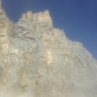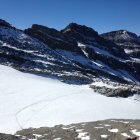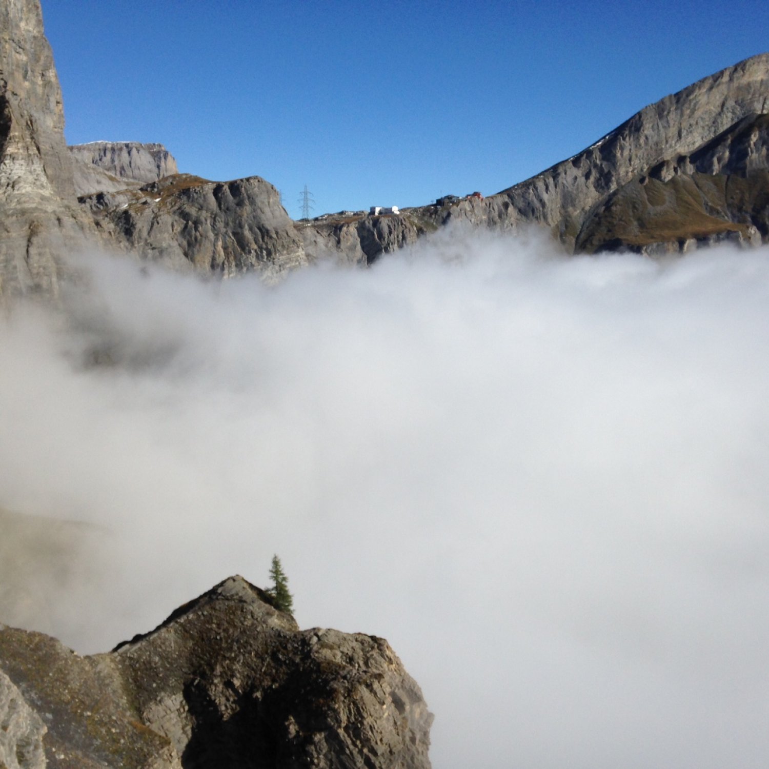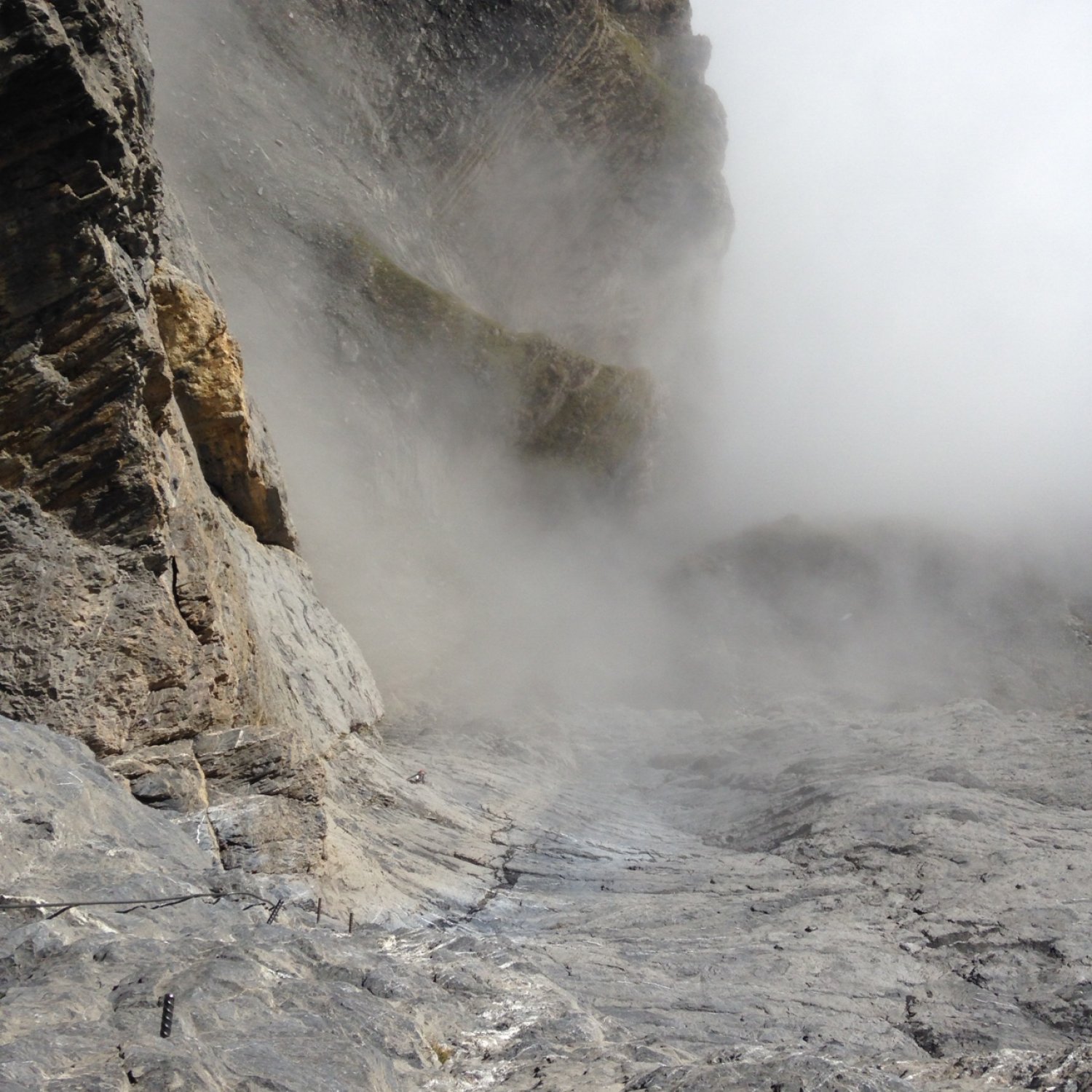 Es herrschen wieder sehr gute Bedingungen. Heute war zwar im ersten Teil Nebel, doch Fels und Eisen blieben trocken. Einzig der Zustieg stellenweise etwas feucht. Ueber dem Nebel zeigte sich der ‚Indian Summer‘ mit zeitweilig leichter Bise, doch meist geschützt. In der Höhle war die einfache Variante nass, die kräfteraubendere Variante jedoch trocken. Im Aufstieg kein Schnee, einzige Ausnahme eine kurze Passage mit gutem Trittschnee am Anfang der Querung zu den Ausstiegs-Leitern. Auch der nordseitige Abstieg geht sehr gut, dem wenigen Schnee kann man gut ausweichen. Der Schnee auf dem kleinen Gletscher weist eine gute Spur auf und ist angenehm zu gehen. Der Klettersteig ist gut unterhalten.