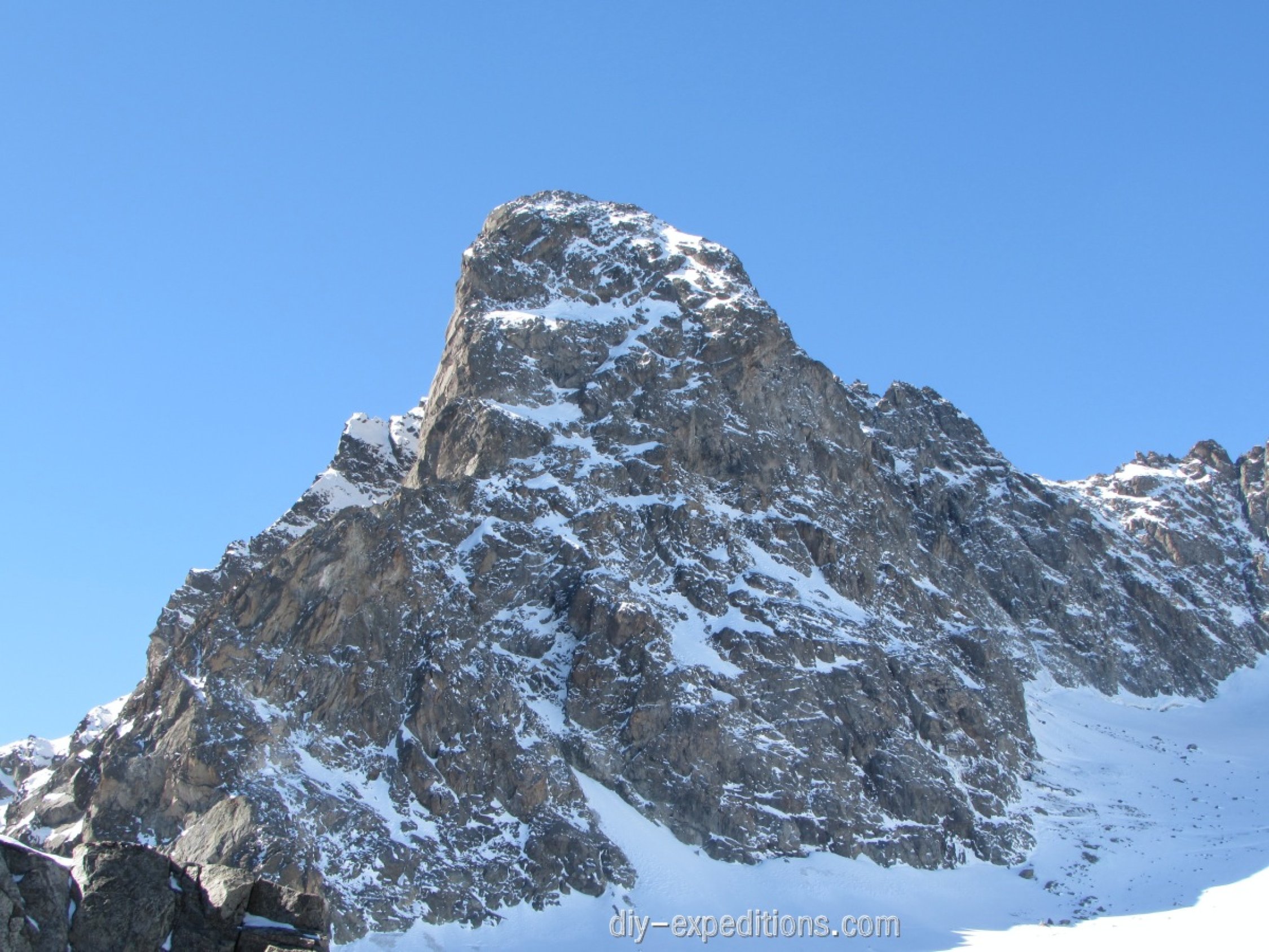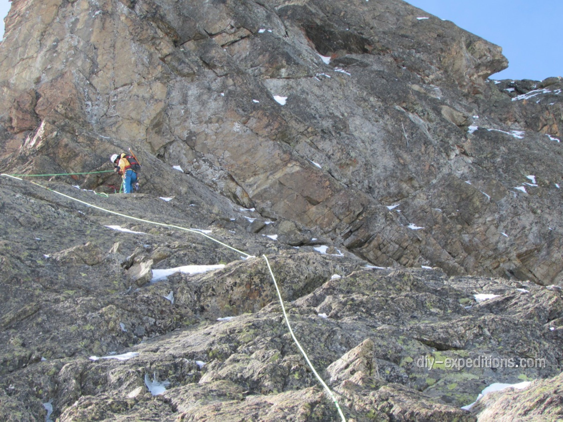 fallweise Schnee in den Couloirs und an manchen Flanken, hin und wieder feines Eis im Schatten, manche Stellen auch etwas feucht-rutschig; überwiegend aber trockener Fels