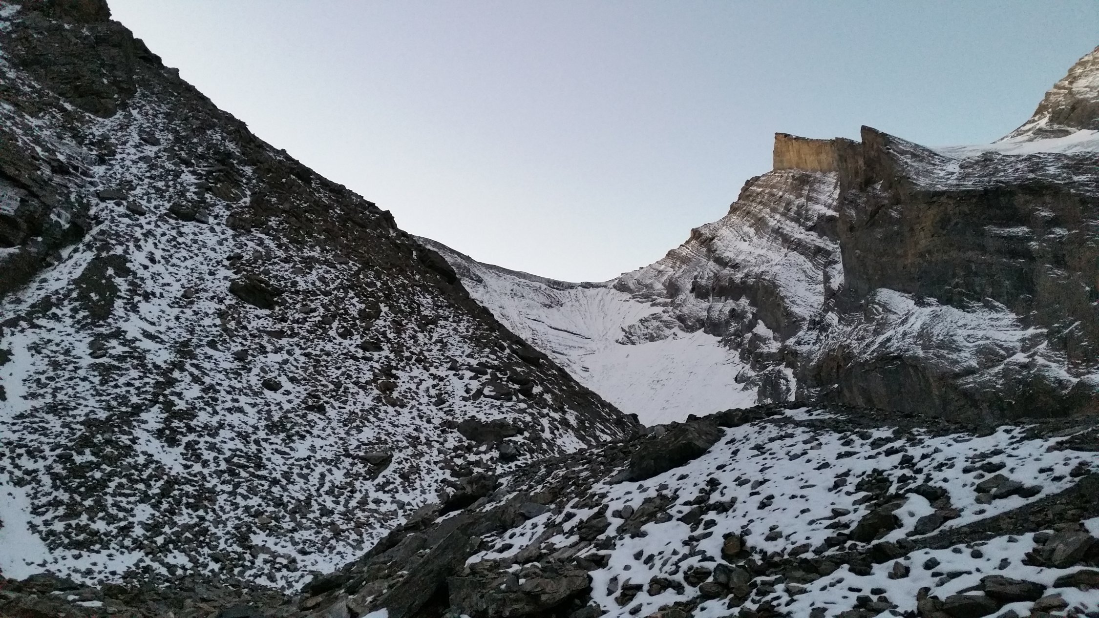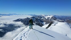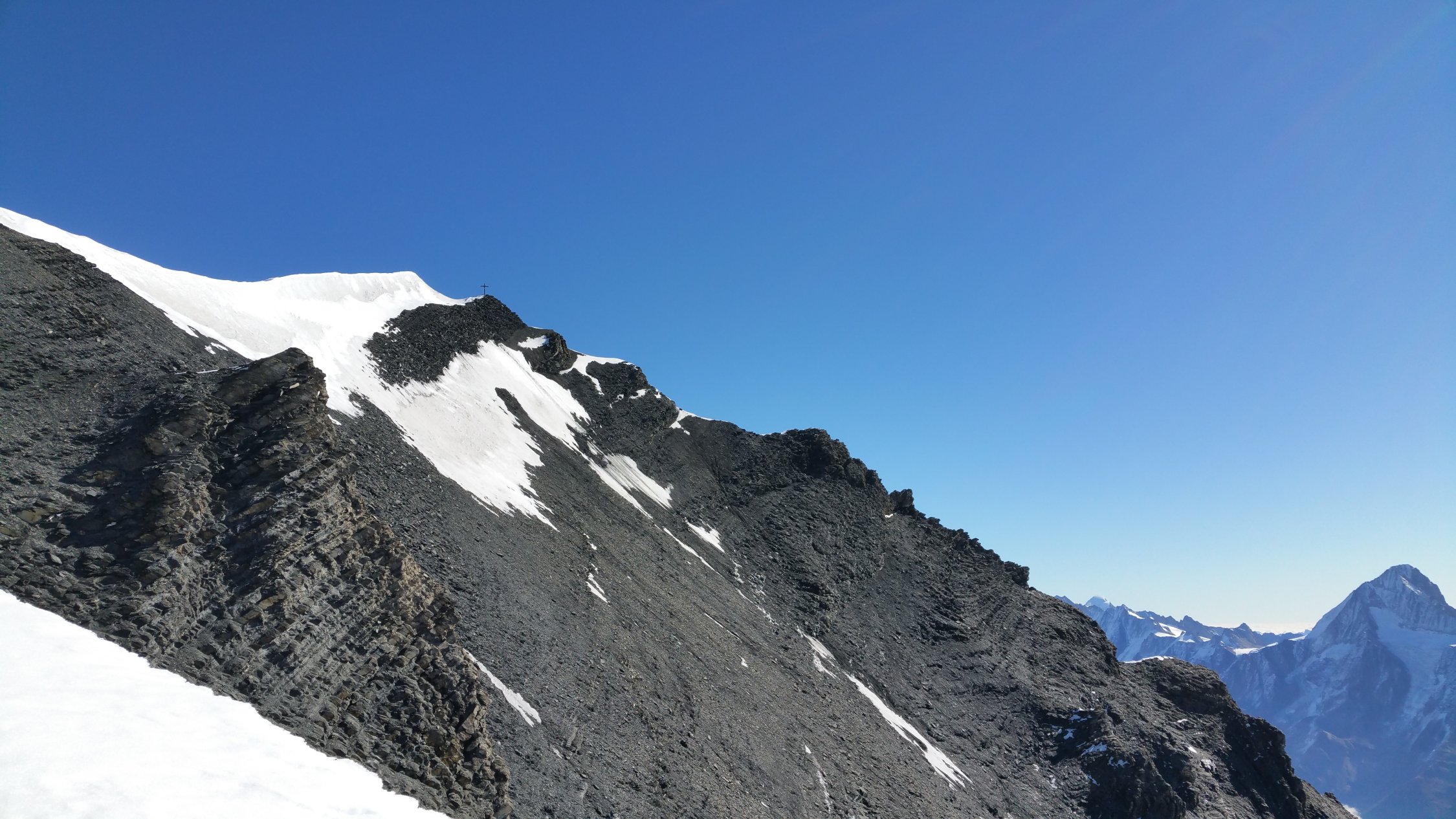 In den Vortagen gab es oberhalb von 2500m rund 20cm Neuschnee. Wo er nicht verweht wurde, hat er sich bereits leicht gesetzt. Schwarzgletscher und Firnfeld unter Vorgipfel daher in gutem Zustand. Zackengrat zur Hälfte schon wieder aper. Mulde zwischen Vorgipfel und Hauptgipfel gefüllt mit Triebschnee - Obacht auf Spalten.