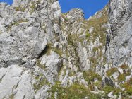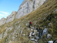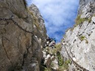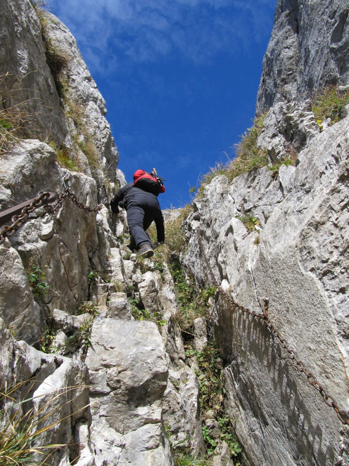 Die felsige Rinne bietet keinerlei Schwierigkeiten. Wo die abgerundeten, speckigen Felsen keine Griffe mehr bieten, sind Ketten vorhanden.