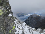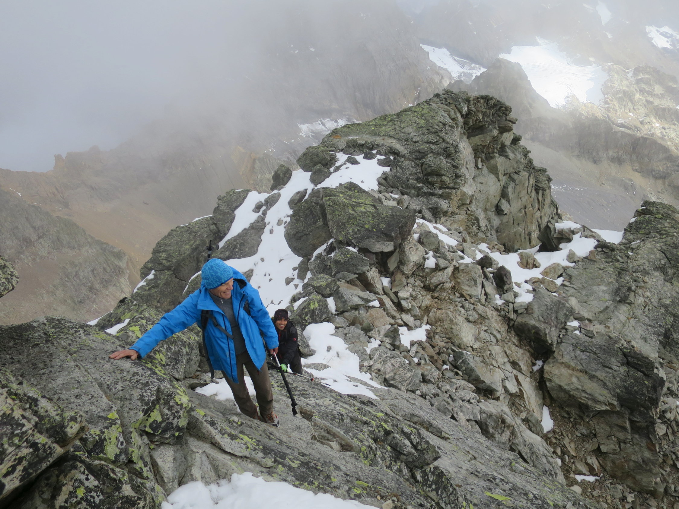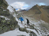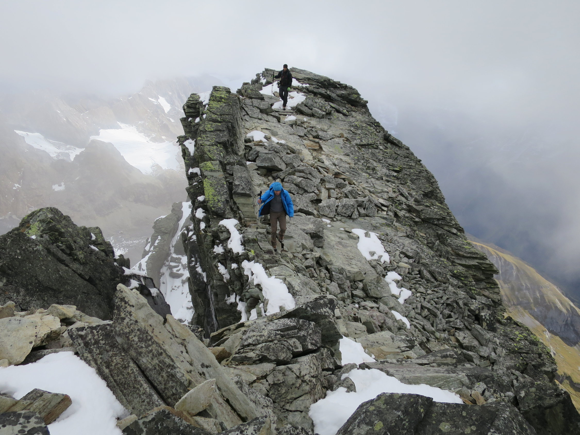 Der Ostgrat war schneebedeckt und rutschig, hier wären Steigeisen nicht fehl am Platz gewesen. Das schuttige Band welches südöstlich zum Kamin führt war fast aper und gut zu begehen. Durch eine Rippe auf groben Schotter unter den Gipfel, dann in leichter Kletterei über einen Turm auf den schmalen Gipfelgrat. Am Chli Windgällen kalt und windig, nur selten gab der Nebel einen vagen Tiefblick frei. Kein optimales Fotowetter heute. Abstieg dito Aufstieg. Der grossen Moräne entlang zum Unteren Furggeli. Es liegt schon recht viel Schnee im Furggeli, zum Glück sind die steilsten Stellen gut mit Drahtseilen gesichert. In der gemütlichen Windgällenhütte bei Kaffee und Kuchen aufgetankt. Auf dem rot/weiss markierten Wanderweg nach Golzern zurück.