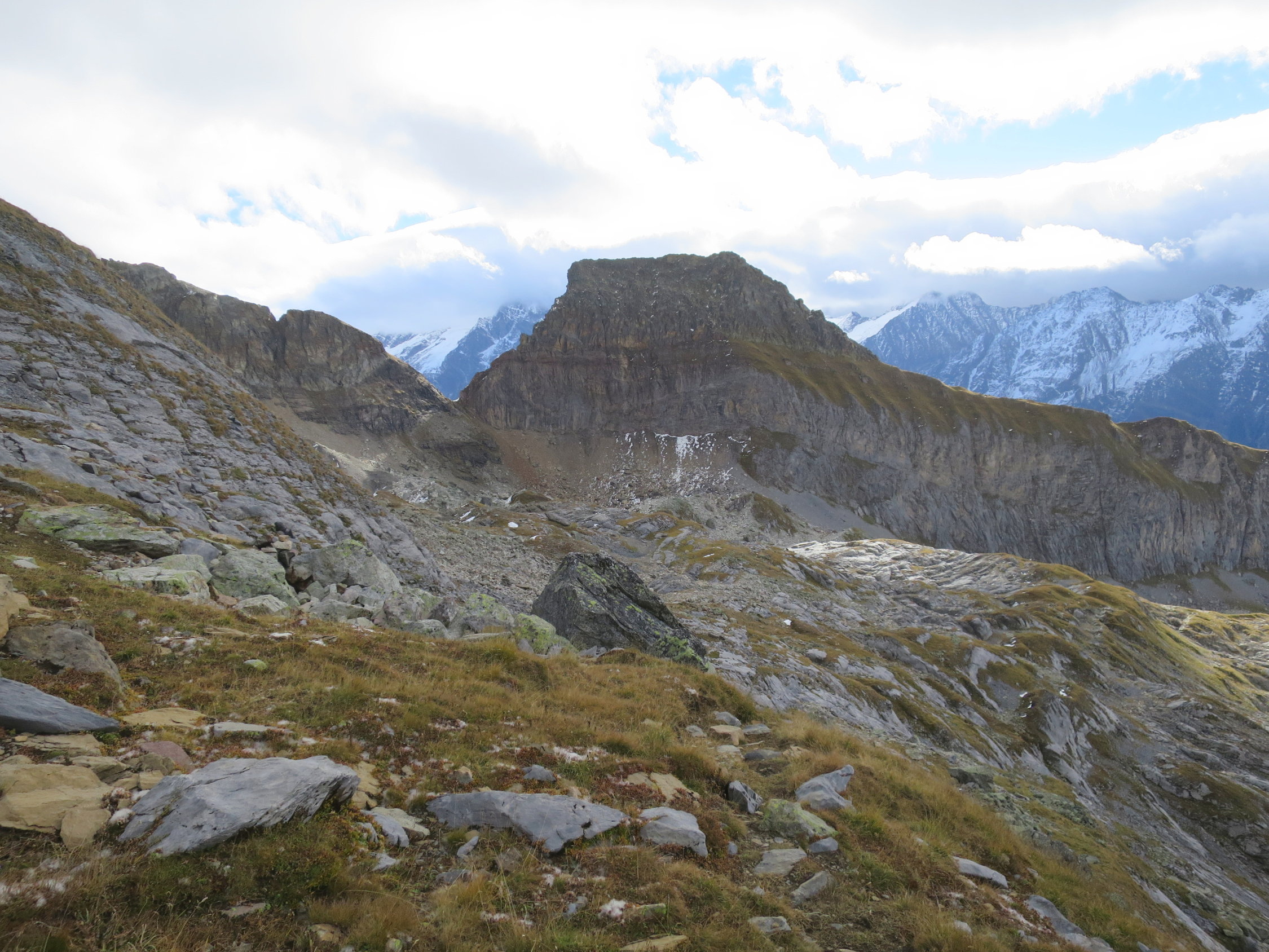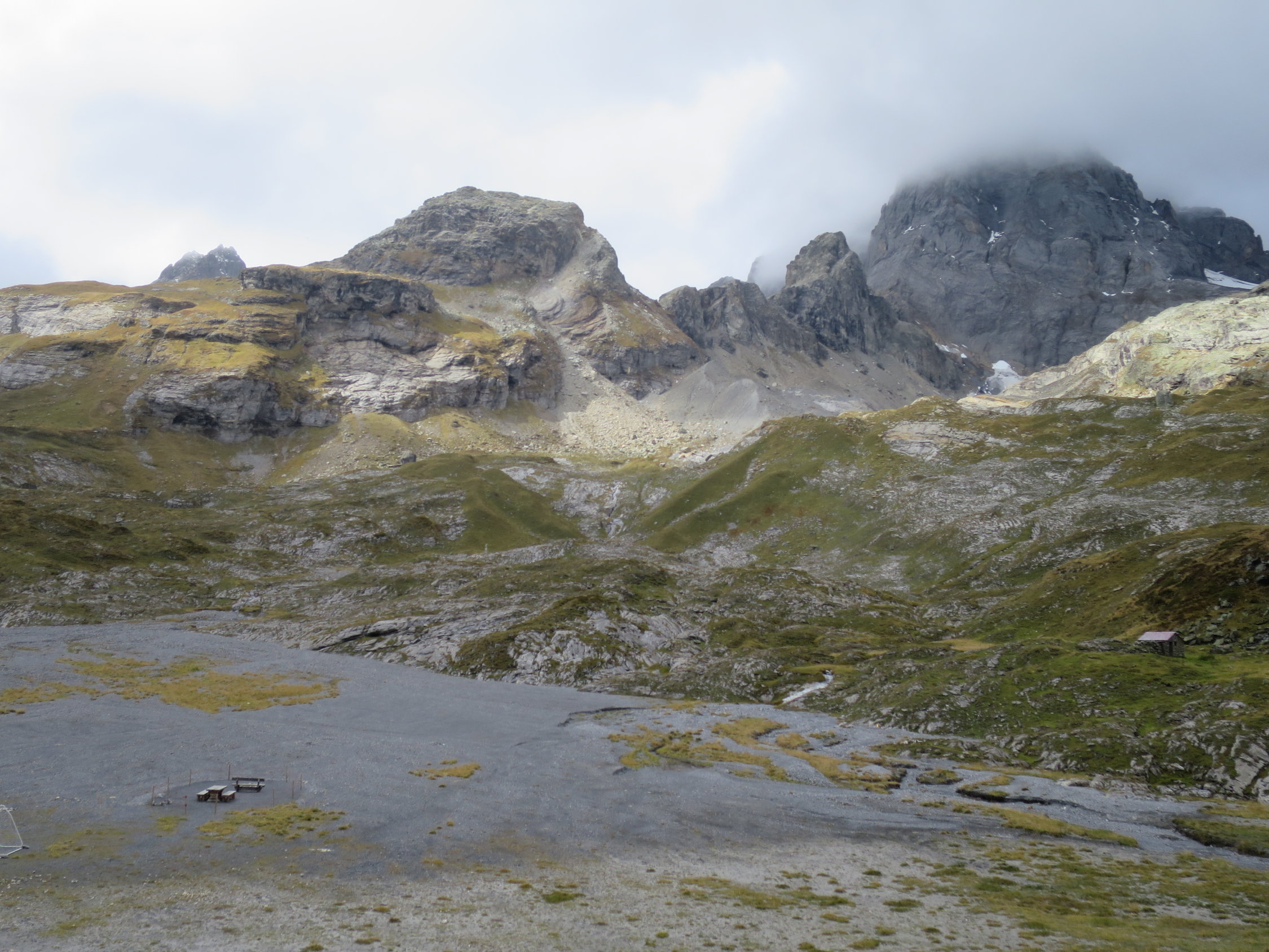 Mit der 07.30 Bahn von Bristen nach Golzern. Von Egg, westlich am Bockistock vorbei auf die Alp Oberchäseren. Weiter auf einem blau/weiss markierten Weglein Richtung Erzgrueben. Das Wetter verschlechterte sich zusehends, kalte Föhnböen mit herumvagabundierender Nebel. (Entsprach nicht ganz der Meteo Prognose) Unter den Erzgrueben links abgebogen und den Steinmandlis folgend unter die Ostflanke.