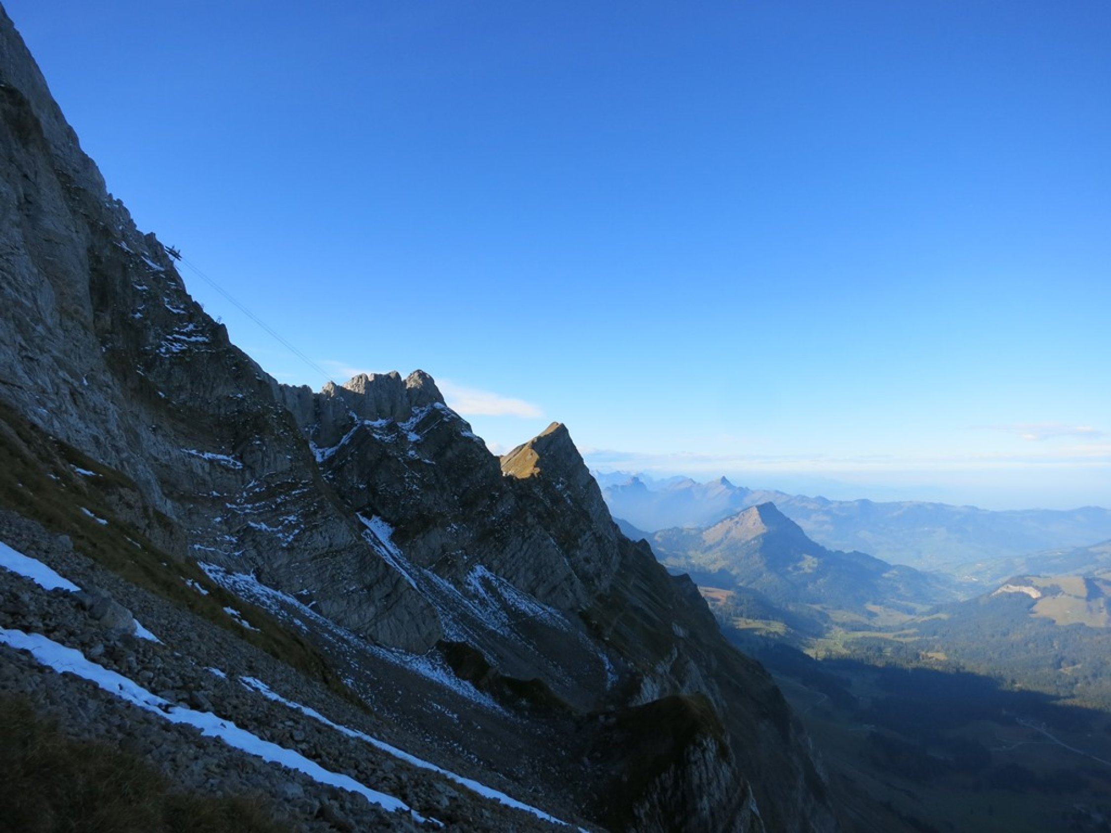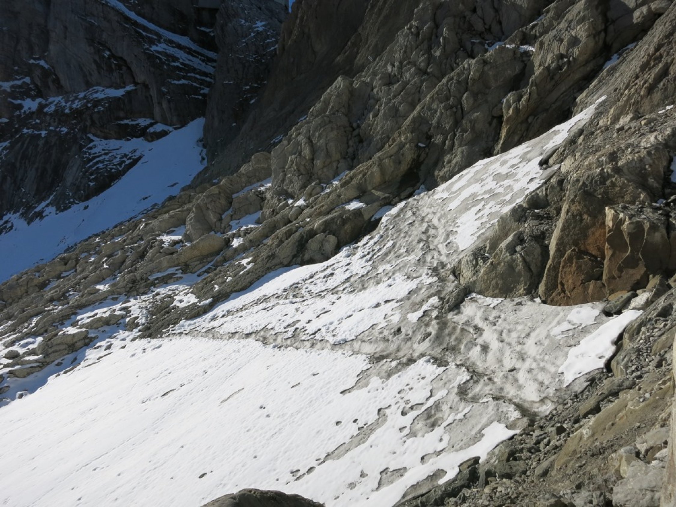 Chammhalden- sowie Nasenlöcher-Route von der Schneeschmelze teils matschig. Trittschnee teilweise auf eisiger Unterlage unterhalb der Gedenktafel an der Chammhalden, sowie vor dem Wändchen nach der Querung. Auch noch etwas Schnee bis zum Hüenerbergsattel; der hier aber weniger „gestört“ hat. Abstieg Nasenlöcher hatte weniger Schnee, aber recht matschig und somit rutschig. Himmelsleiter hat noch einiges an Eis drin…