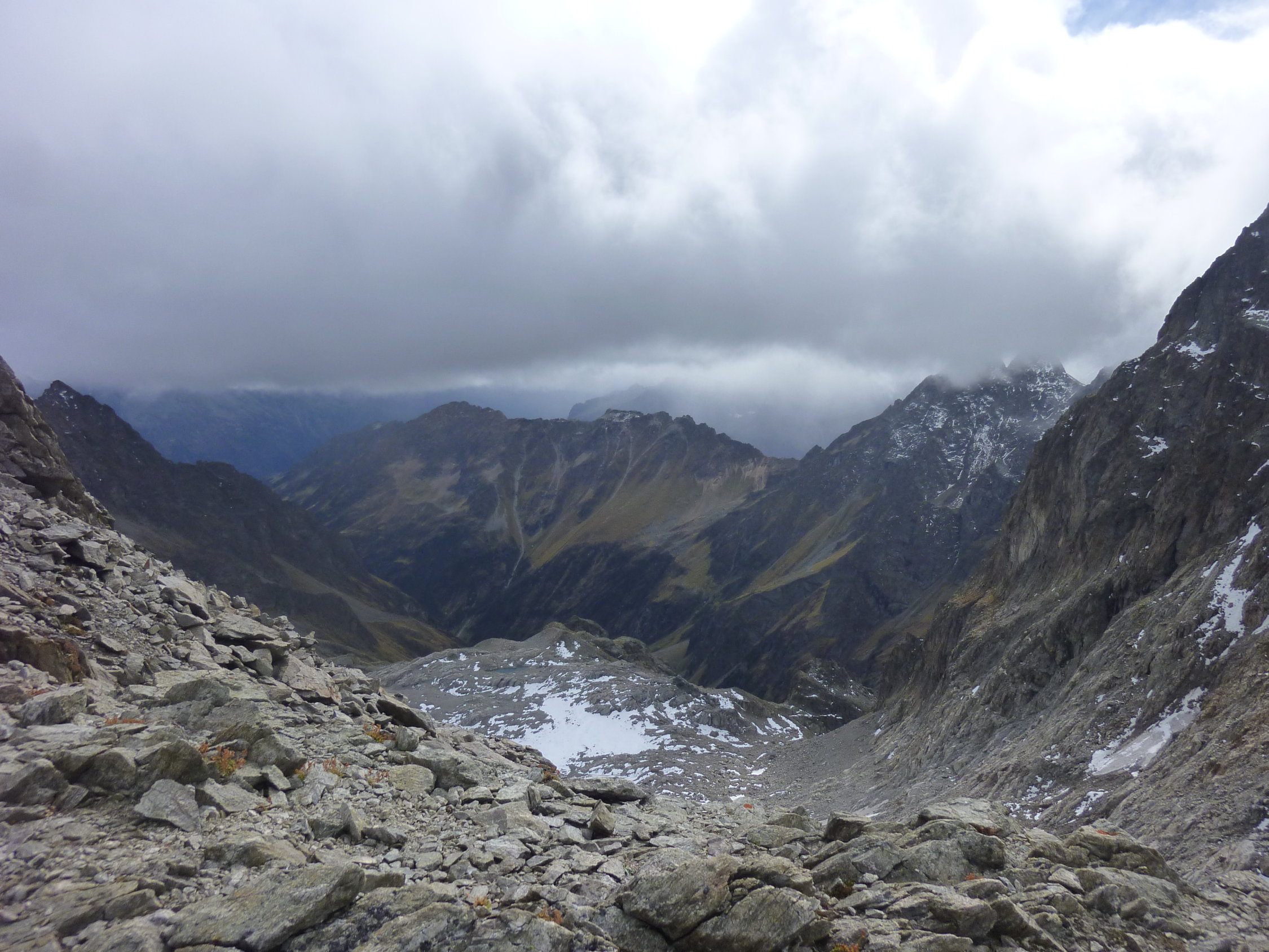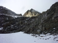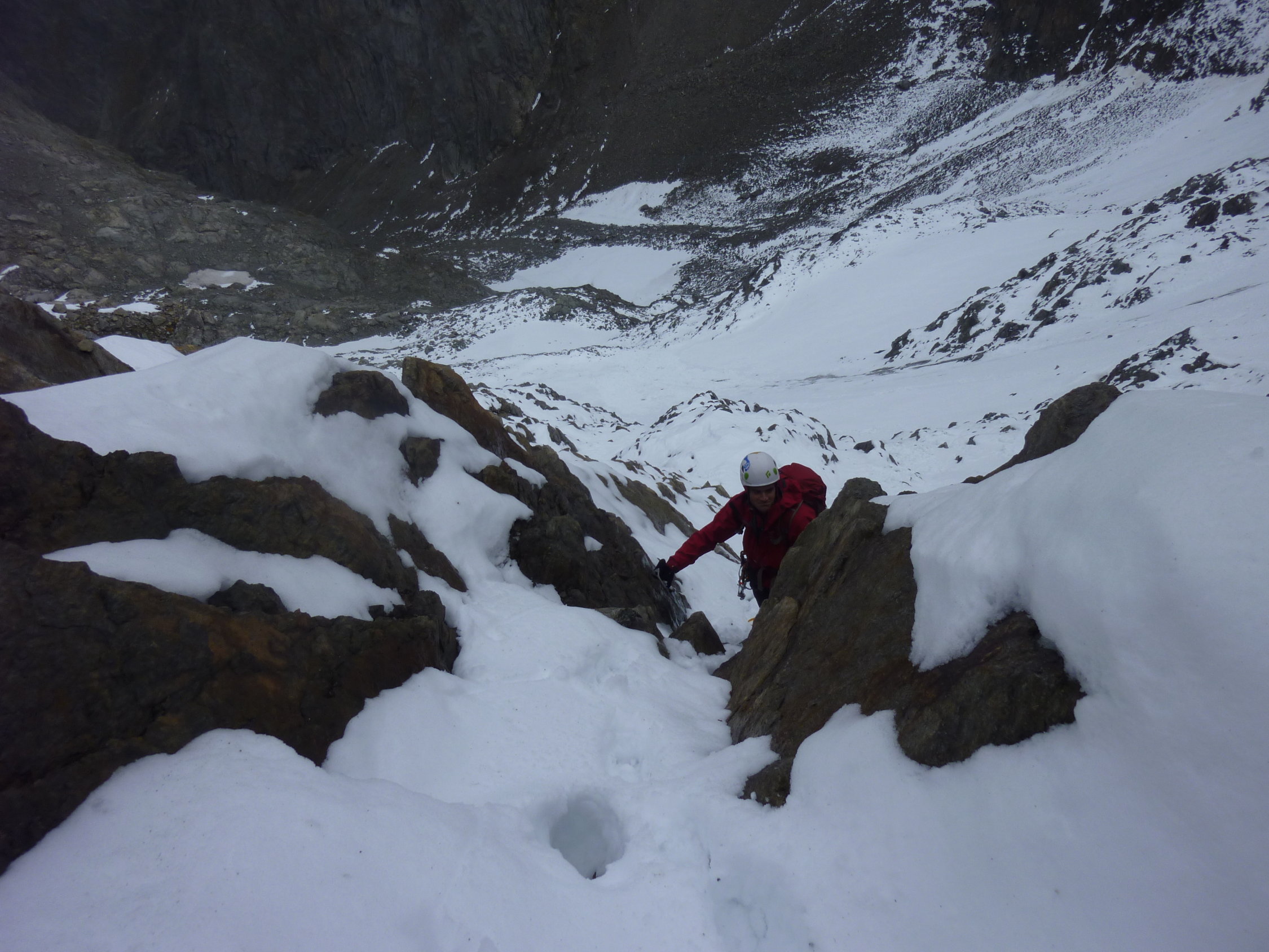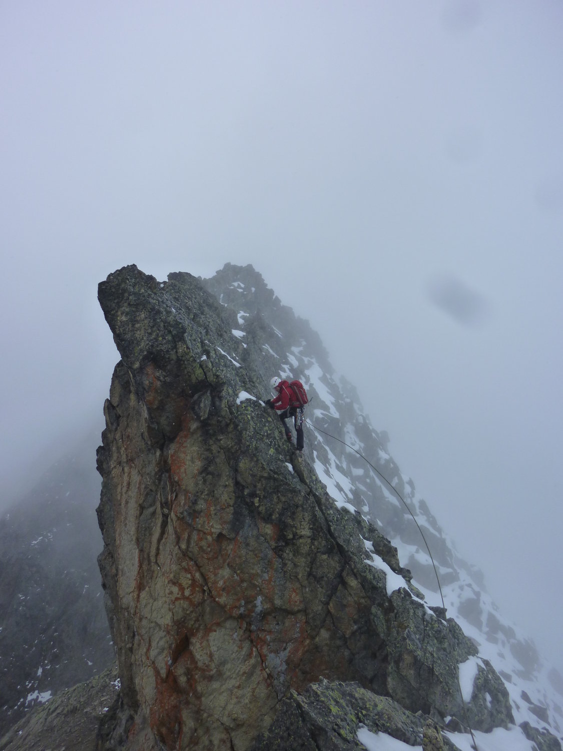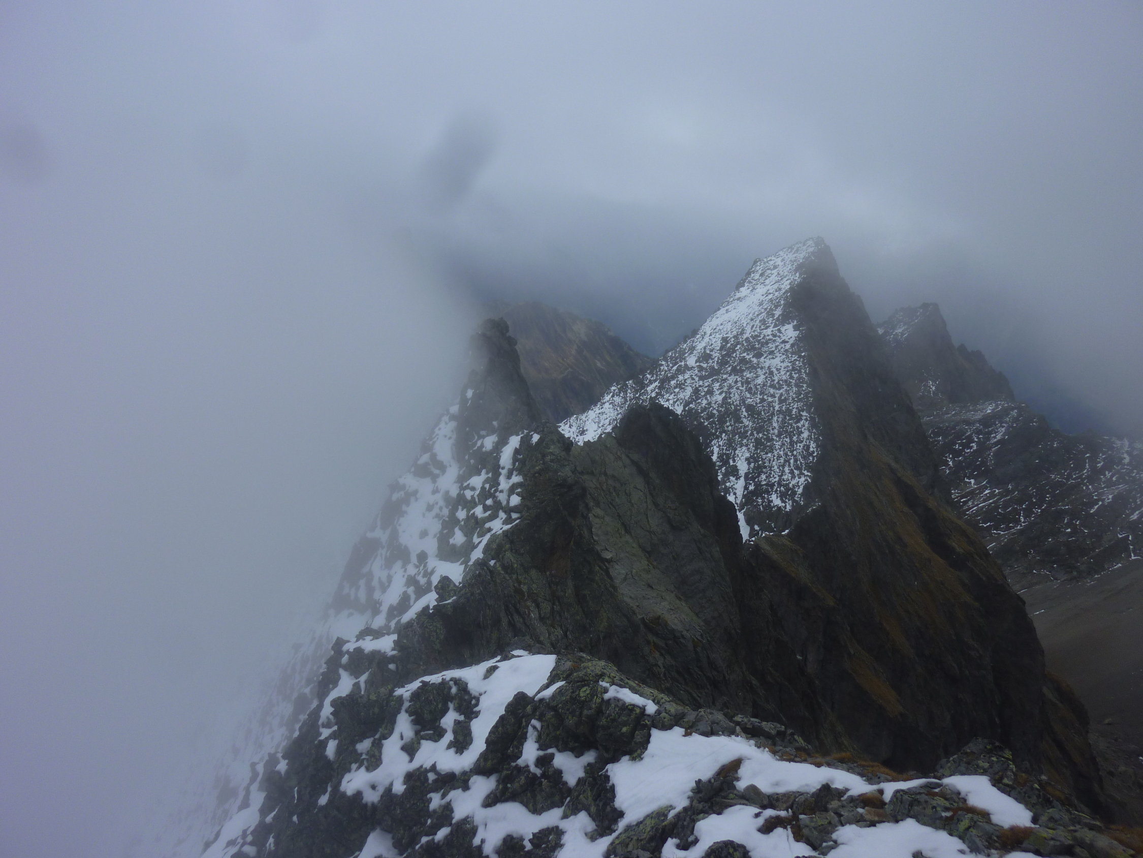 Die Saison neigt sich dem Ende zu. Der Fels auf der Südseite war trocken und schneefrei; auf der Nordseite hat es ab 2700m 10-15 cm Schnee. Der Zustieg in die Scharte ist dank dem Neuschnee machbar, hat jedoch zwei interessante Passagen mit leichter mixed-Kletterei. Die Kletterei ist gemütlich, der Fels solide und trocken. Gegen Ende des Grates dann mehr Schnee/Eis und unangenehm feucht-rutschig. Der Übergang in die Firnflanke auf der Nordseite war sehr abschreckend (ca. 15 cm Neuschnee auf Fels/Geröll), wir sind daher auf die brüchige/sandige Südseite ausgewichen. Hier liess sich die Flanke problemlos traversieren.